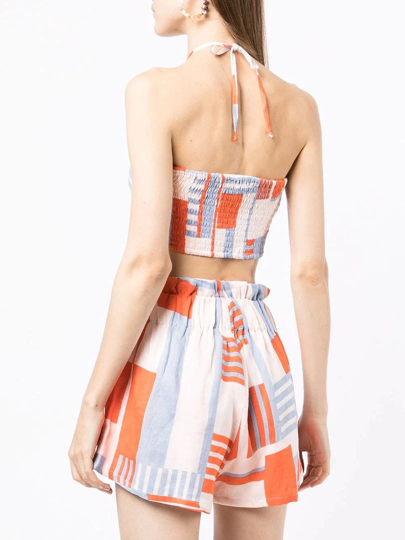 Faithfull The Brand ‘Cyprus’ halterneck bralette top featuring a sweetheart neckline with a halter neck tie fastening, a circular cut-out detail, a shirred back band, a multicoloured abstract print and pulls on. Item fits true to size. Model is wearing a size S.Â
