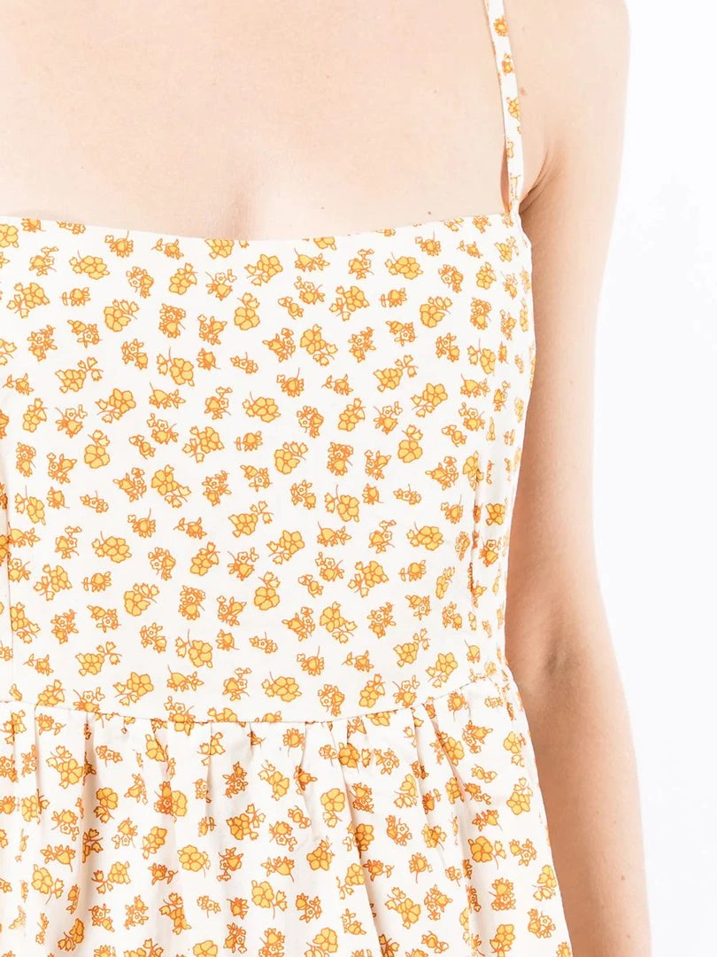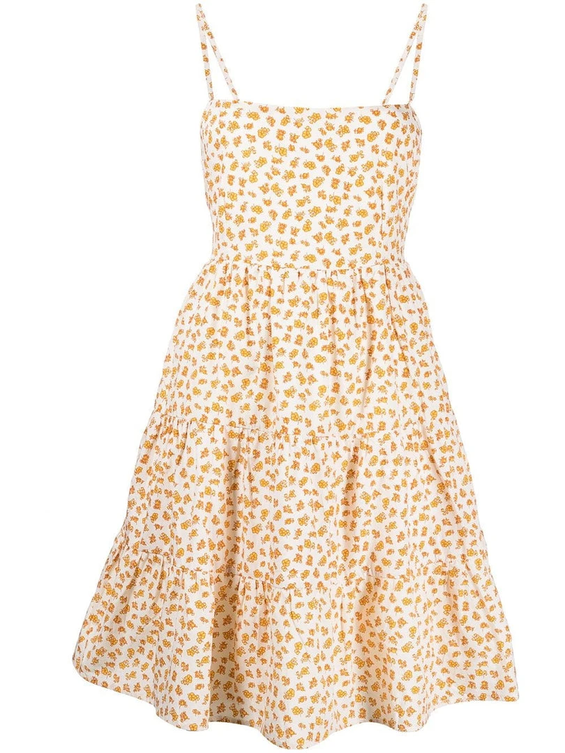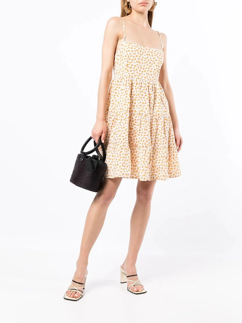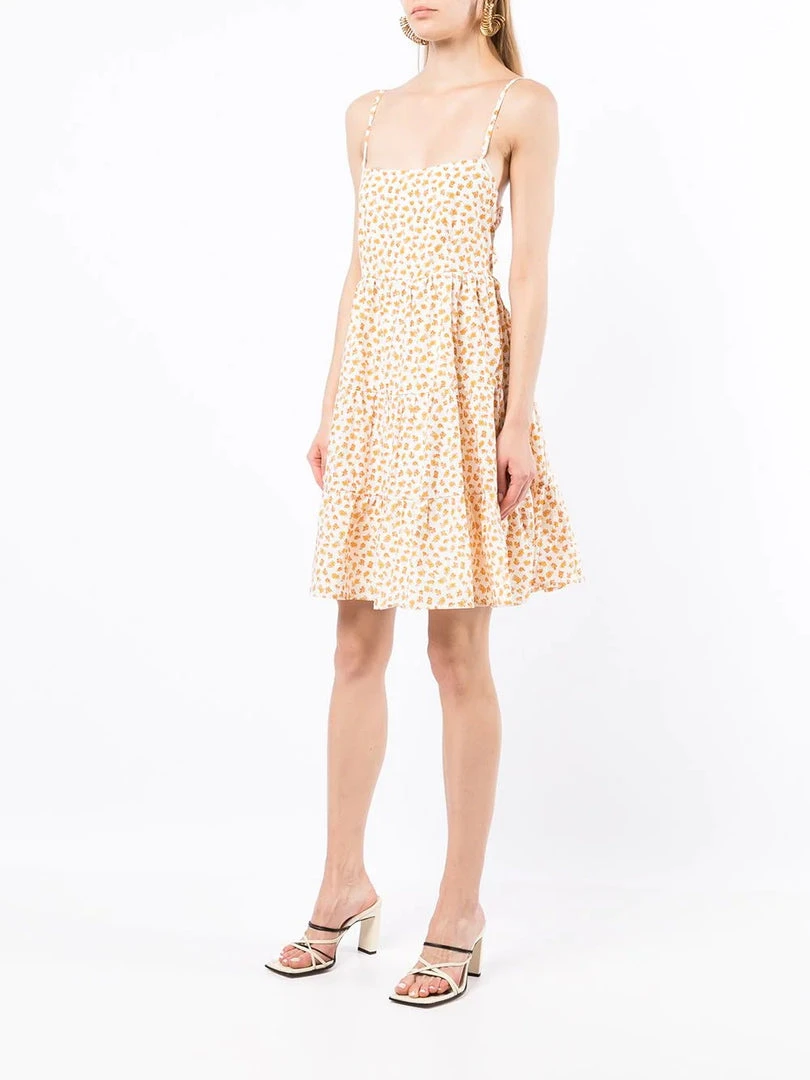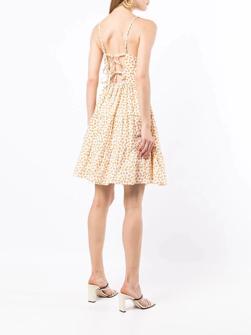 Faithfull The Brand cream ‘Cecelie’ floral motif mini dress featuring adjustable thin straps, back tie details, an elasticated back band, a high waist, a tiered skirt, a yellow floral motif print, a short length and pulls on. Item fits true to size. Model is wearing a size S.