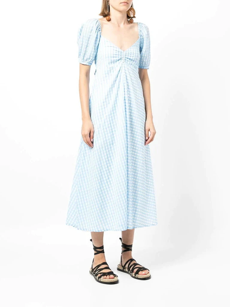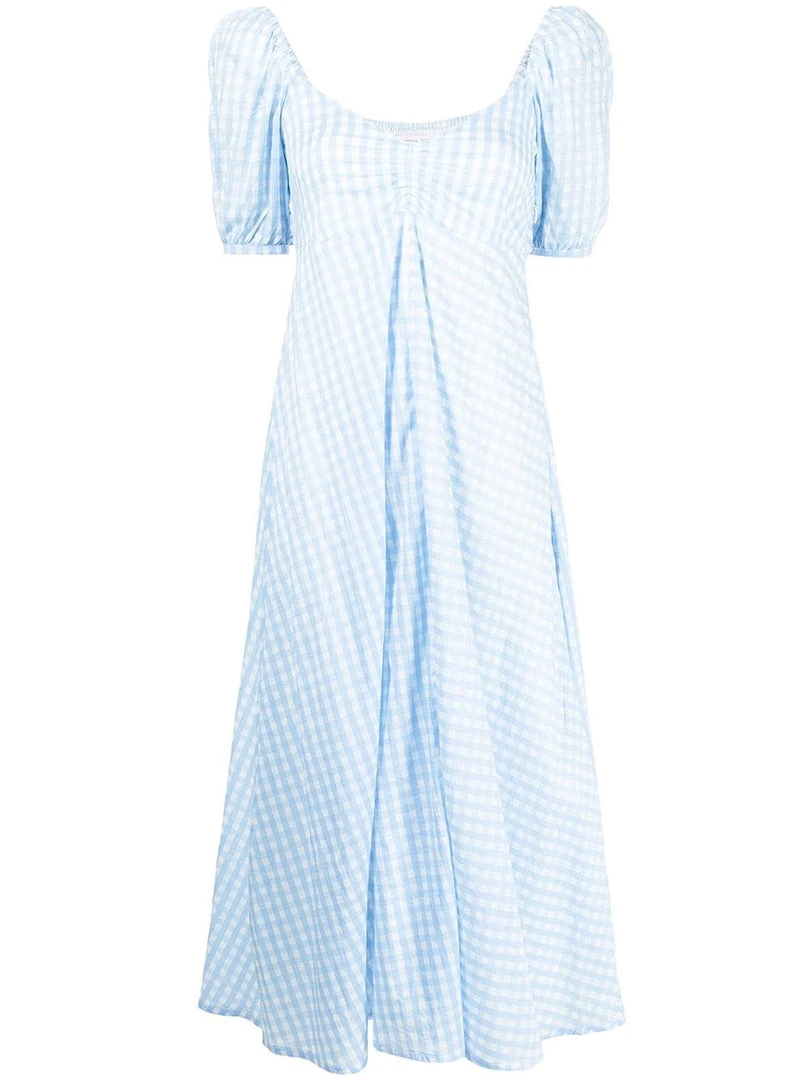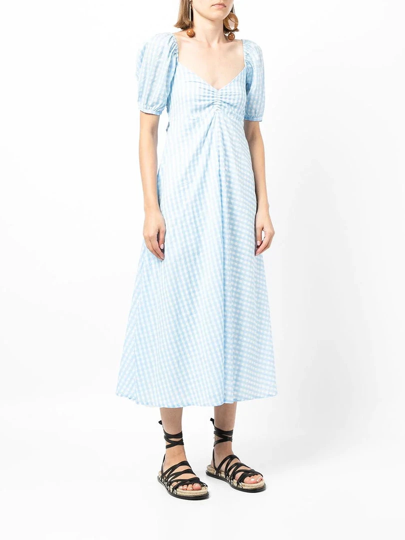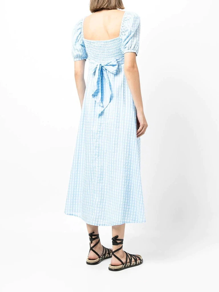 Faithfull The Brand ‘Charlize’ gingham midi dress featuring a V-neckline, elasticated shoulders, short sleeves, a gathered front detail, an empire waistline, a side zip fastening, a shirred back panel, a back bow detail, an A-line skirt, a blue and white gingham print and a midi length. Item fits true to size. Model is wearing a size S.Â