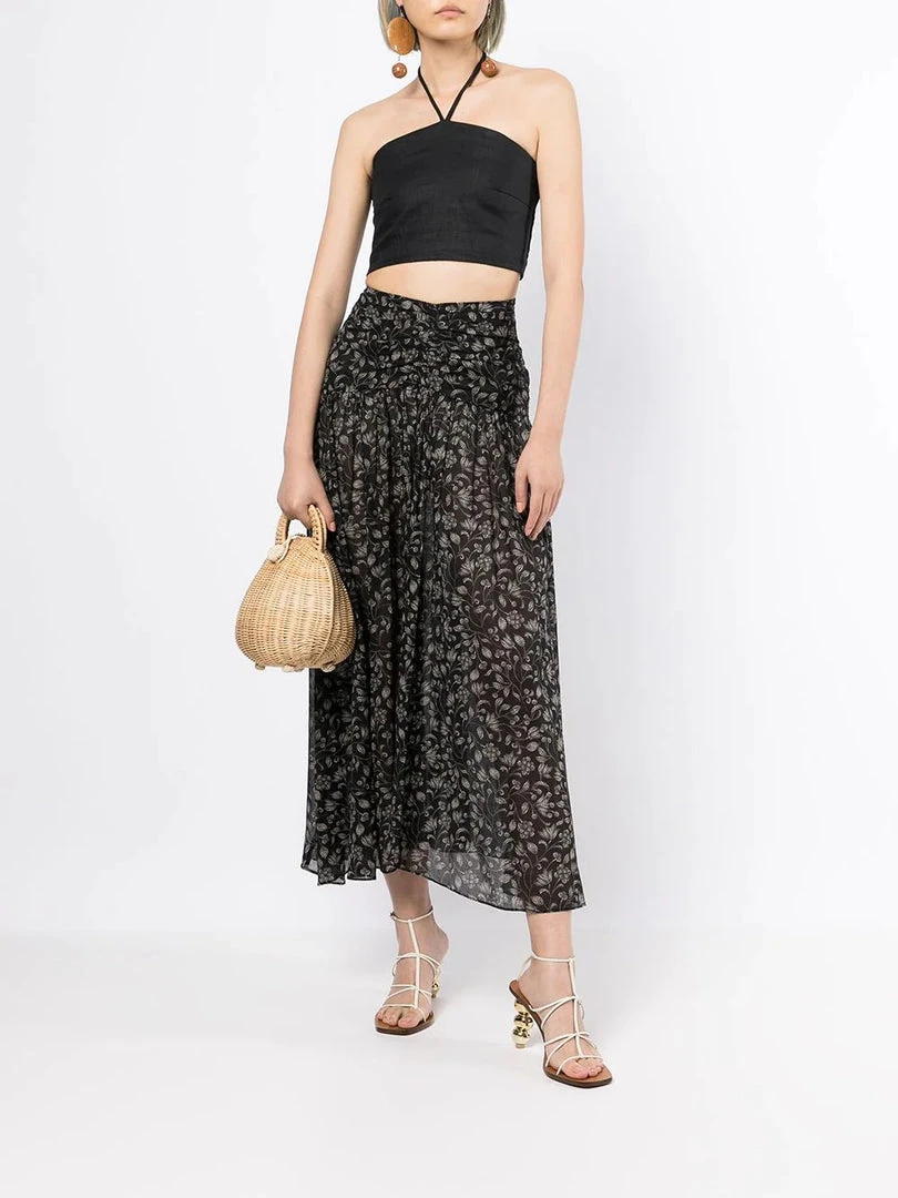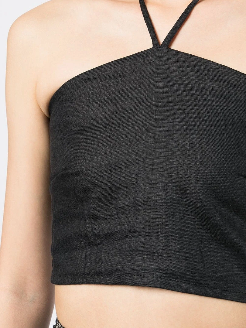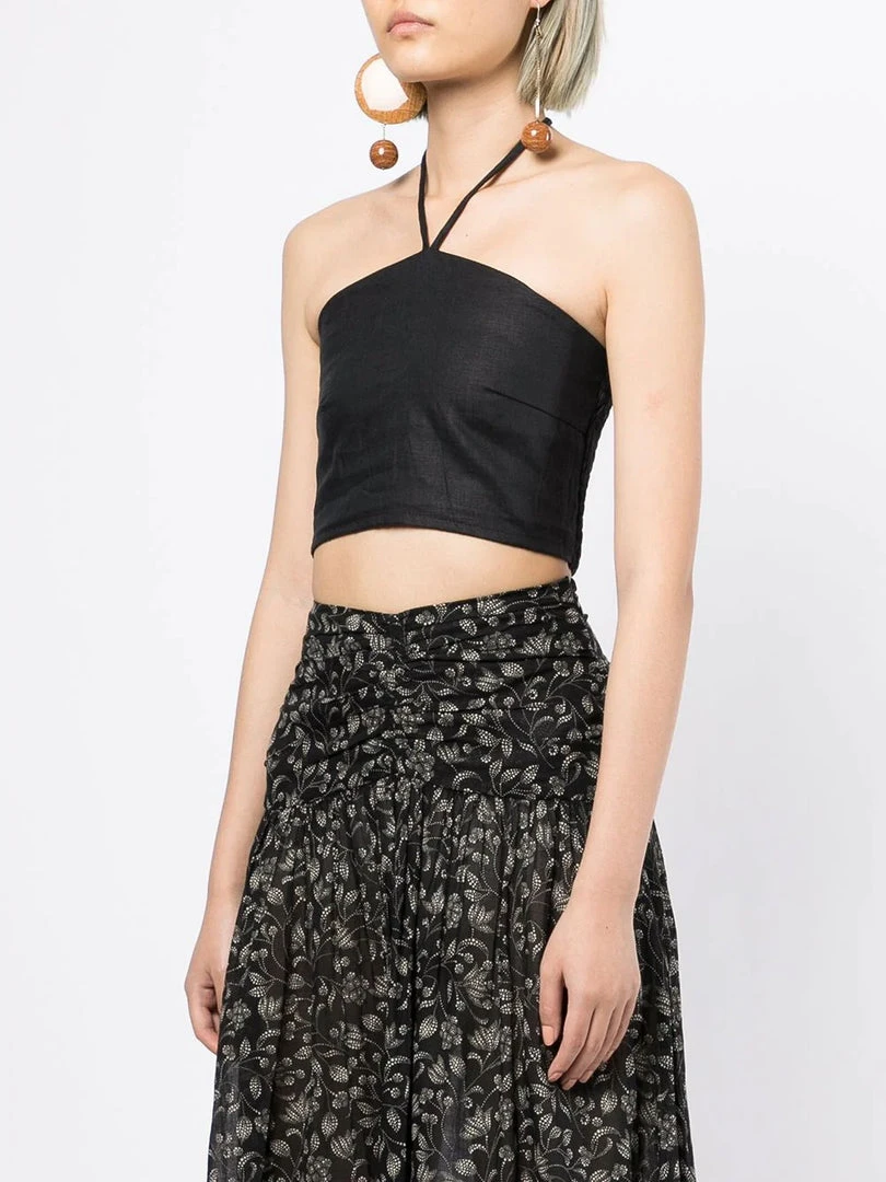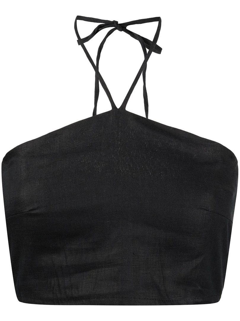 Faithfull The Brand black ‘Calipo’ halterneck crop top featuring a halter neck tie fastening, a shirred back band, a cropped style and pulls on. Item fits true to size. Model is wearing a size S.Â