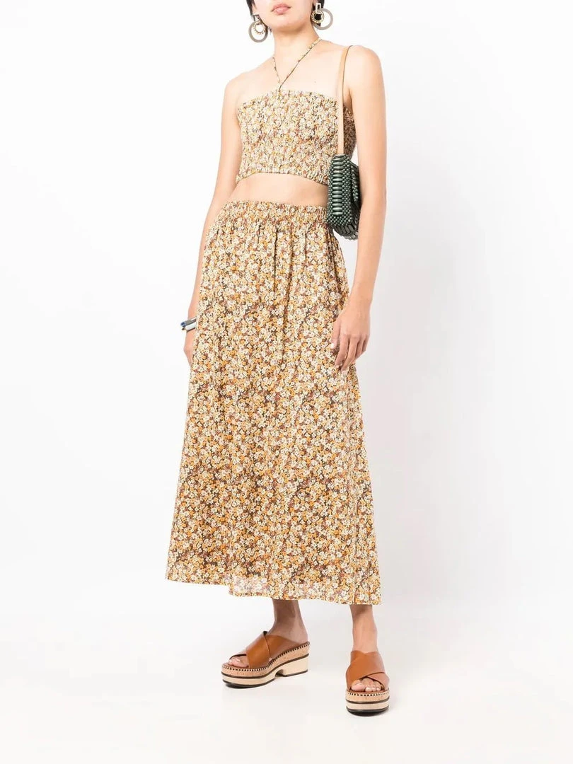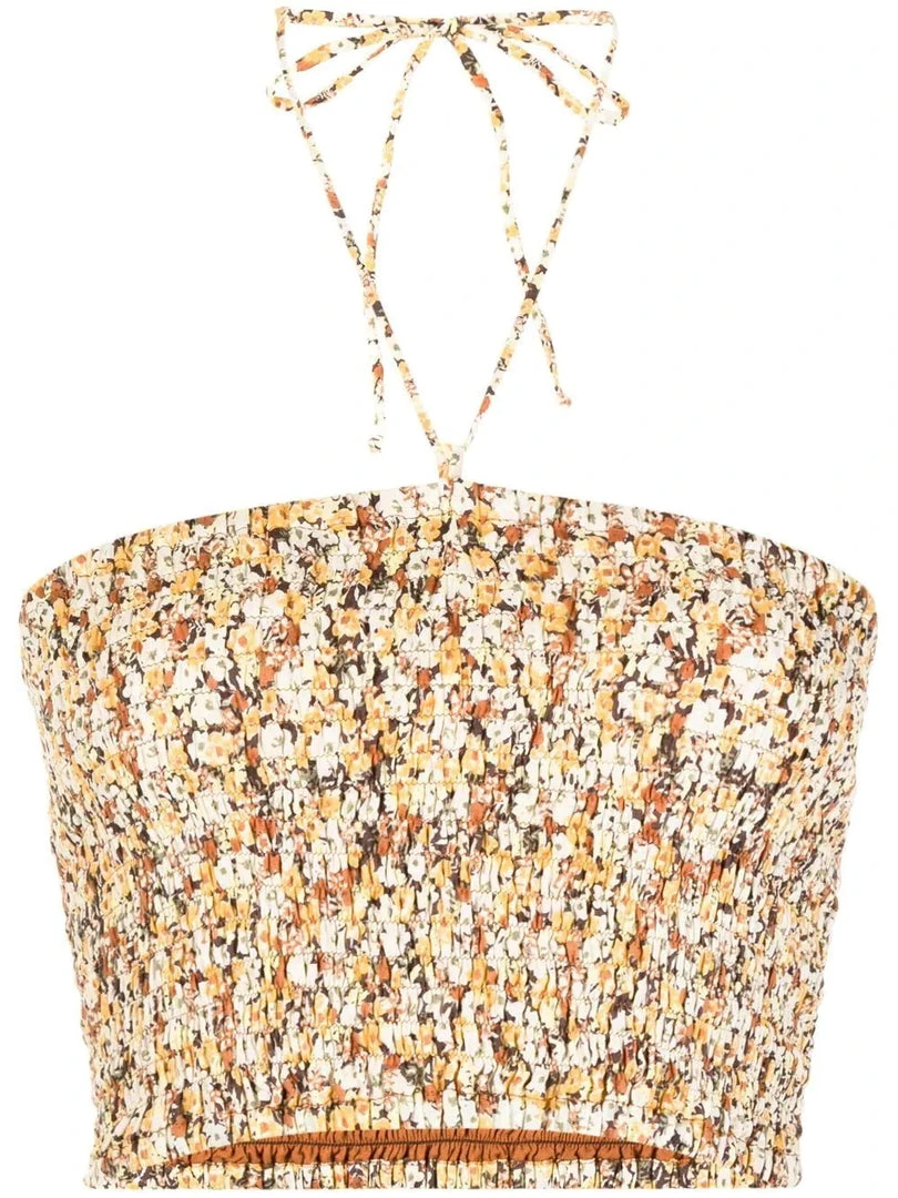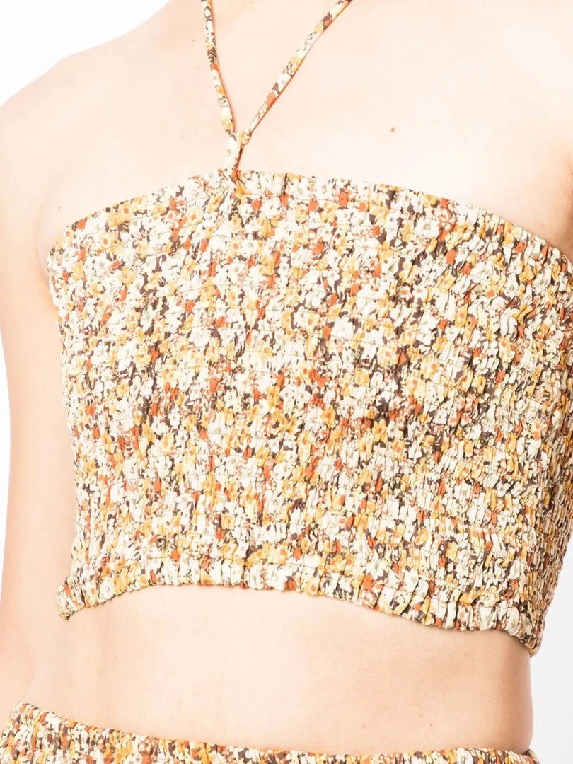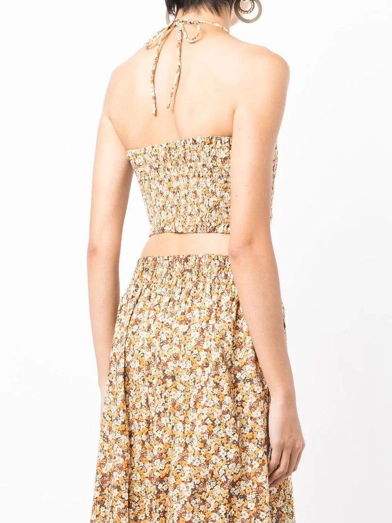 Faithfull The Brand ‘Vita’ tube top featuring an adjustable halter neck tie fastening, a shirred top, a crop style, a brown toned floral print and pulls on. Item fits true to size. Model is wearing a size S.