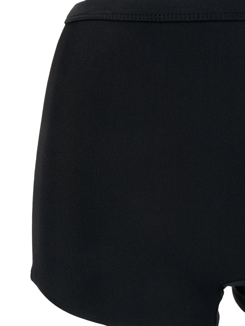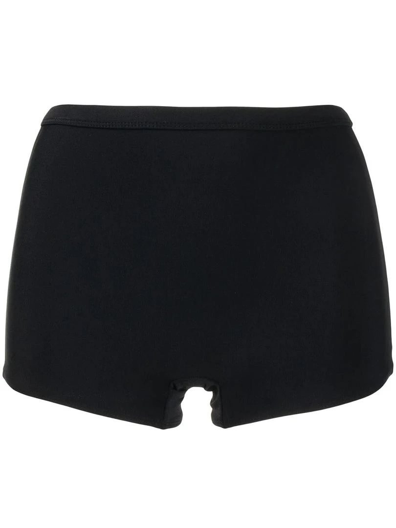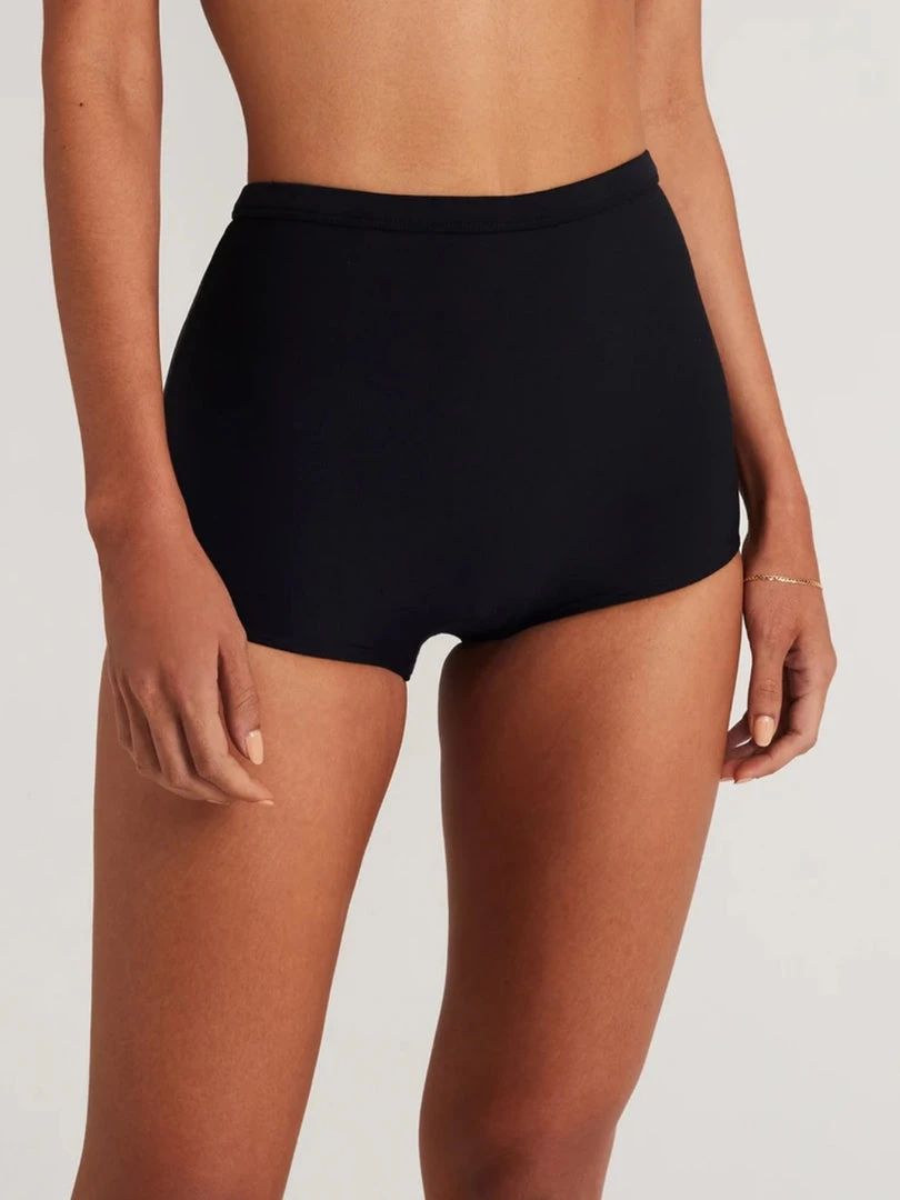 Faithfull The Brand black ‘Kenzie’ bikini bottoms featuring an elasticated waistband and a boy-short high waisted style. Item fits true to size. Model is wearing a size S.Â