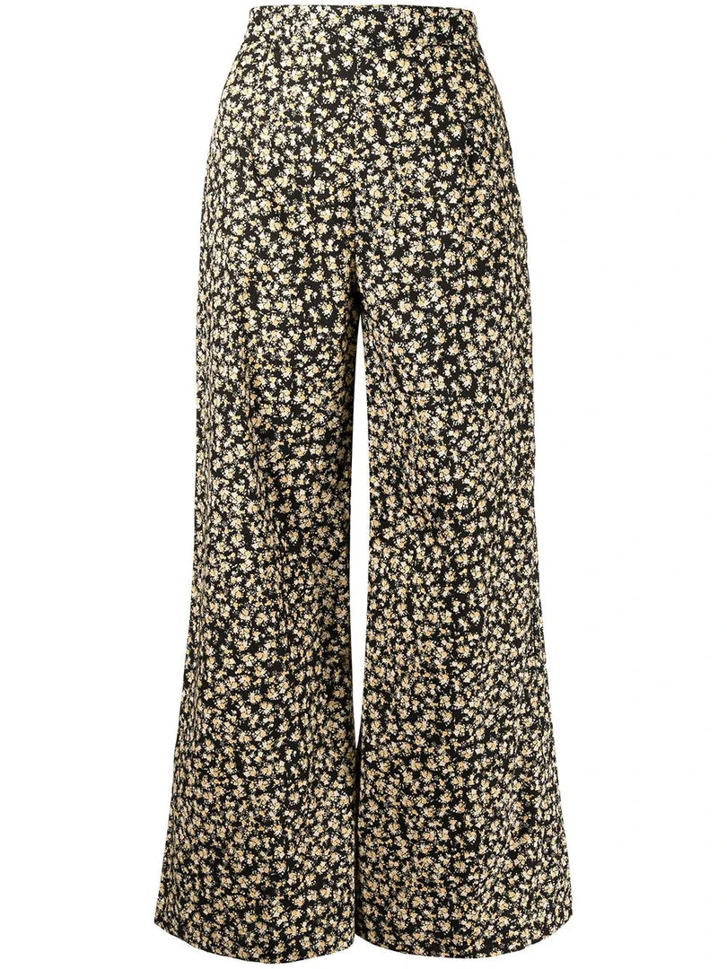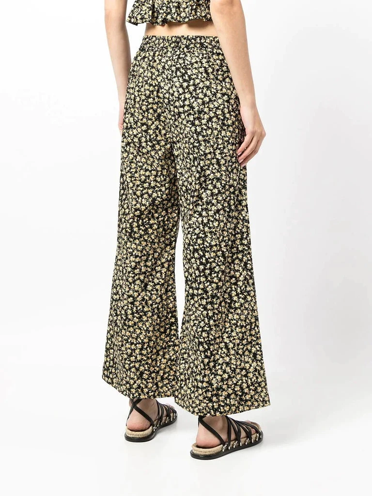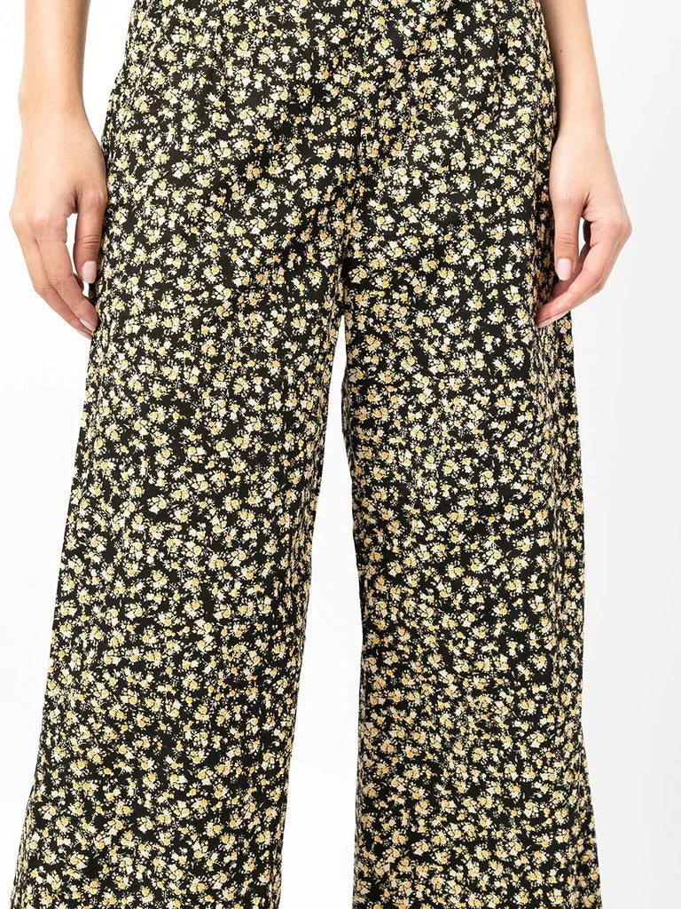 Faithfull The Brand black ‘Lario’ flared floral trousers featuring a side zip fastening, an elasticated back band, a flared leg and a yellow floral print. Item fits true to size. Model is wearing a size S.