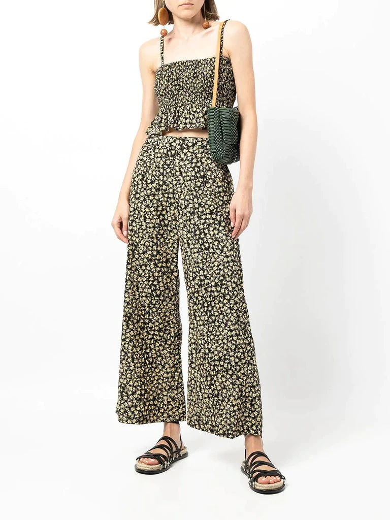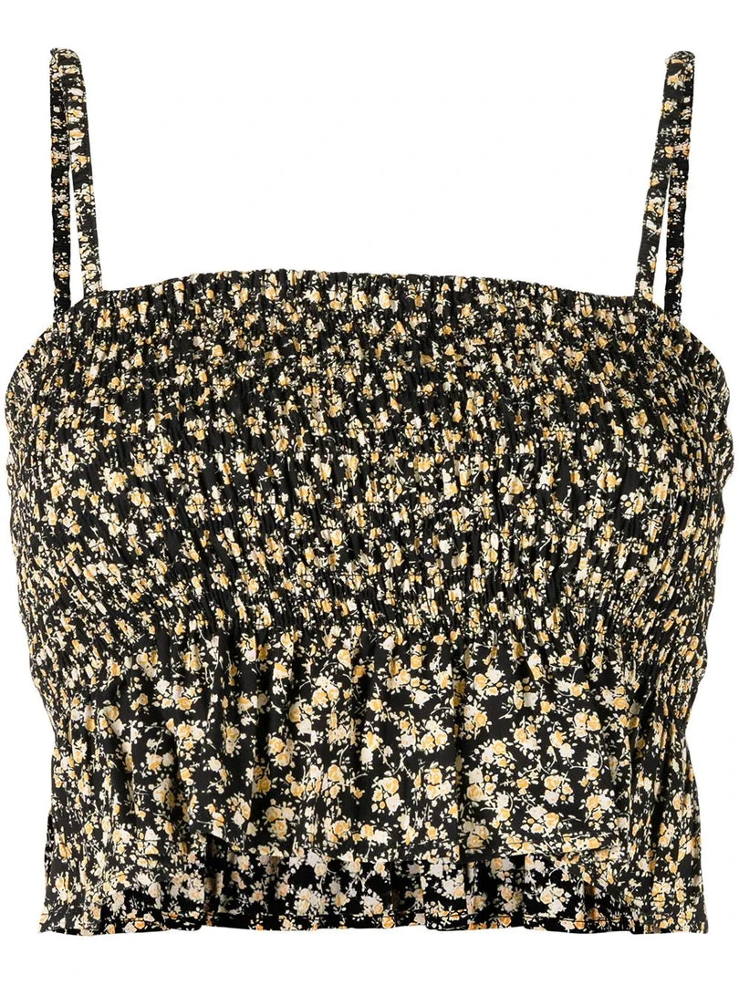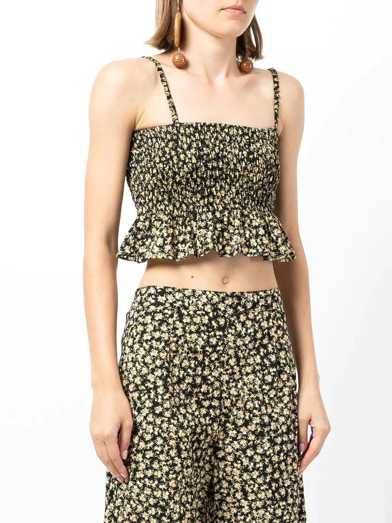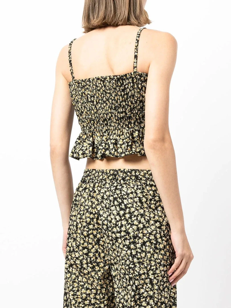 Faithfull The Brand black ‘Damita’ shirred floral crop top featuring elasticated spaghetti straps, a straight neckline, a shirred top, a ruffled hemline, a yellow floral motif print and pulls on. Item fits true to size. Model is wearing a size S.