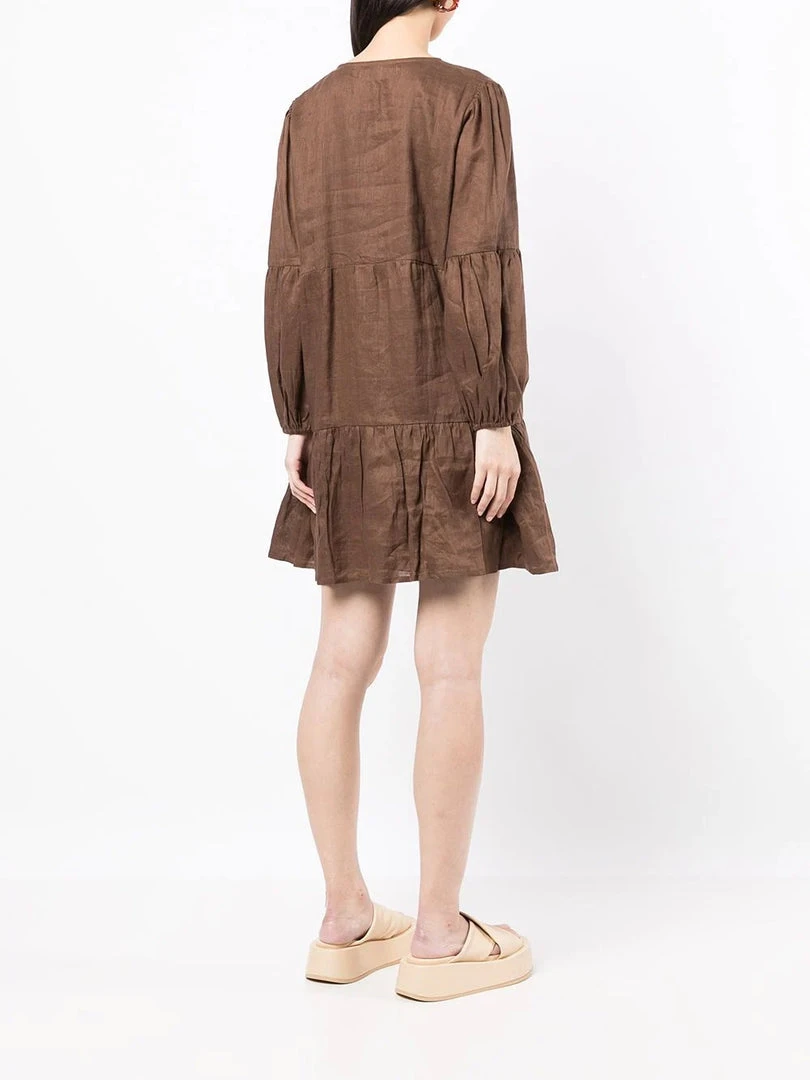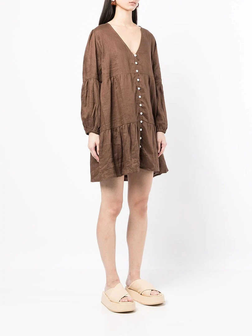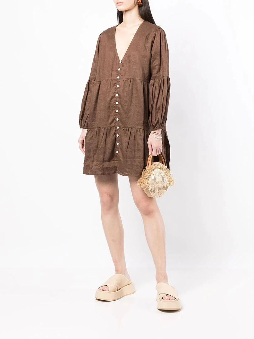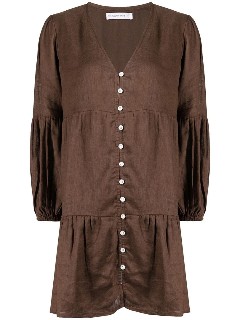 Faithfull The Brand brown ‘Dija’ buttoned mini dress featuring a V-neckline, front button fastenings, long sleeves with elasticated cuffs, a tiered skirt and a short length. Item fits true to size. Model is wearing a size S.Â