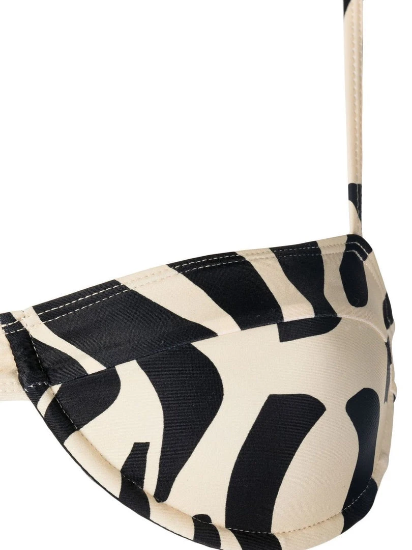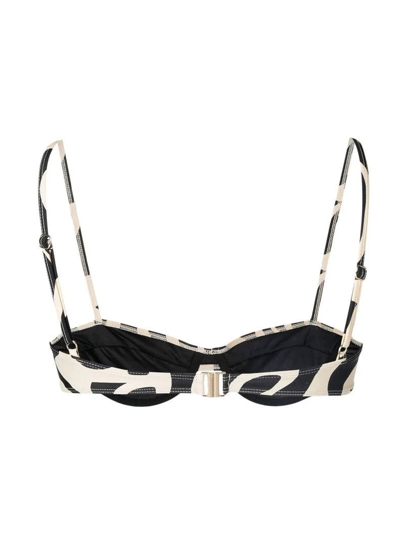 Faithfull The Brand ‘Farrah’ bikini top featuring adjustable spaghetti straps, an underwired cup design, a back clip fastening and a black and cream abstract print. Item fits true to size. Model is wearing a size S.Â