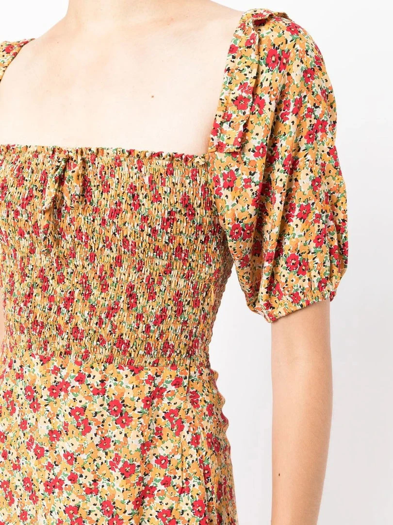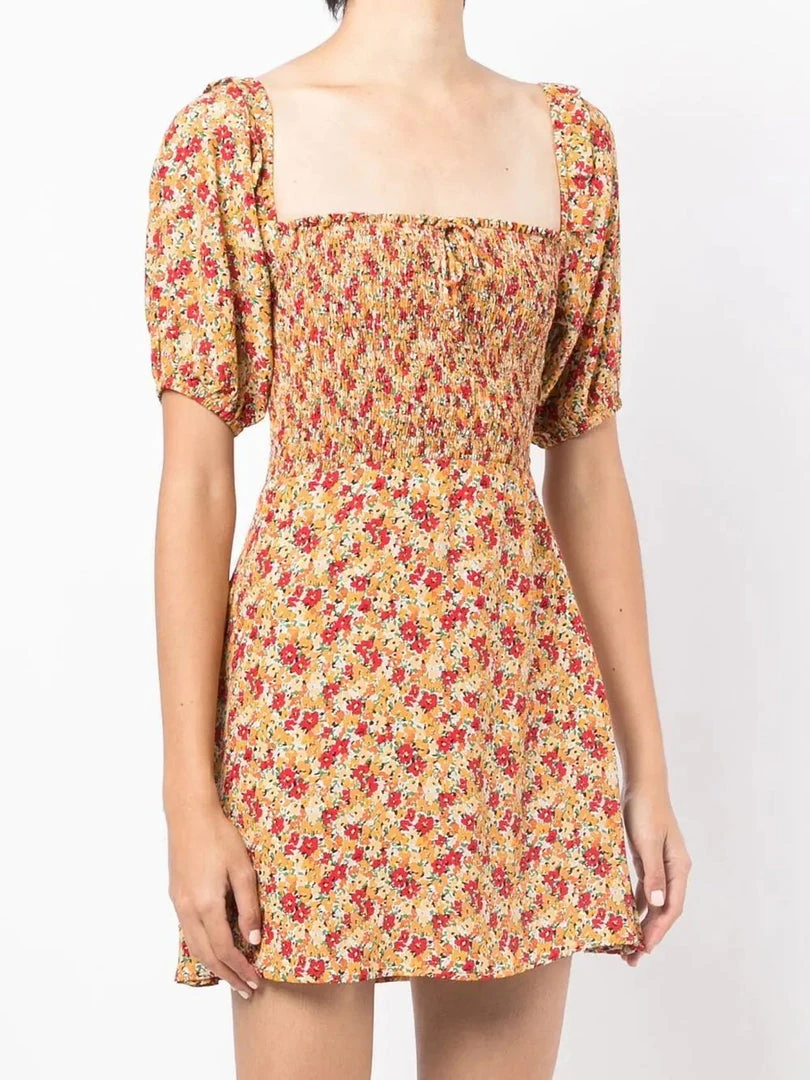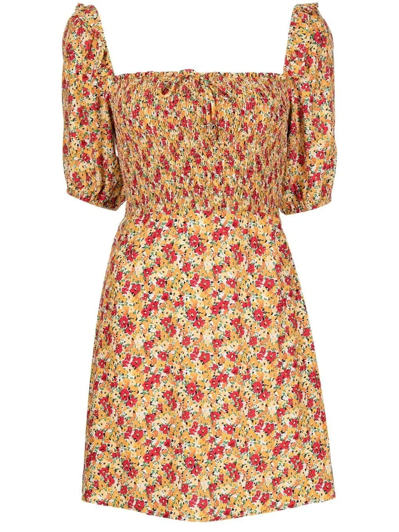 Faithfull The Brand ‘Il Carro’ mini dress featuring an elasticated shoulder line, a front tie detail, an elasticated shirred top, a multicoloured floral print, short sleeves with elasticated cuffs and pulls on. Item fits true to size. Model is wearing a size S.Â