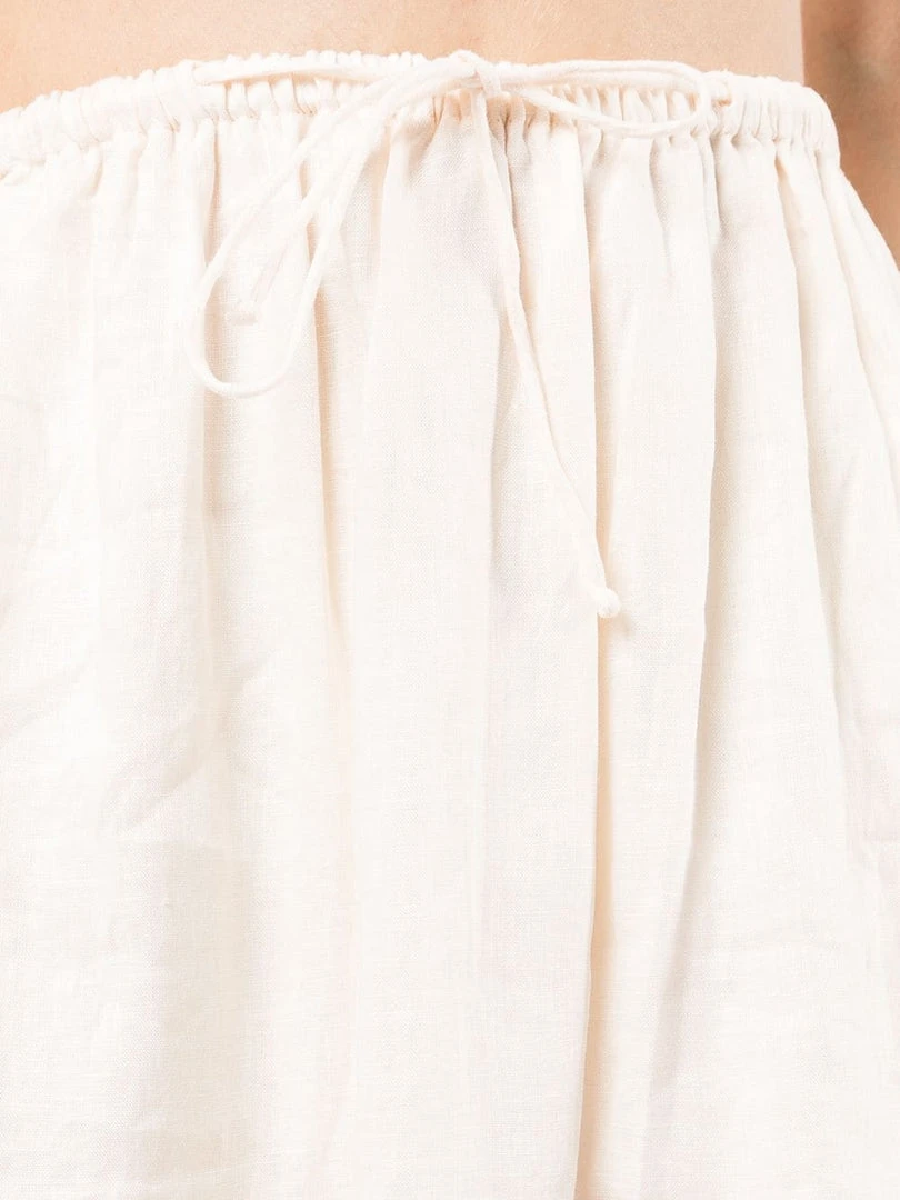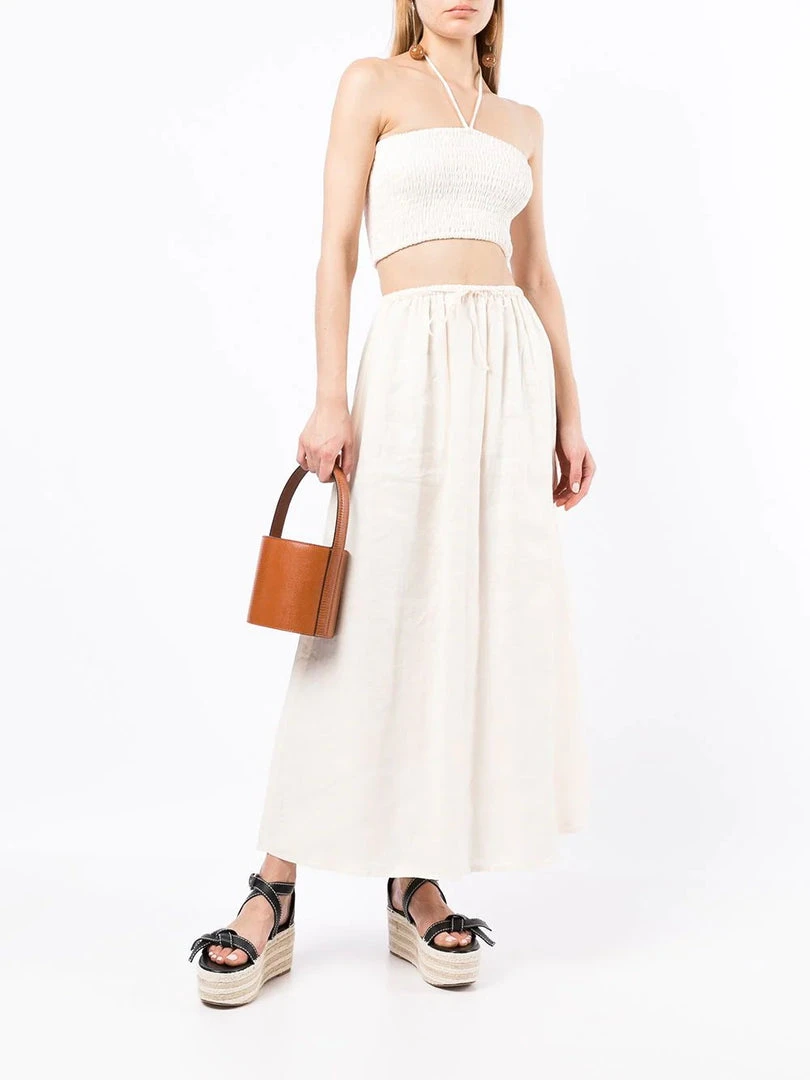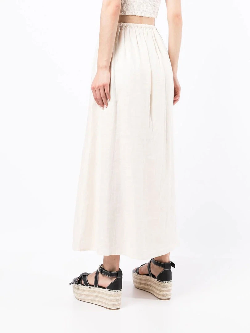 Faithfull The Brand cream ‘Jovianne’ midaxi skirt featuring an elasticated drawstring waistband, a long midi length and pulls on. Item fits true to size. Model is wearing a size S.Â