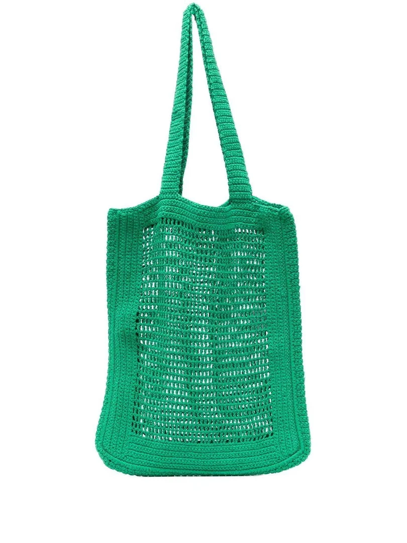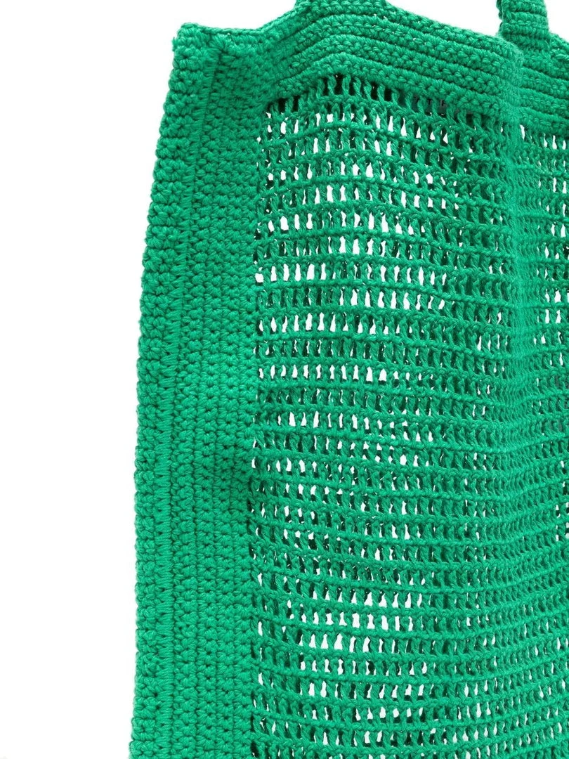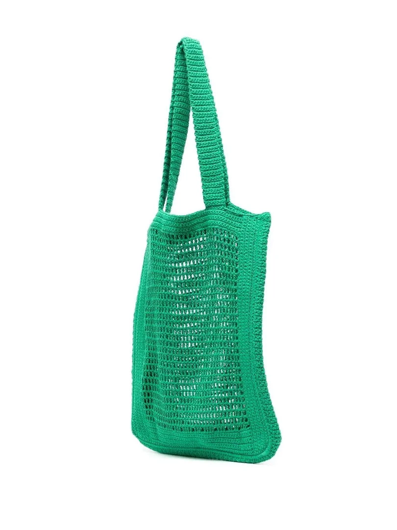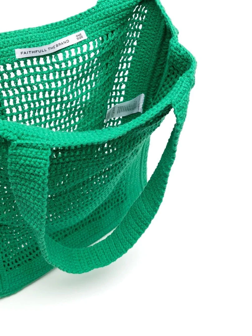 Faithfull The Brand green ‘Crochet Tote Bag’ featuring two top handles, a slightly sheer design and an open top. Made in Indonesia. One Size.