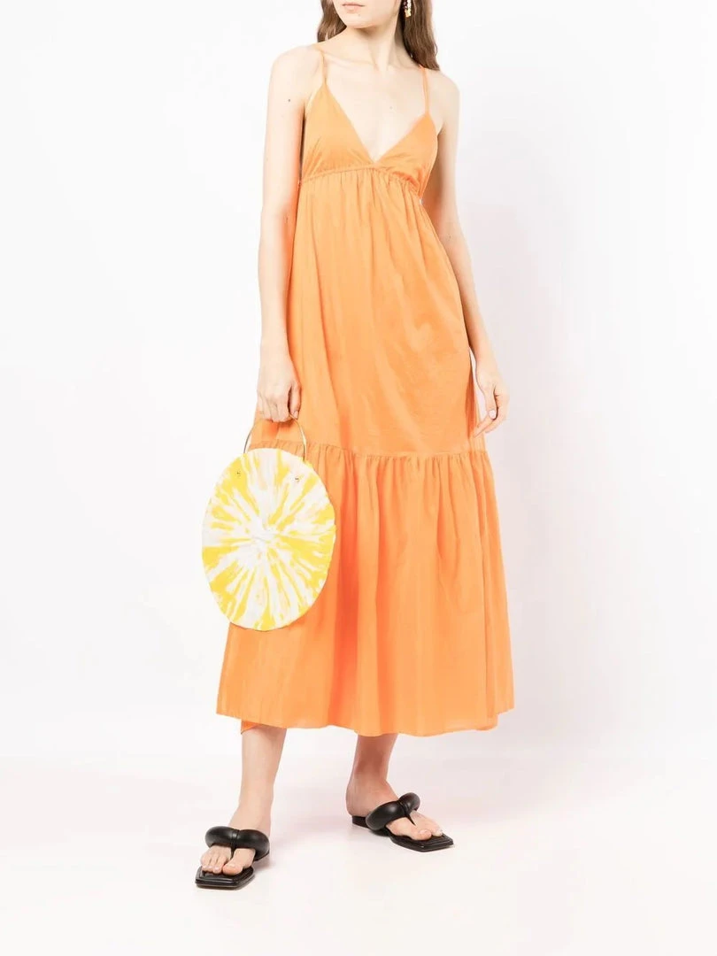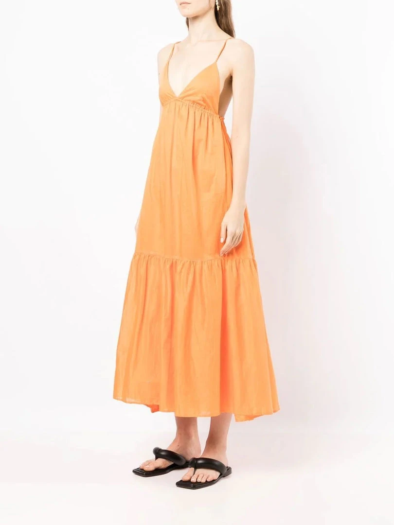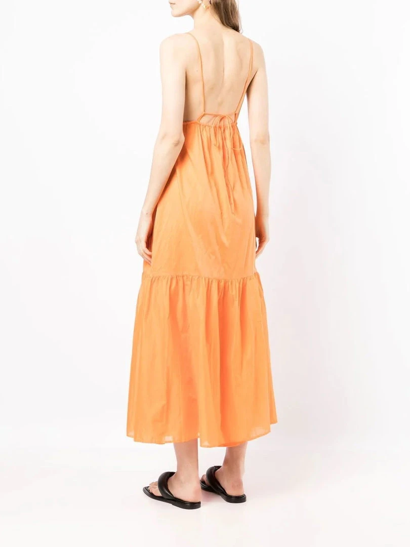 Faithfull The Brand orange ‘Wilonna’ midi dress featuring a v-neckline, a back tie fastening, a sleeveless design, an elasticated band with gathered details at the bodice, a concealed side zip fastening, a tiered skirt and an open back. Item fits true to size. Model is wearing a size S.Â