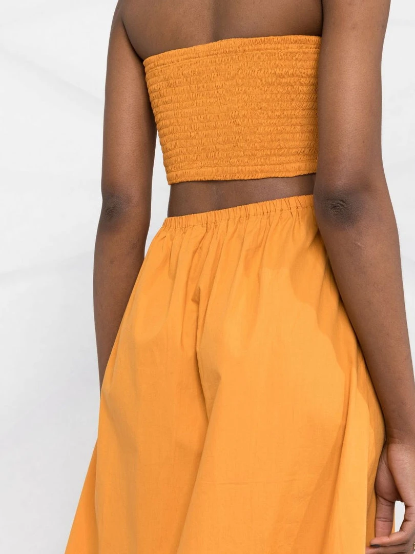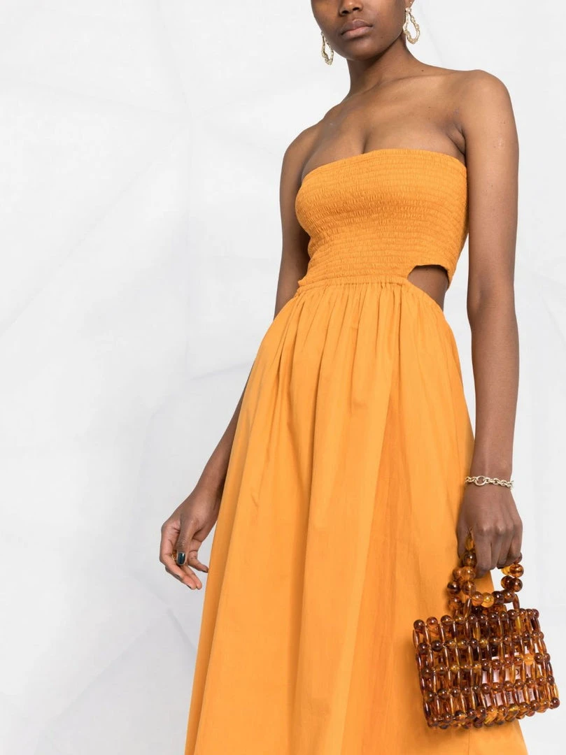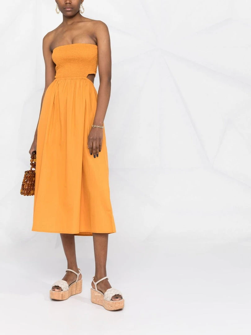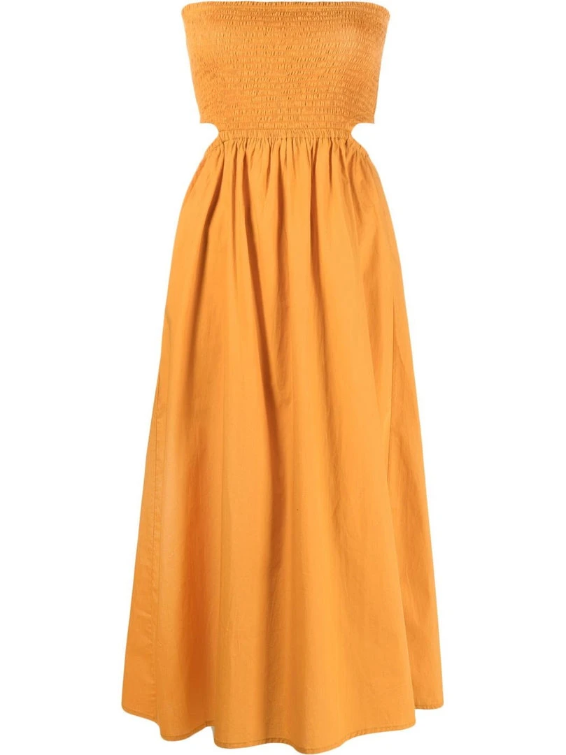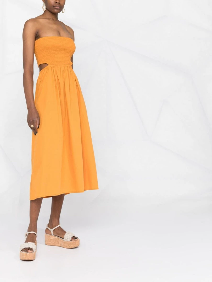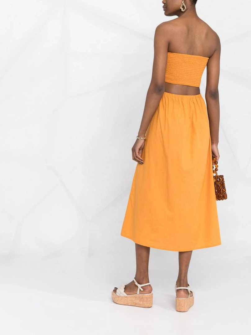 Faithfull The Brand orange ‘Deva’ strapless dress featuring a back cut out design, a shirred top, a midi length and pulls on. Item fits true to size. Model is wearing a size S.Â