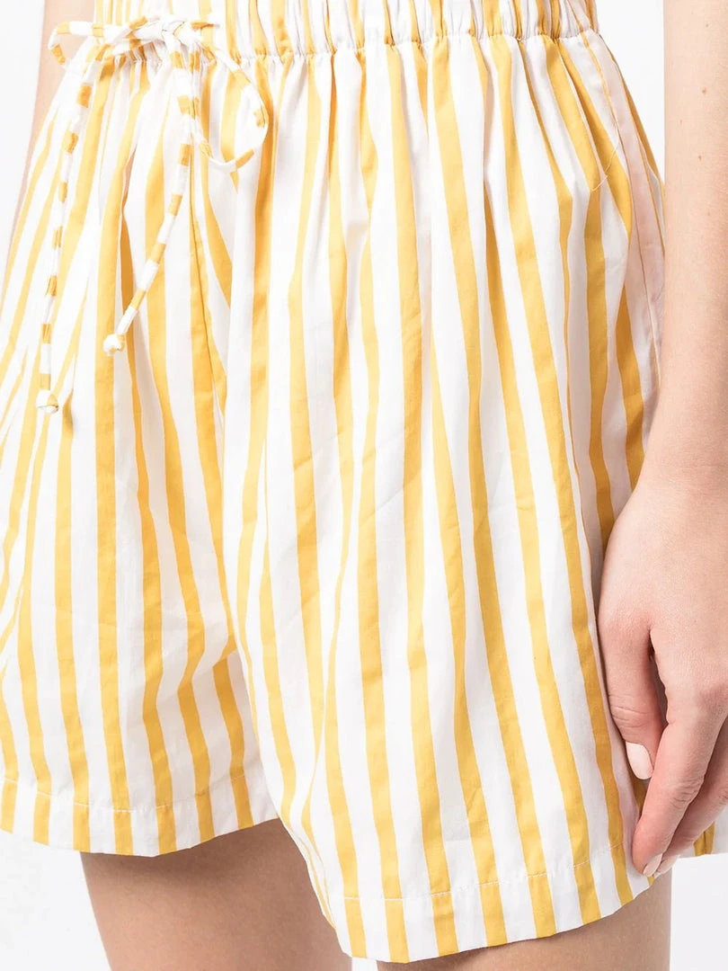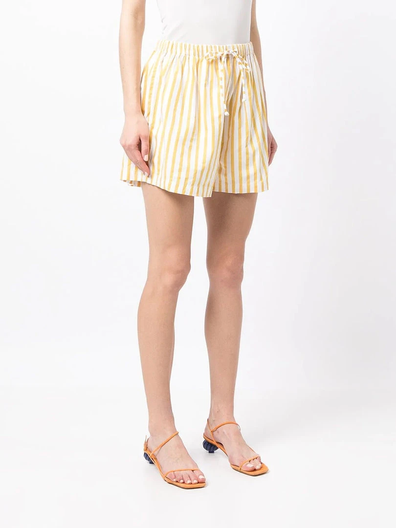 Faithfull The Brand ‘Sereno’ stripe shorts featuring an elasticated drawstring waistband, a yellow and white striped print and pulls on. Item fits true to size. Model is wearing a size S.