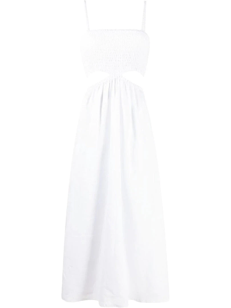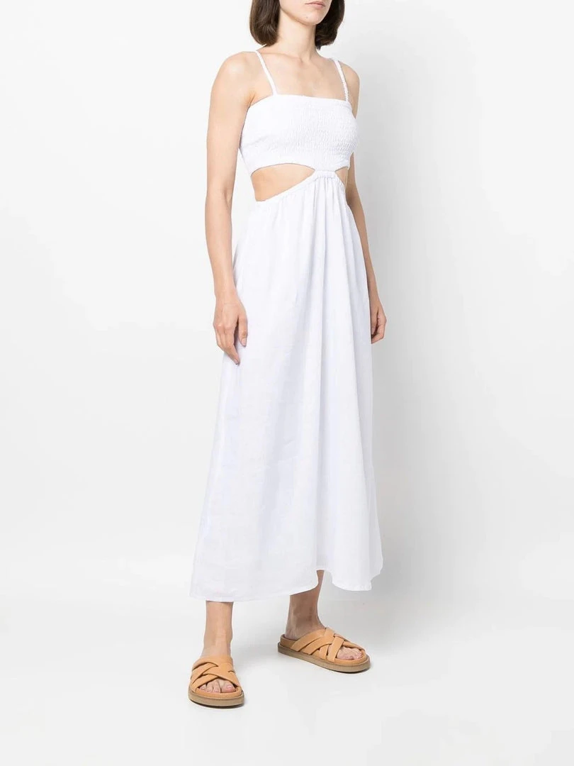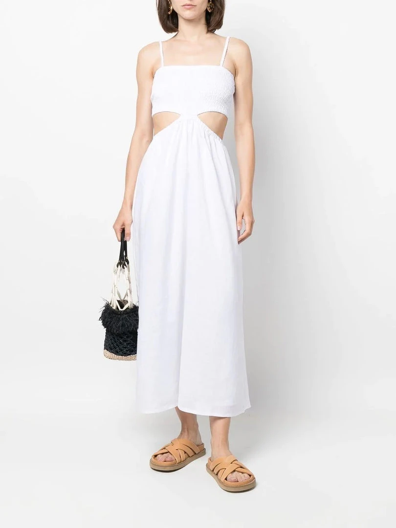 Faithfull The Brand white ‘Tayari’ midi dress featuring thin elasticated shoulder straps, a shirred bodice, side cut out details and a pull on style. Item fits true to size. Model is wearing a size S.