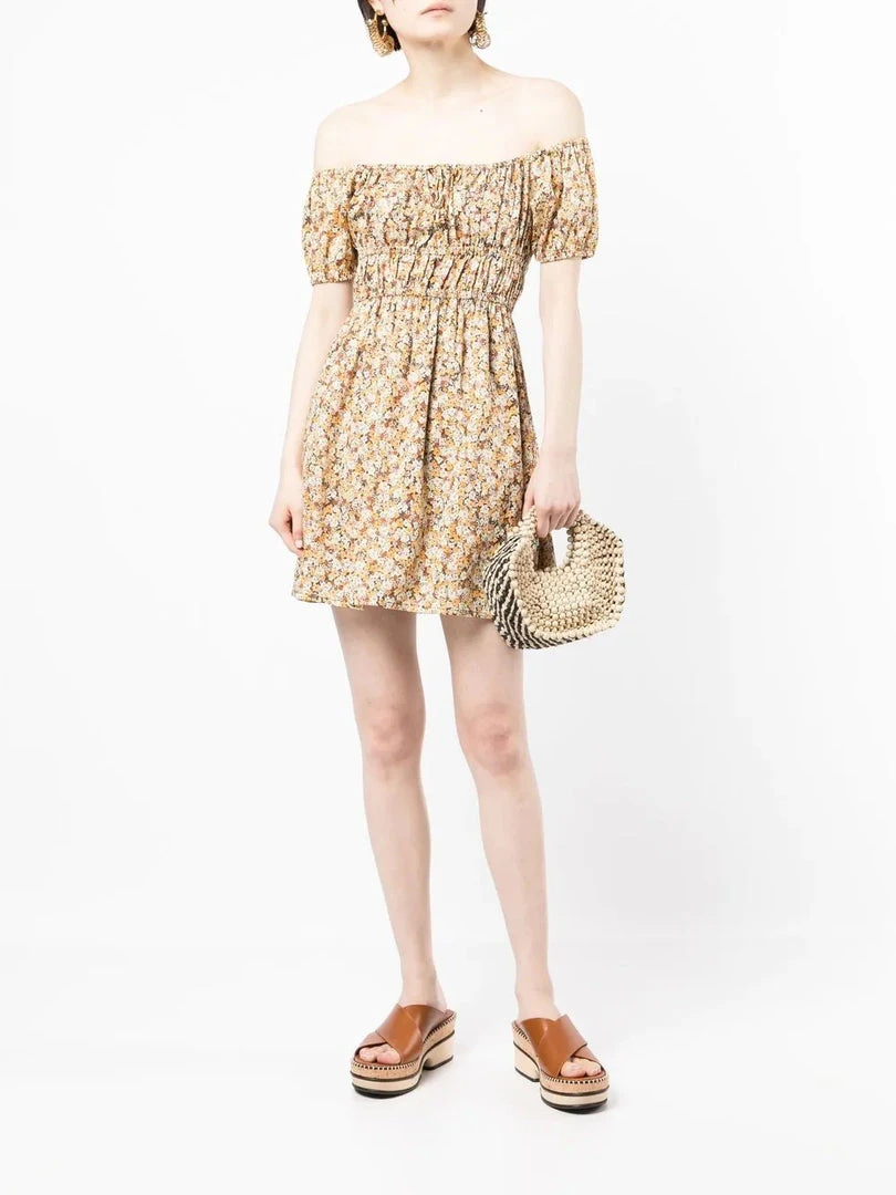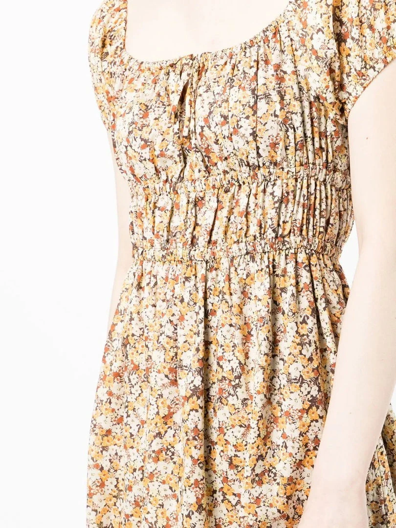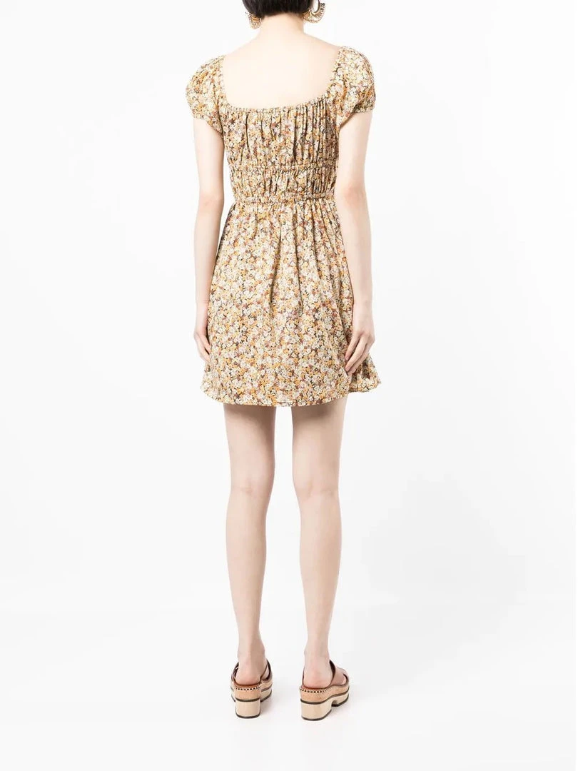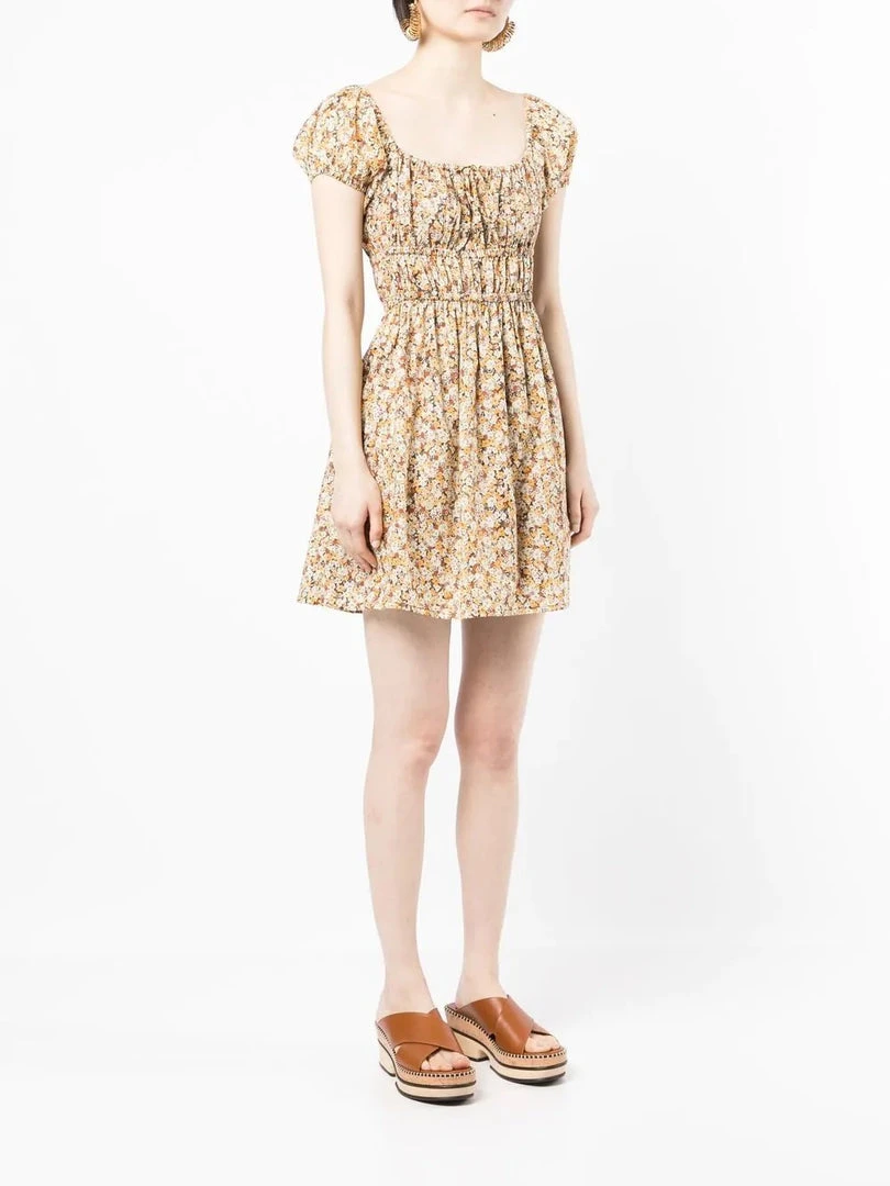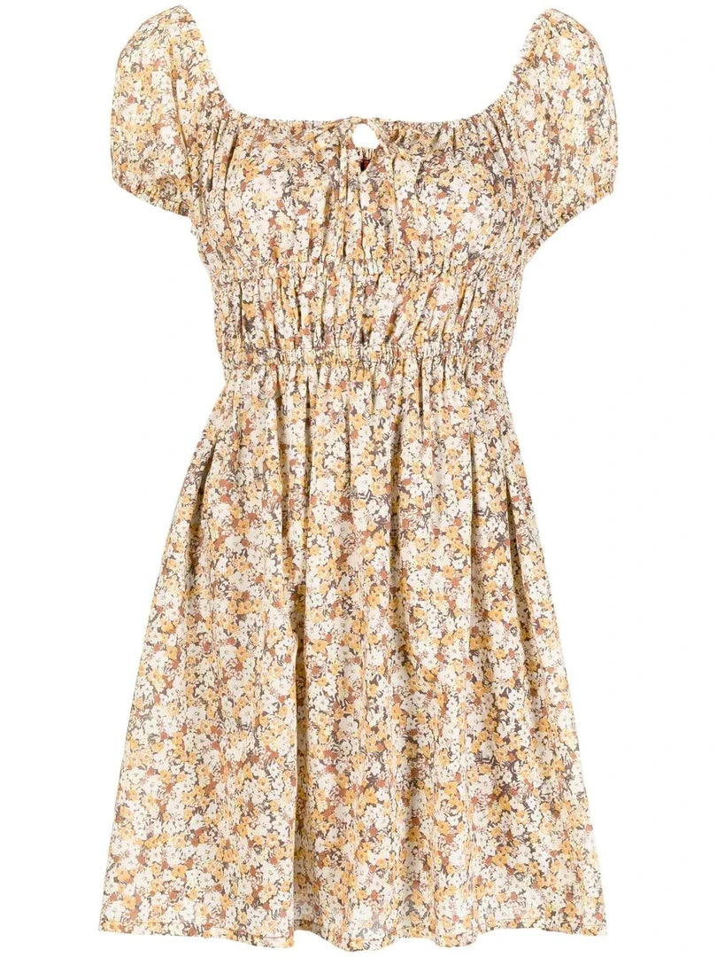Faithfull The Brand ‘Viola’ mini dress featuring an elasticated neckline with a front keyhole design and tie fastening, short sleeves with elasticated cuffs, an elasticated waist detail, a brown and yellow toned floral print and pulls on. Item fits true to size. Model is wearing a size S.