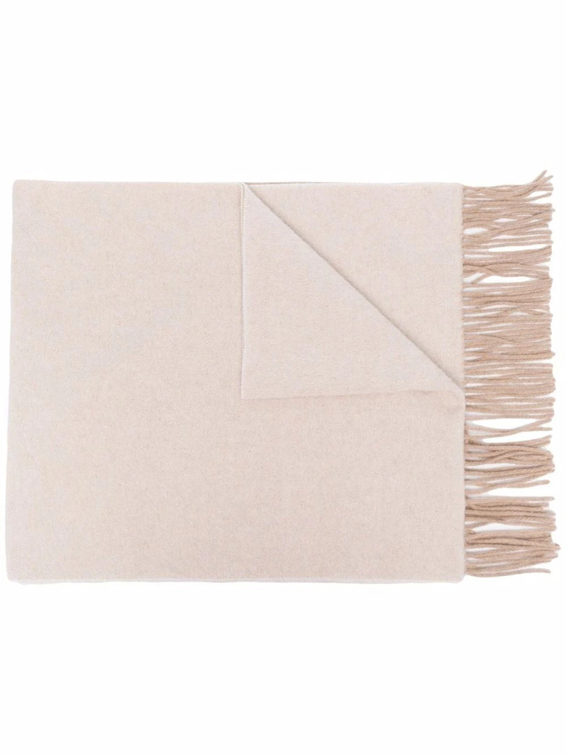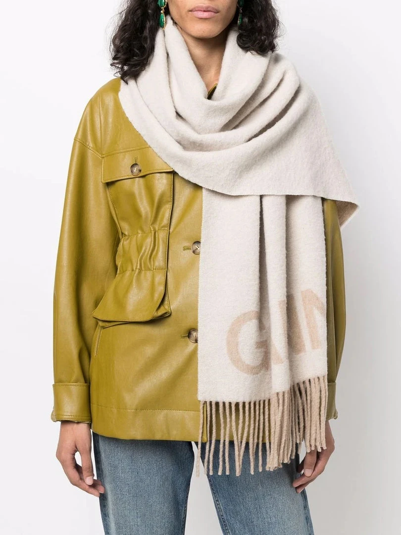 Ganni beige ‘Wool Logo Fringed Scarf’ featuring a beige tone brand logo design, fringing details and a wrap around style. Item is One Size. Made in Italy.Â