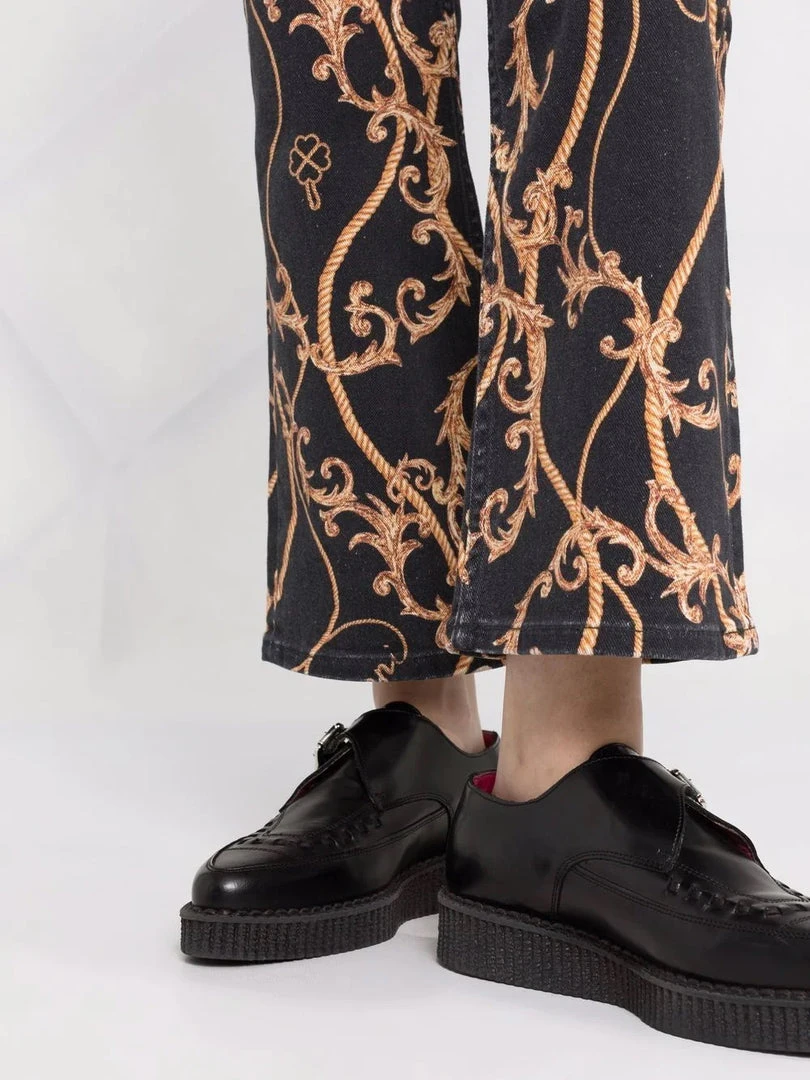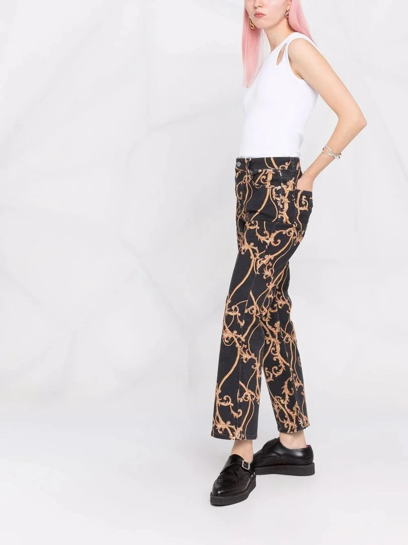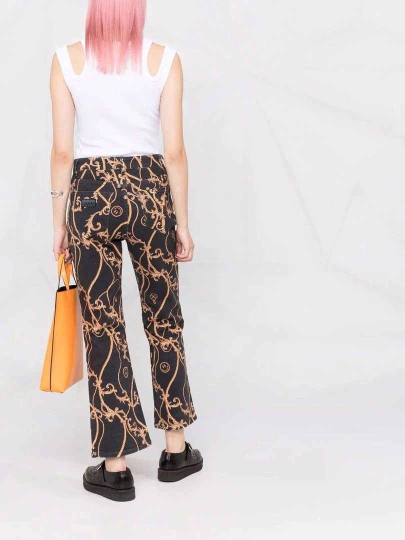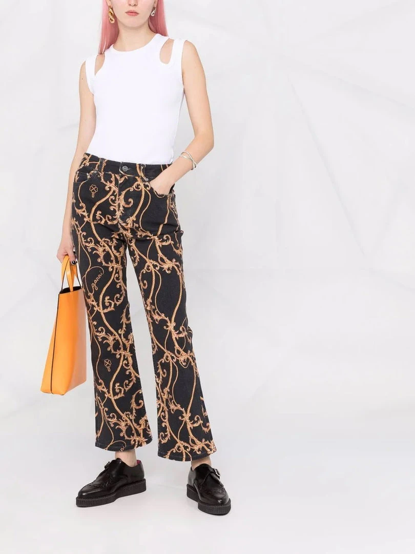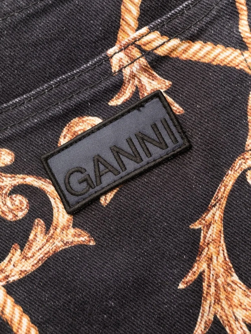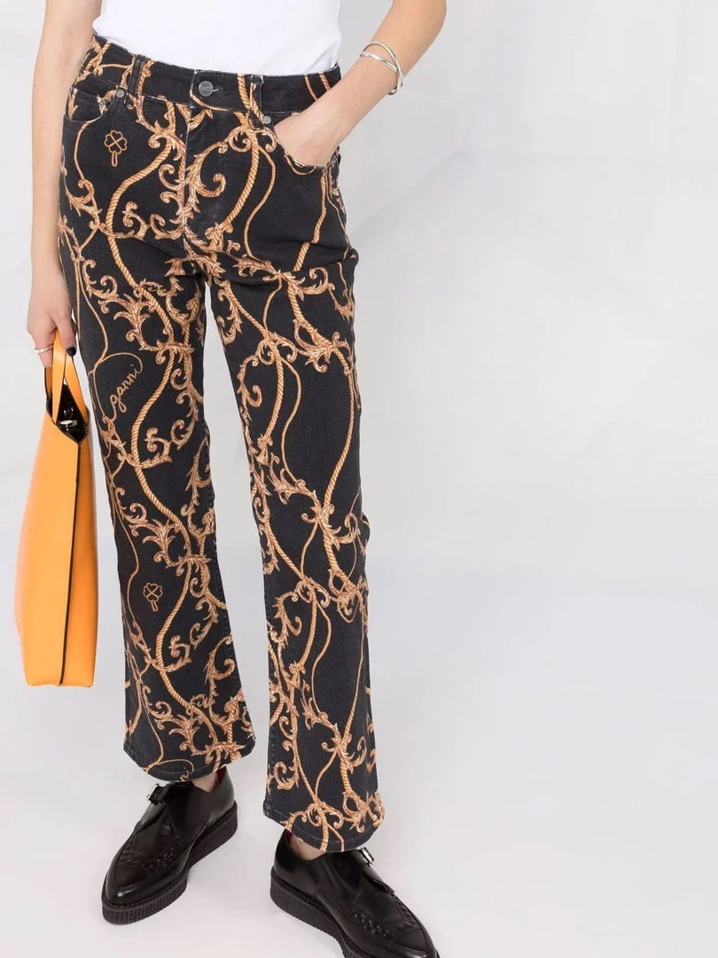 Ganni faded black ‘Betzy’ printed cropped jeans featuring a front button and zip fastening, belt loops, a five pocket design, a black brand logo patch on the back pocket, a gold print with the brand signature smiley design, a high rise style and a straight, cropped leg fit. Item fits true to size. Model is wearing a size 27 W.Â