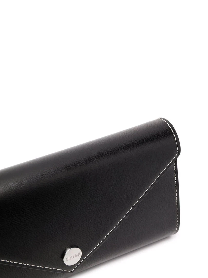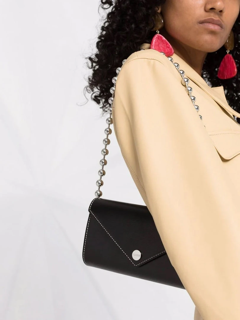 Ganni black ‘Bauble Chain Mini Handbag’ featuring a detachable silver tone bauble chain strap, an envelope style snap button closure, inner side compartments and contrasting white stitching. Item is One Size. Made in China.Â