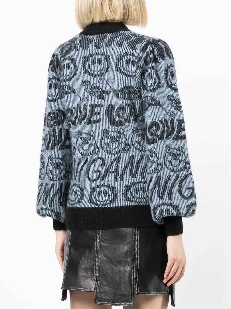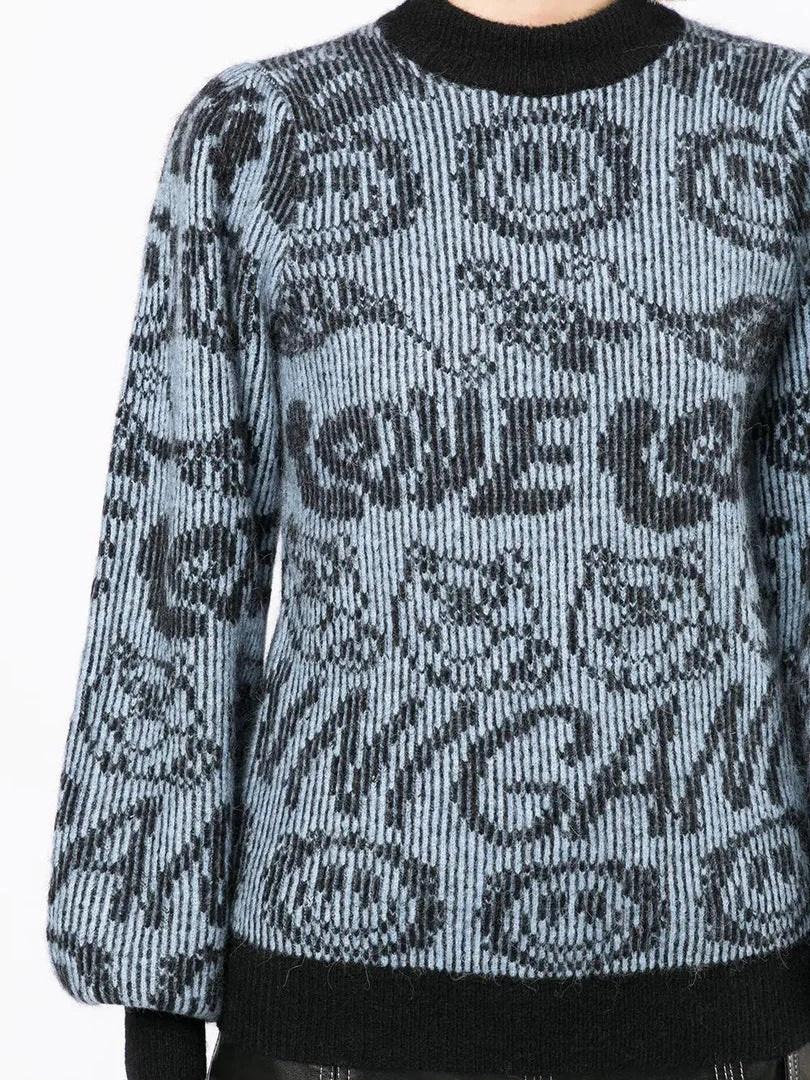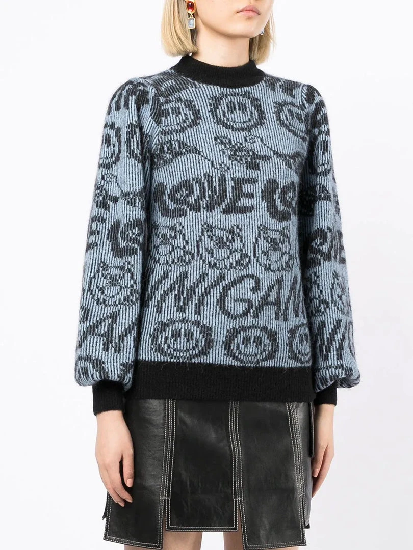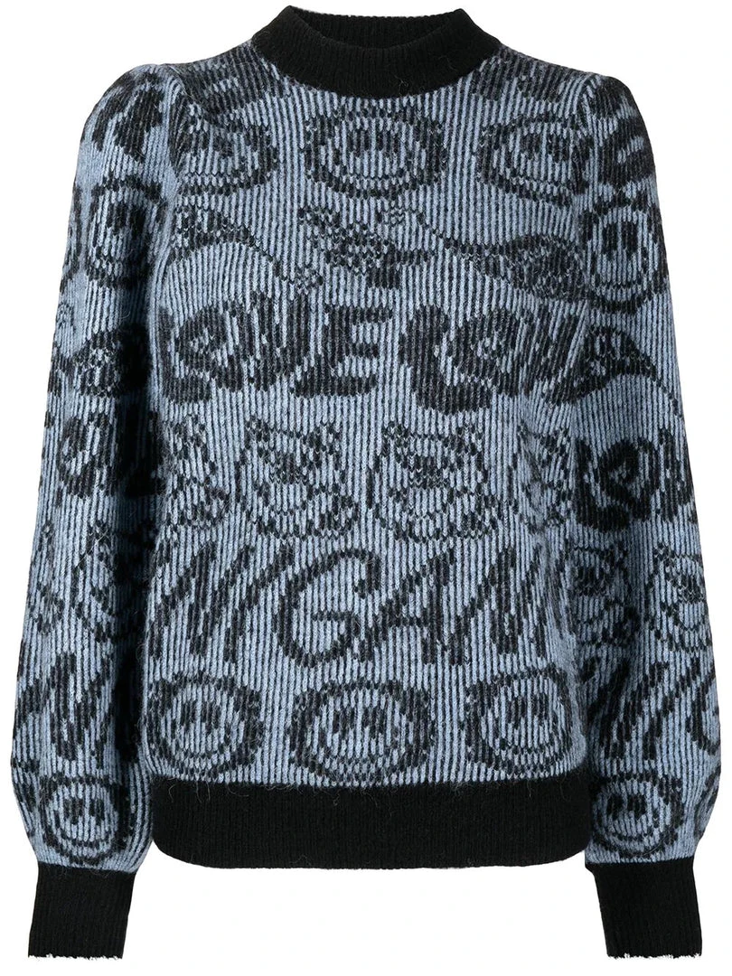 Ganni blue ‘Logo Smiley Balloon Sleeve Sweater’ featuring a crew neckline, long balloon sleeves, a black brand logo and smiley face print, a ribbed knit and pulls on. Item fits true to size. Model is wearing a size XS.Â