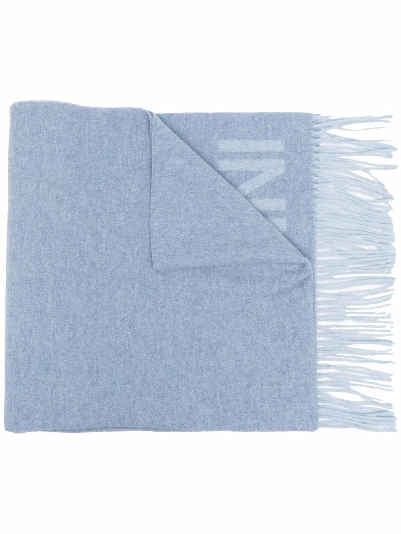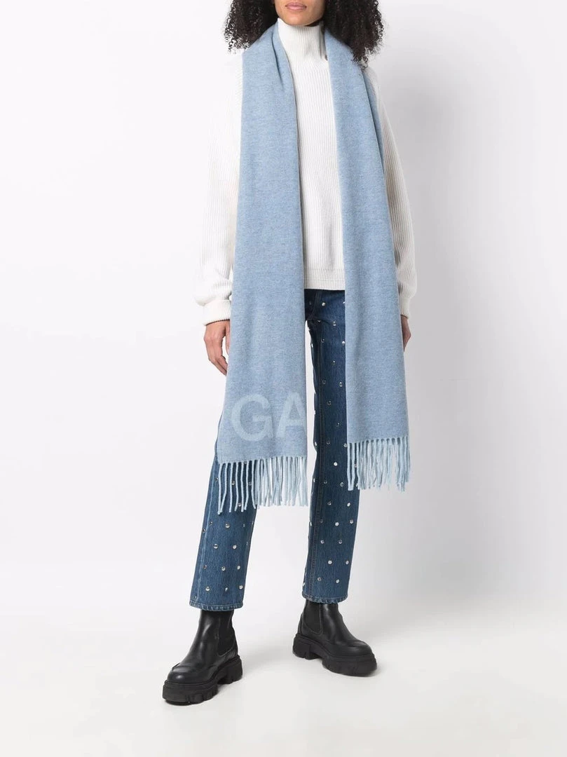 Ganni light blue ‘Wool Logo Fringed Scarf’ featuring a blue tone brand logo design, fringing details and a wrap around style. Item is One Size. Made in Italy.