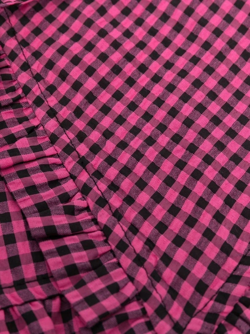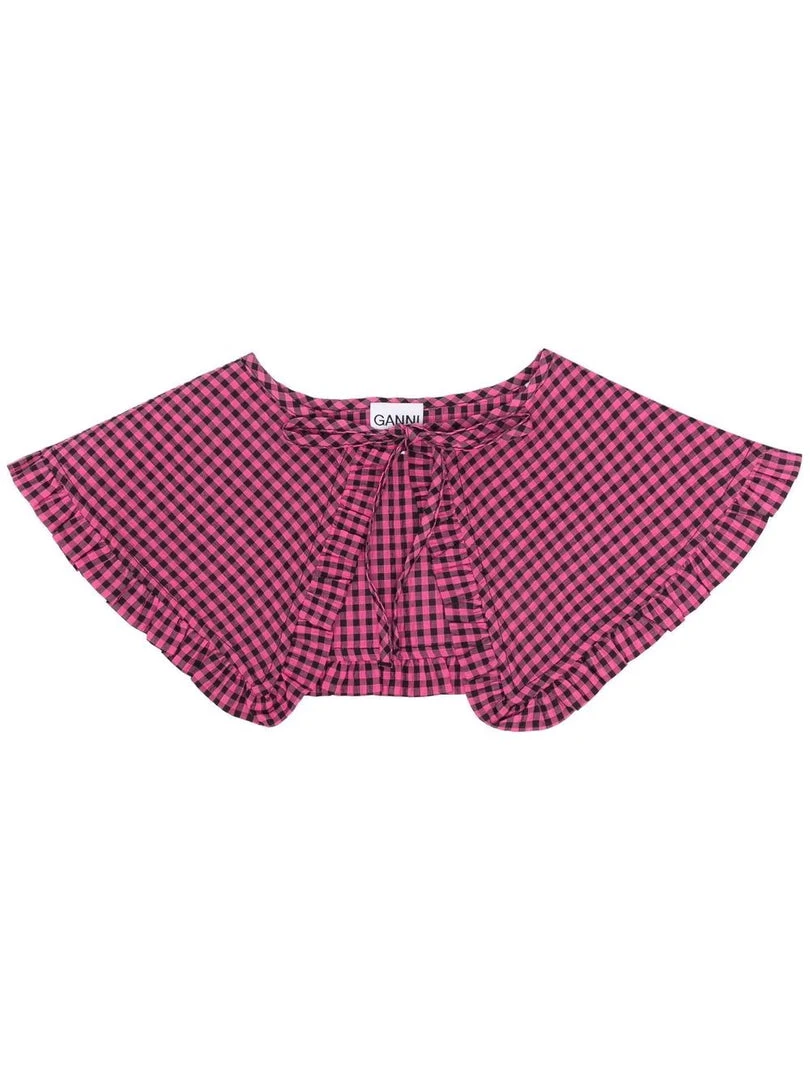 Ganni hot pink ‘Gingham Ruffled Collar’ featuring a tie front fastening, a black gingham print, ruffled trimming and an oversized style. Item is One Size. Made in Turkey.Â