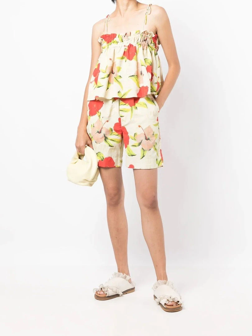 Ganni ‘Hawaii Smiley Face Print Shorts’ featuring an elasticated drawstring waist, a three pocket design, a multicoloured Hawaiian, smiley face and logo print and a pull on style. Item fits true to size. Model is wearing a size 36 FR.