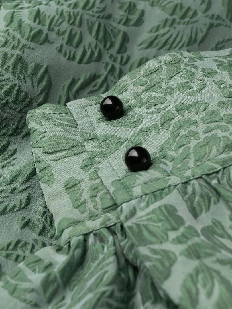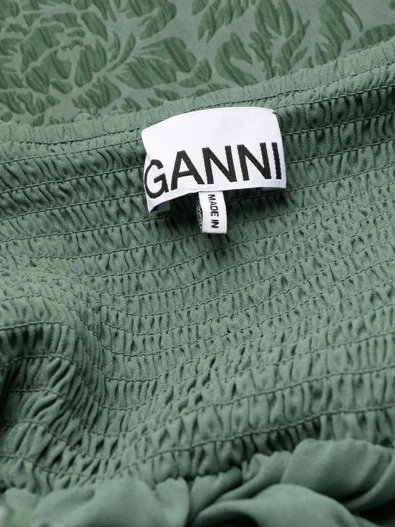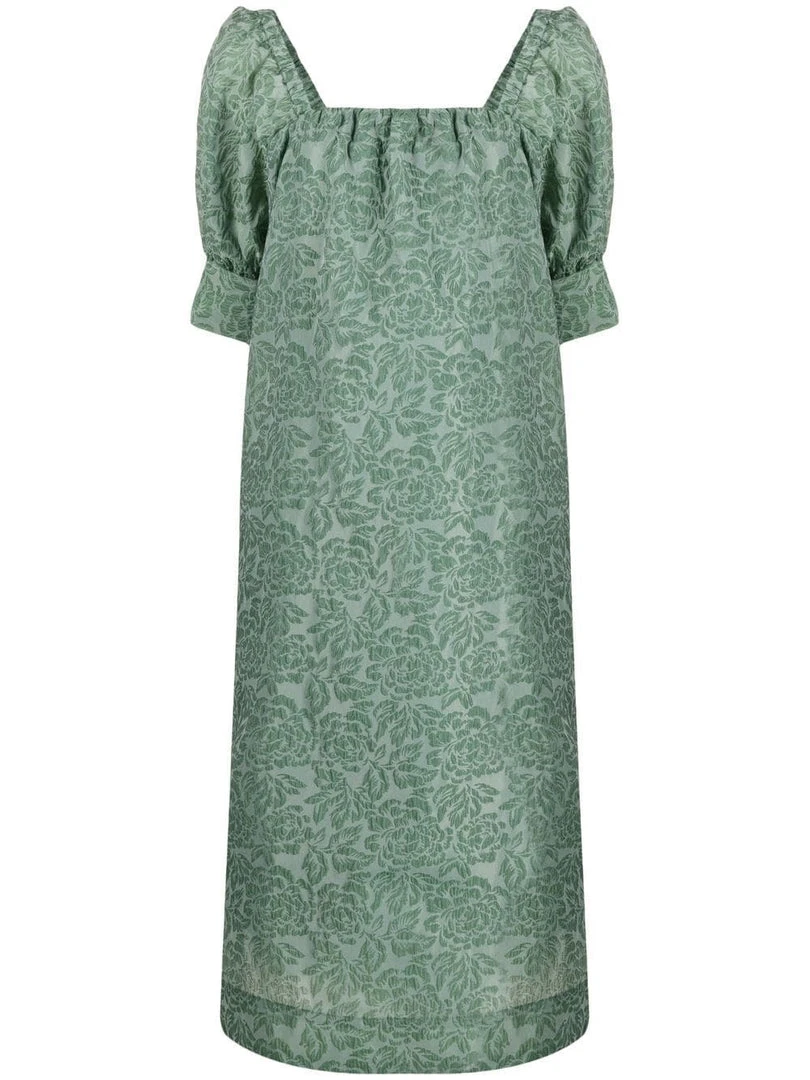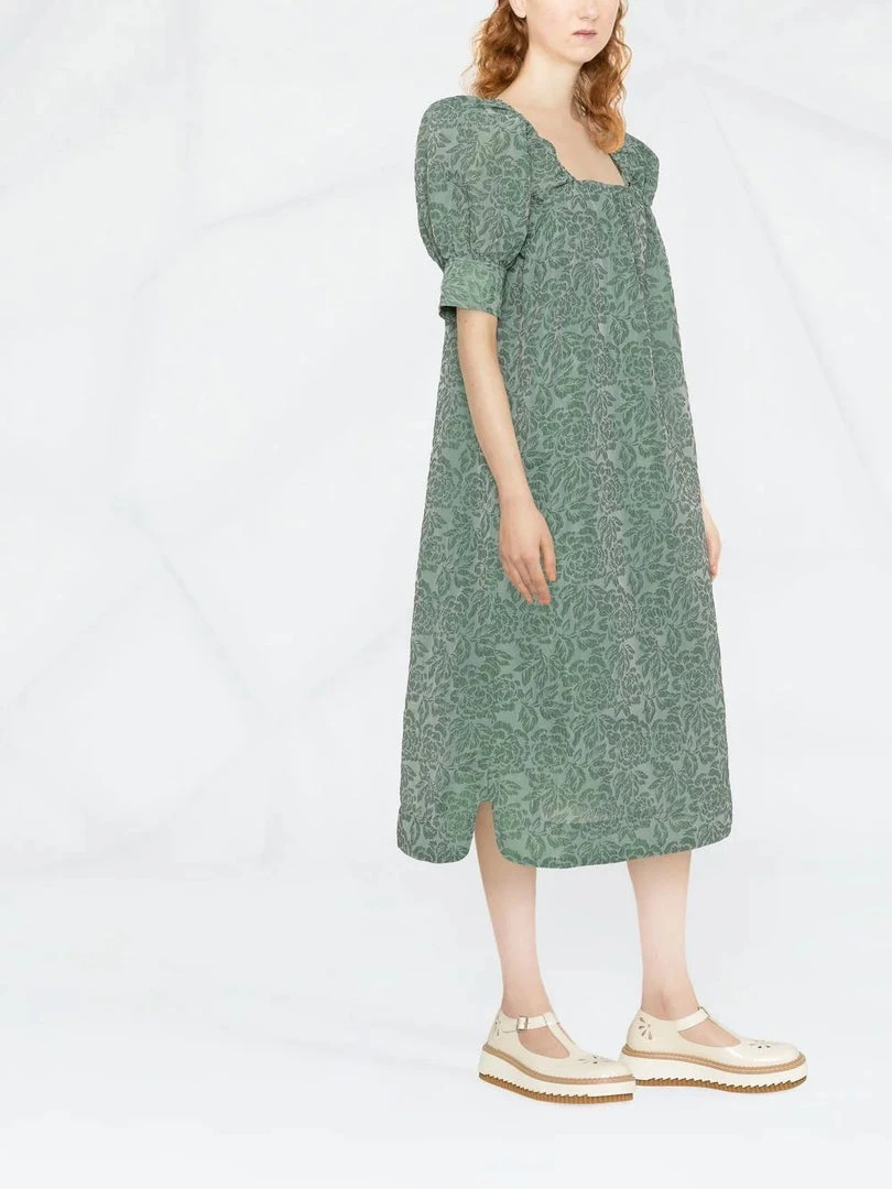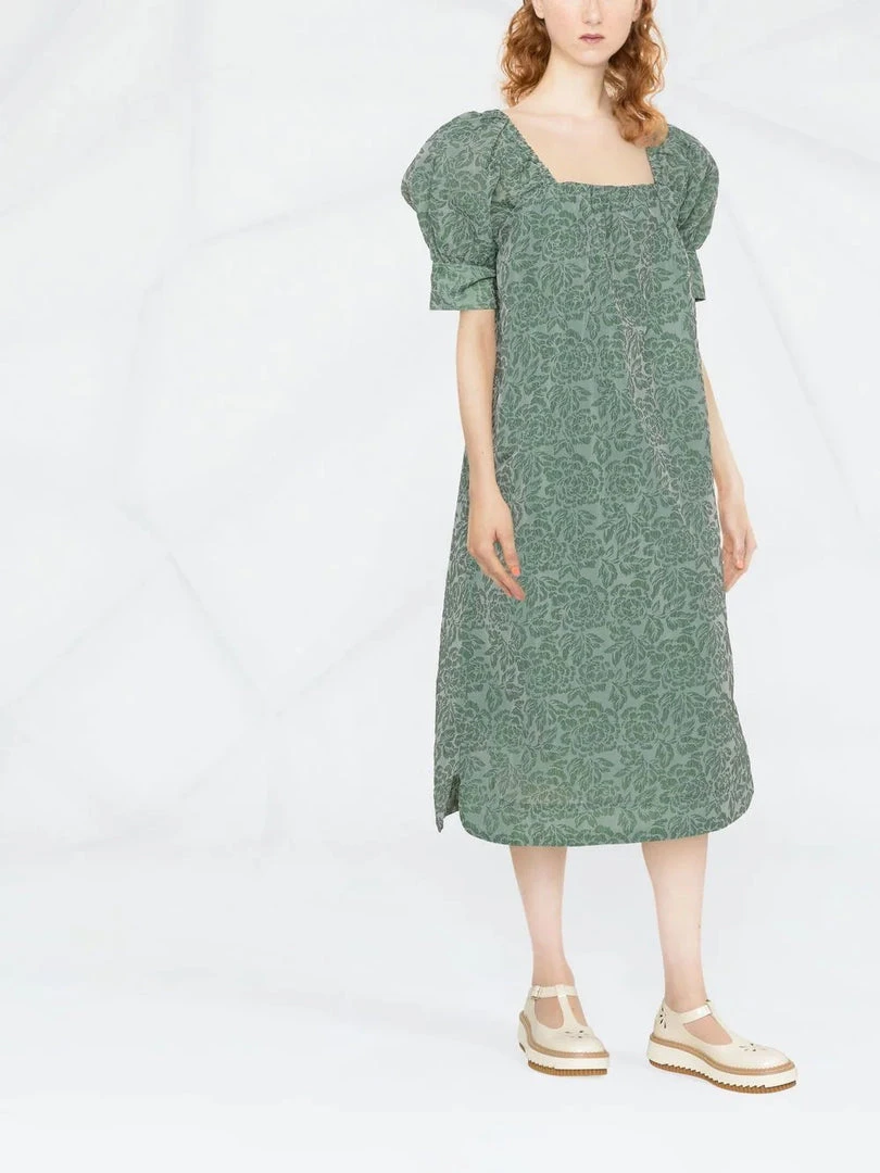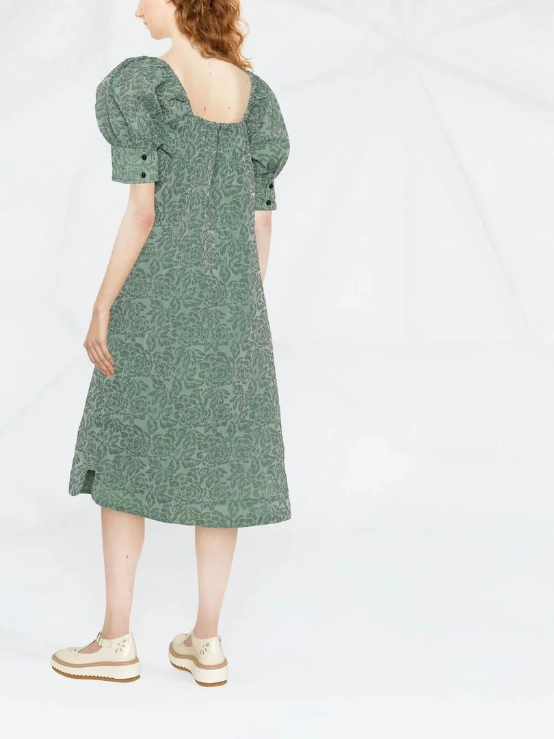 Ganni green ‘Jacquard Short Puff Sleeve Midi Dress’ featuring a square neckline, elasticated shoulders, buttoned cuffs, side slip pockets and a relaxed fit. Item fits true to size. Model is wearing a size 36 FR.Â