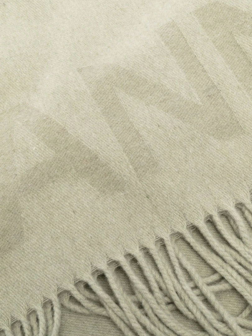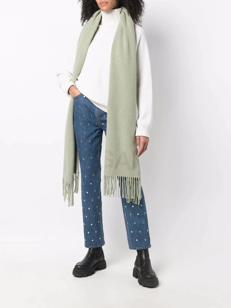 Ganni light khaki ‘Wool Logo Fringed Scarf’ featuring a khaki tone brand logo design, fringing details and a wrap around style. Item is One Size. Made in Italy.Â