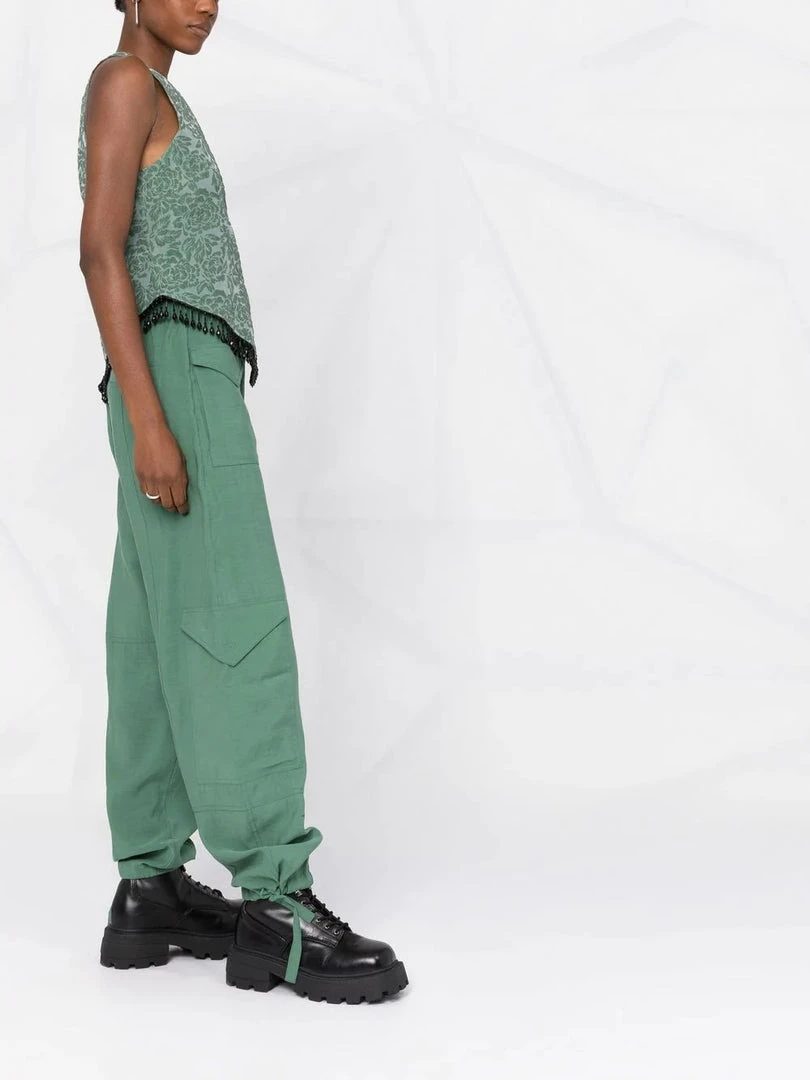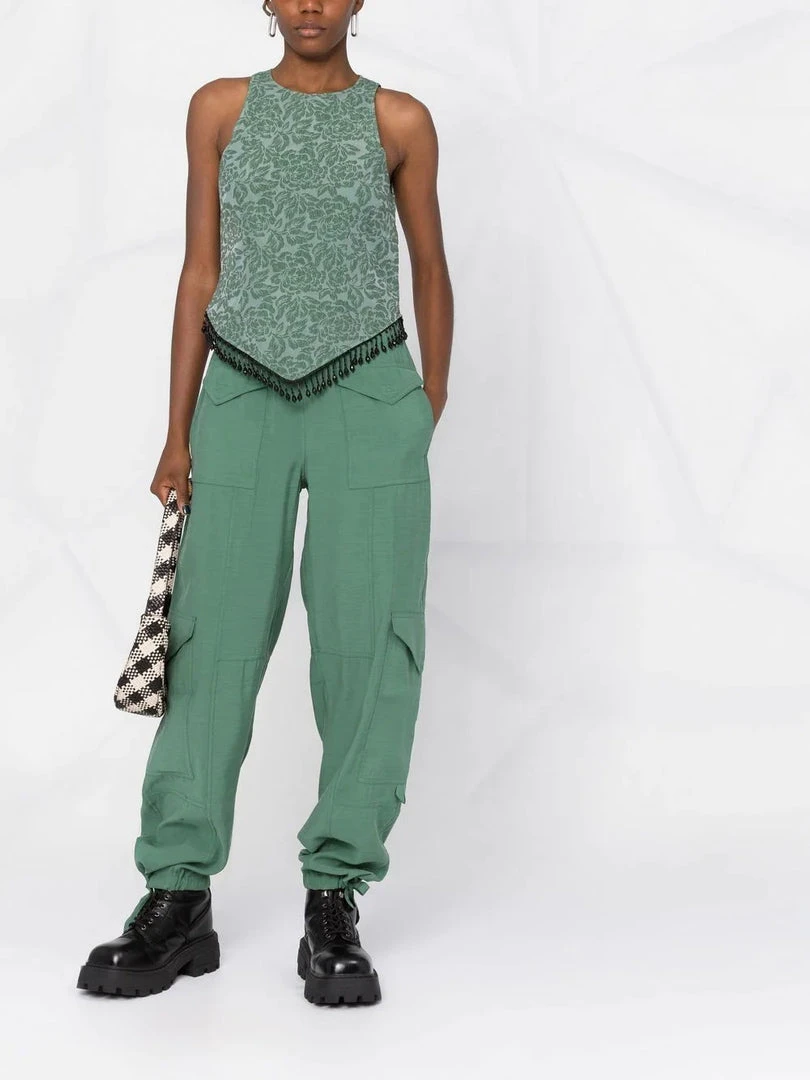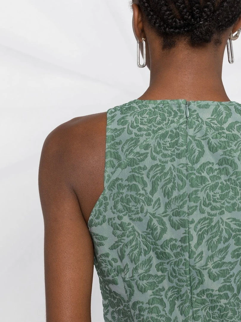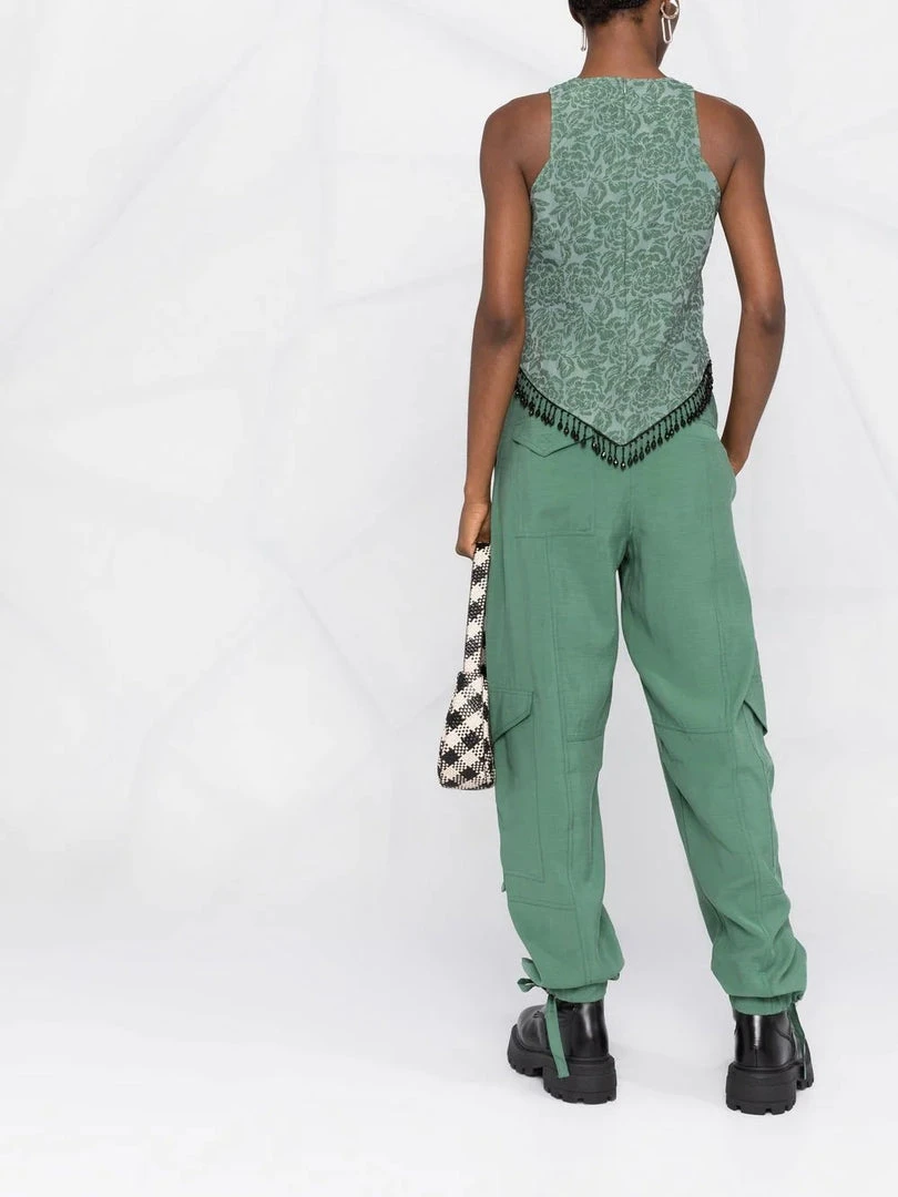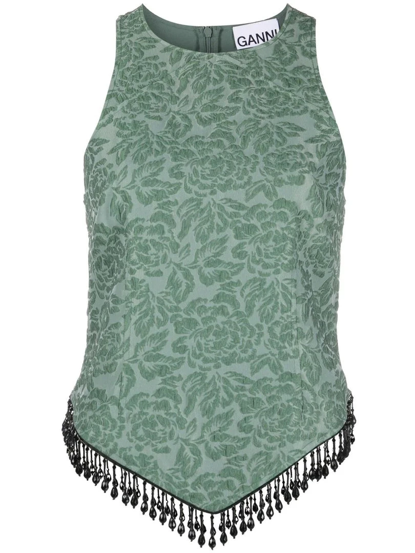 Ganni green ‘Beaded Hem Sleeveless Top’ featuring a round neck, a jacquard design, a pointed hem with black bead detailing and a concealed back zip fastening. Item fits true to size. Model is wearing a size 36 FR.Â