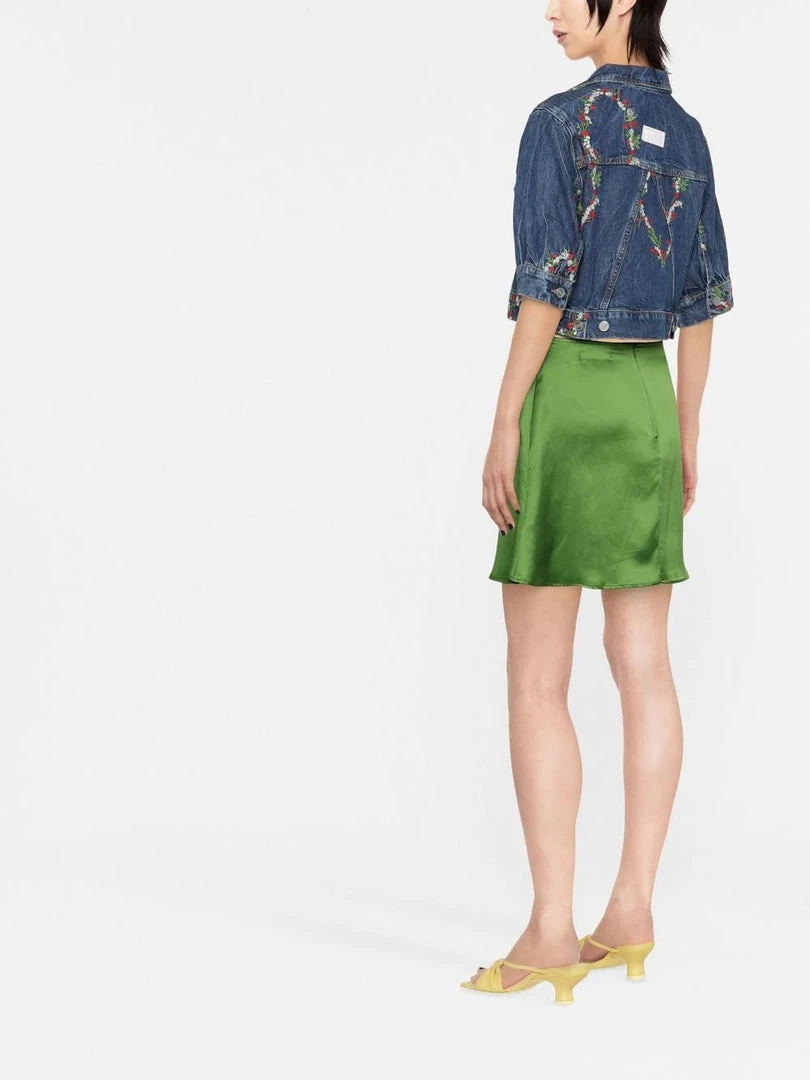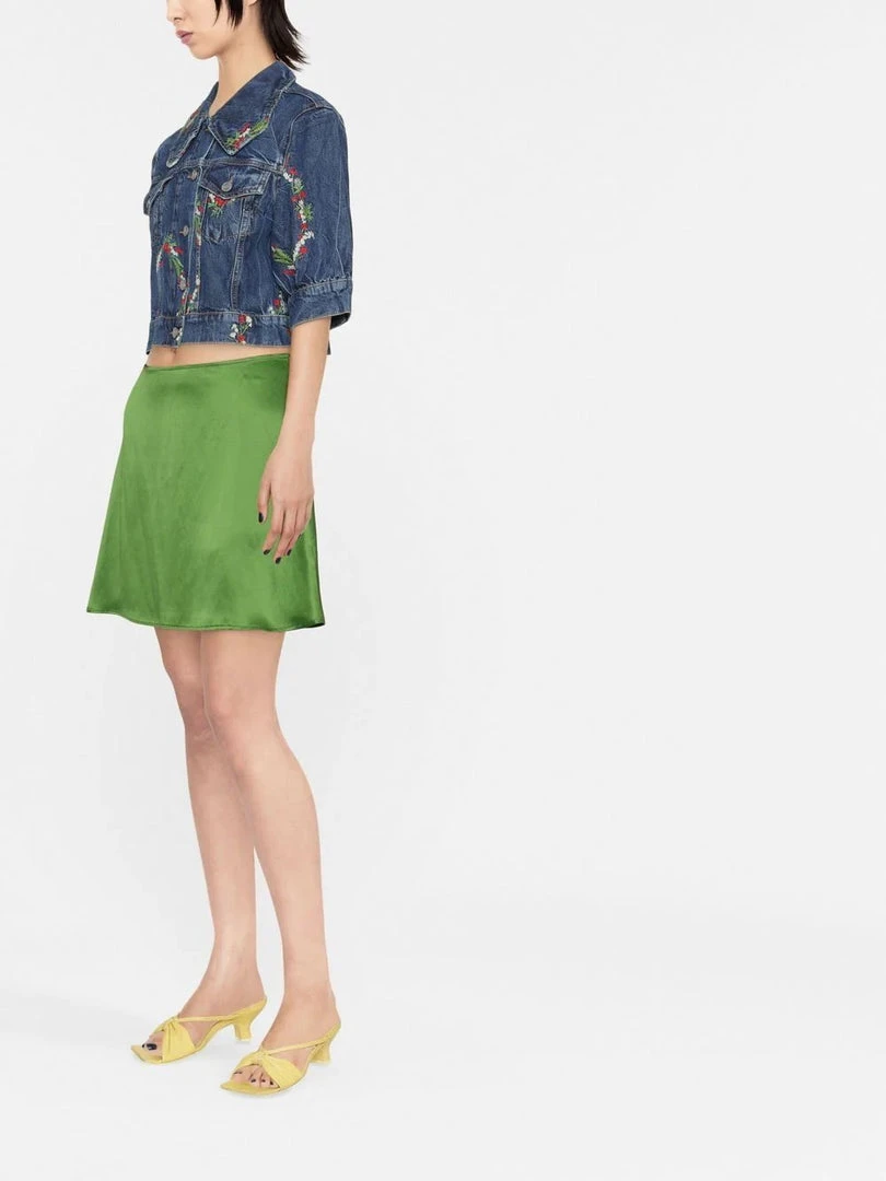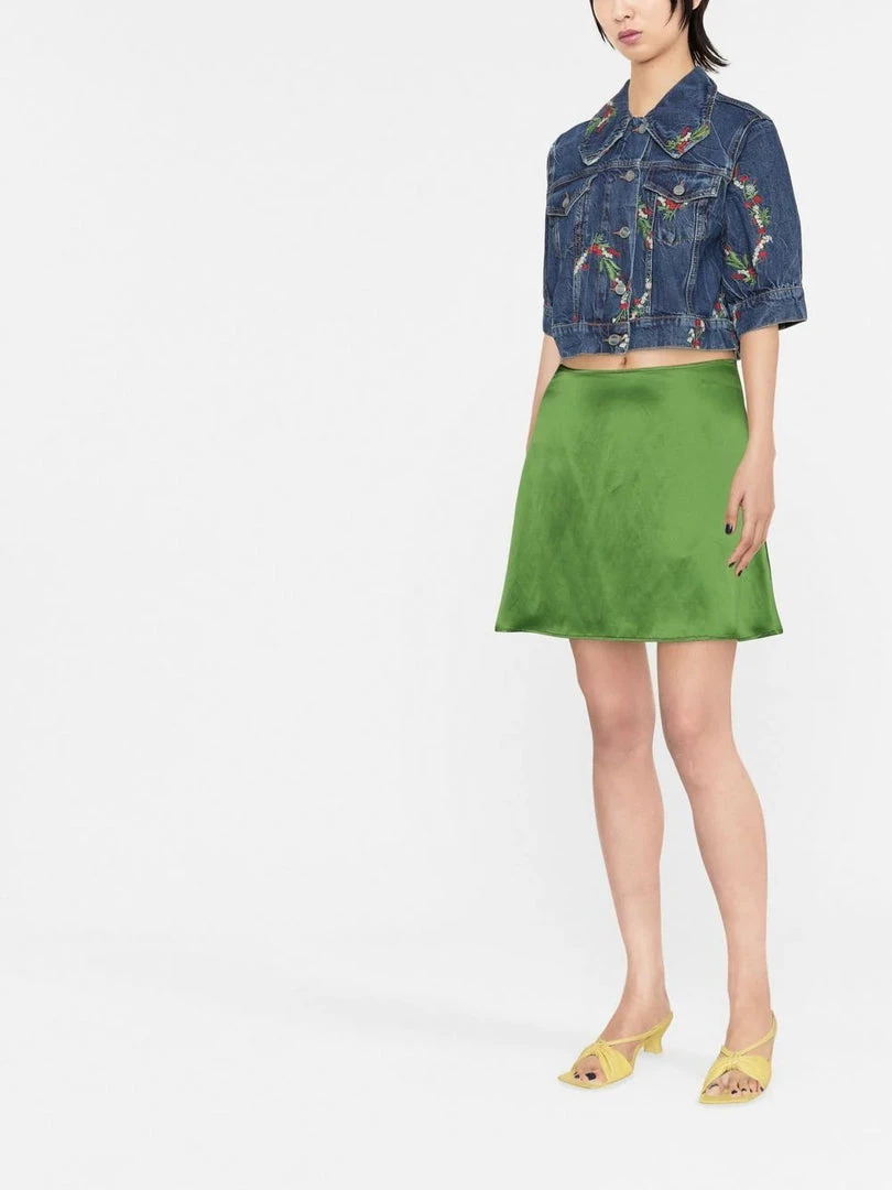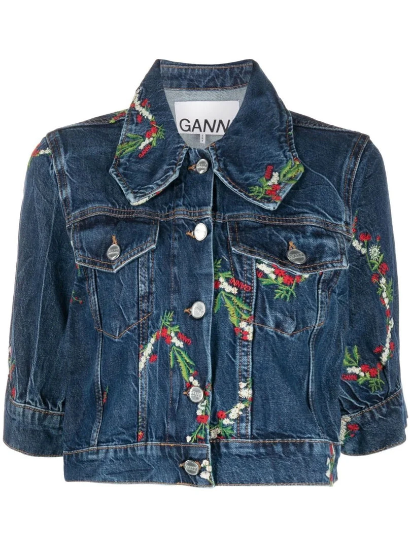 Ganni blue ‘Floral Embroidered Cropped Denim Jacket’ featuring a collared design, front button fastenings, a floral and logo detailed embroidery, short sleeves with buttoned cuffs, front flap pockets and a logo patch on the back. Item fits true to size. Model is wearing a size 36 FR.Â