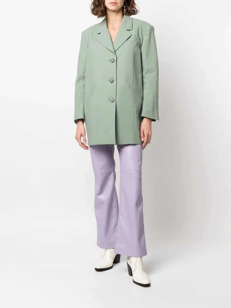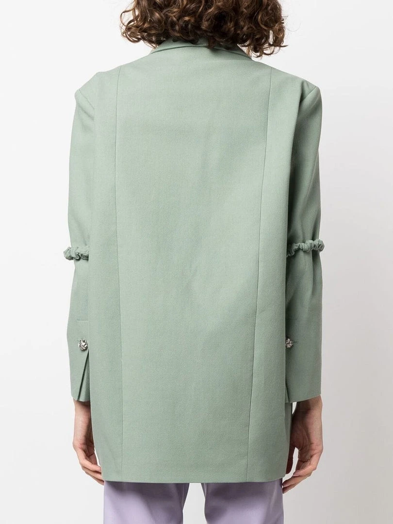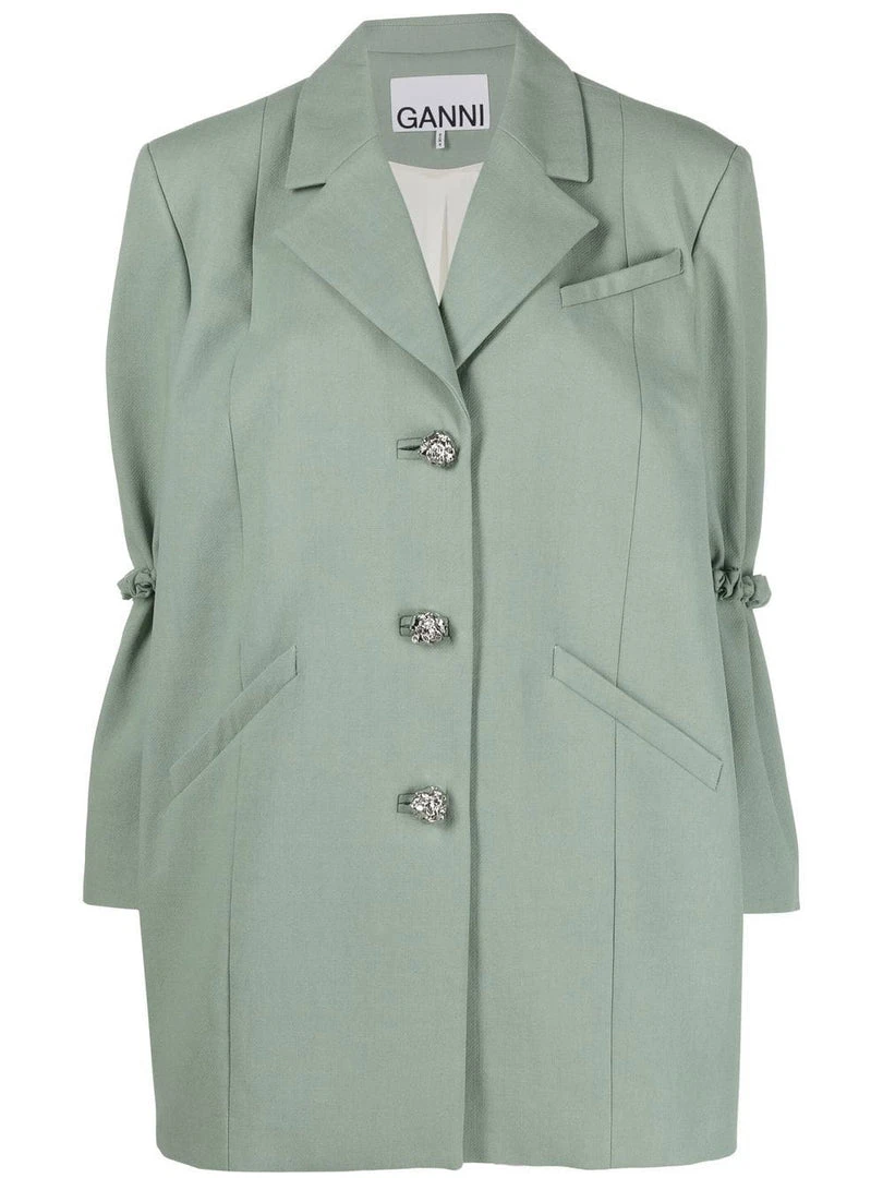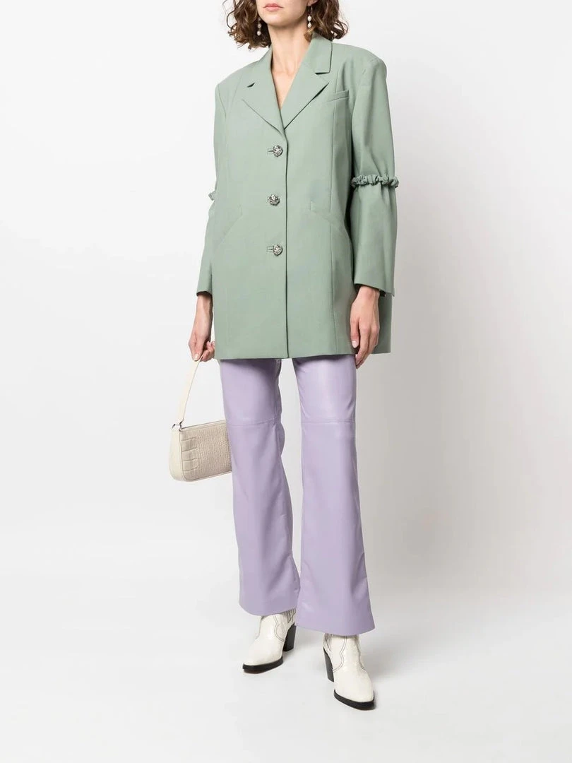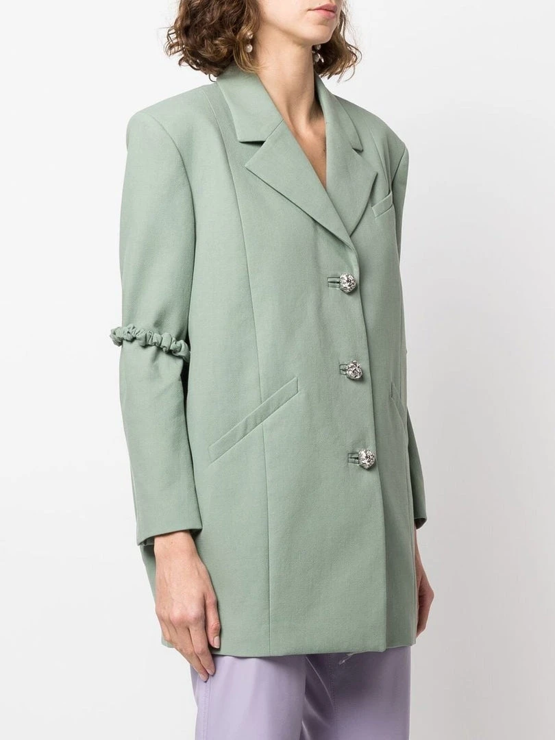 Ganni green ‘Oversized Single Breasted Blazer’ featuring lapels, front button fastenings, padded shoulders, long sleeves with detachable crinkle detailed elbows, buttoned cuffs, a front three pocket design, an inner slip pocket, a boxy fit and a midi length. Model is wearing a size XXS/XS.
