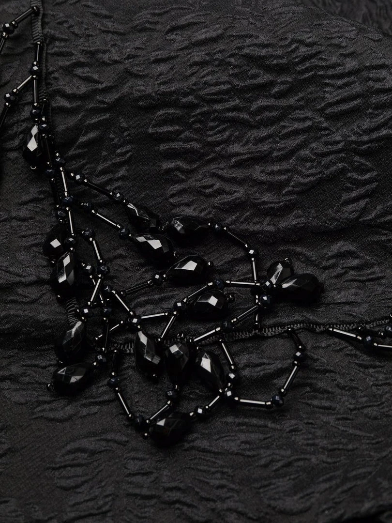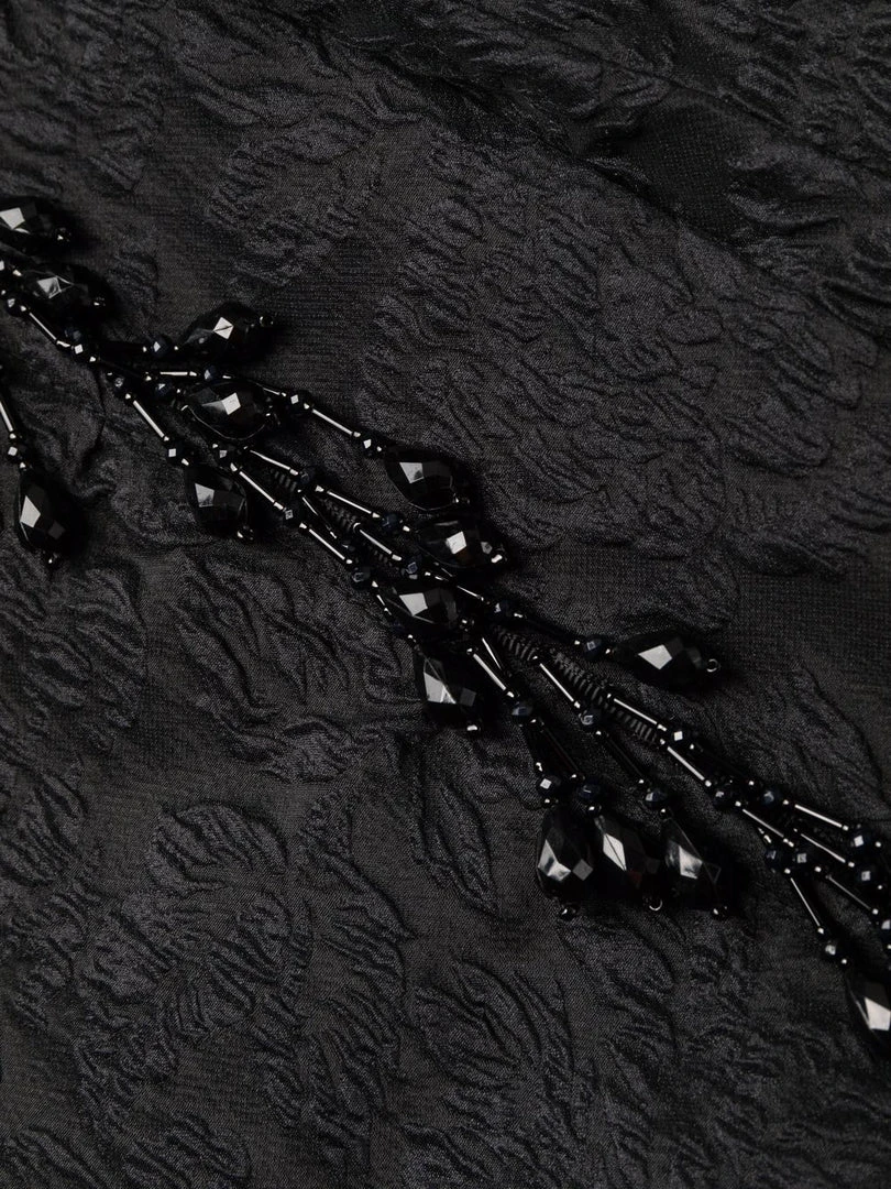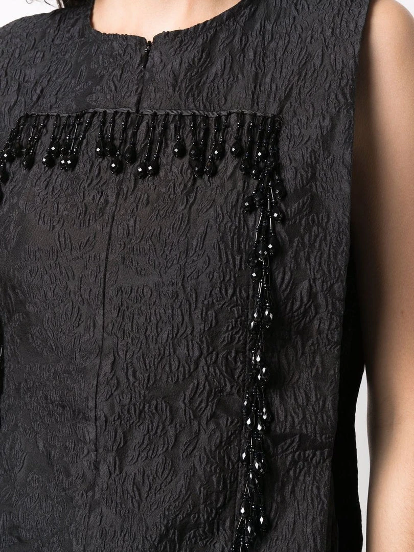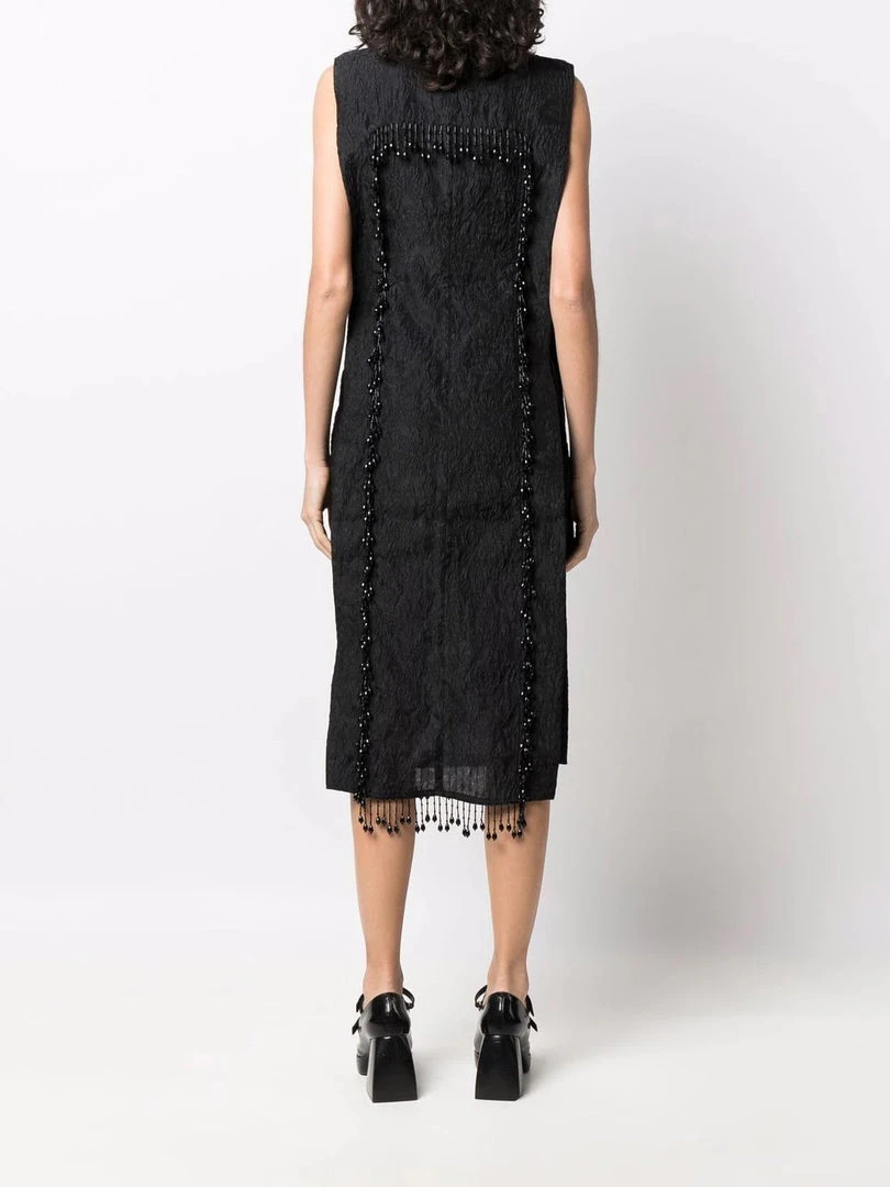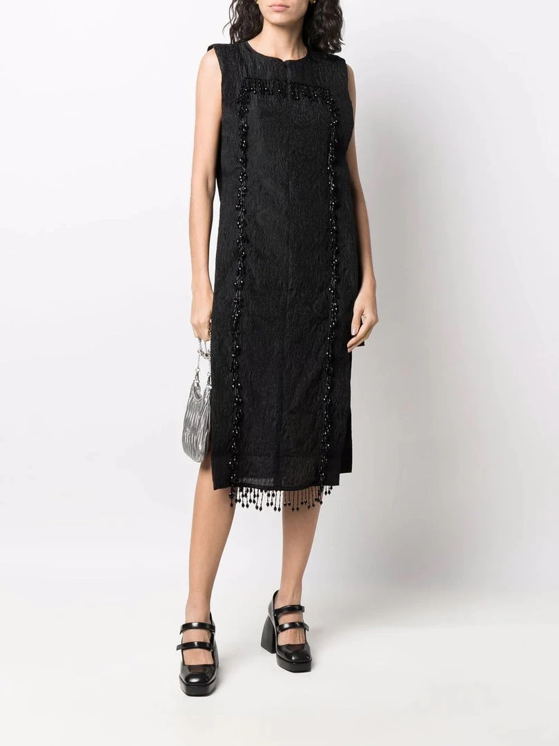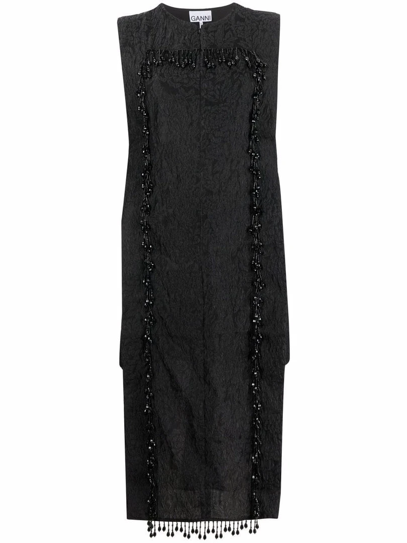 Ganni black ‘Panelled Jacquard Tassel Midi Dress’ featuring a round neckline, a front zip fastening, a sleeveless design, midi length layered front and back panels, short side panels, a floral textured jacquard print and black tassel details. Item fits true to size. Model is wearing a size 36 FR.Â