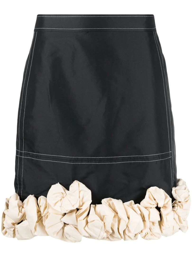 Ganni black ‘Ruffled Trim Skirt’ featuring a high waist fit, a back zip fastening, a cream 3D ruffled hem, contrasting white stitch detailing and a short length. Â Item fits true to size. Model is wearing a size 36 FR. Â