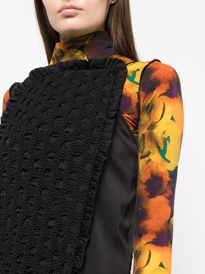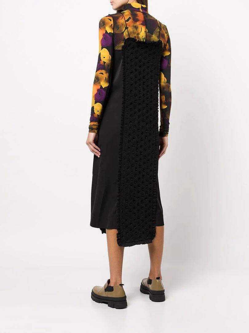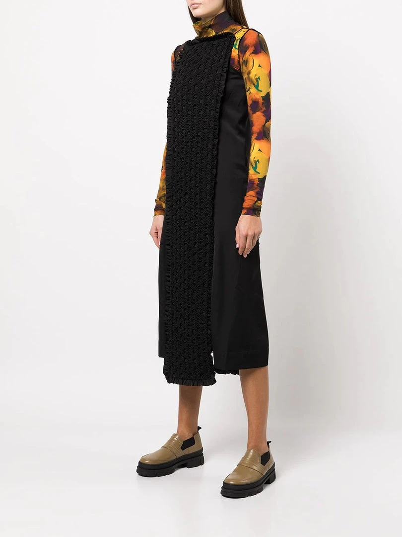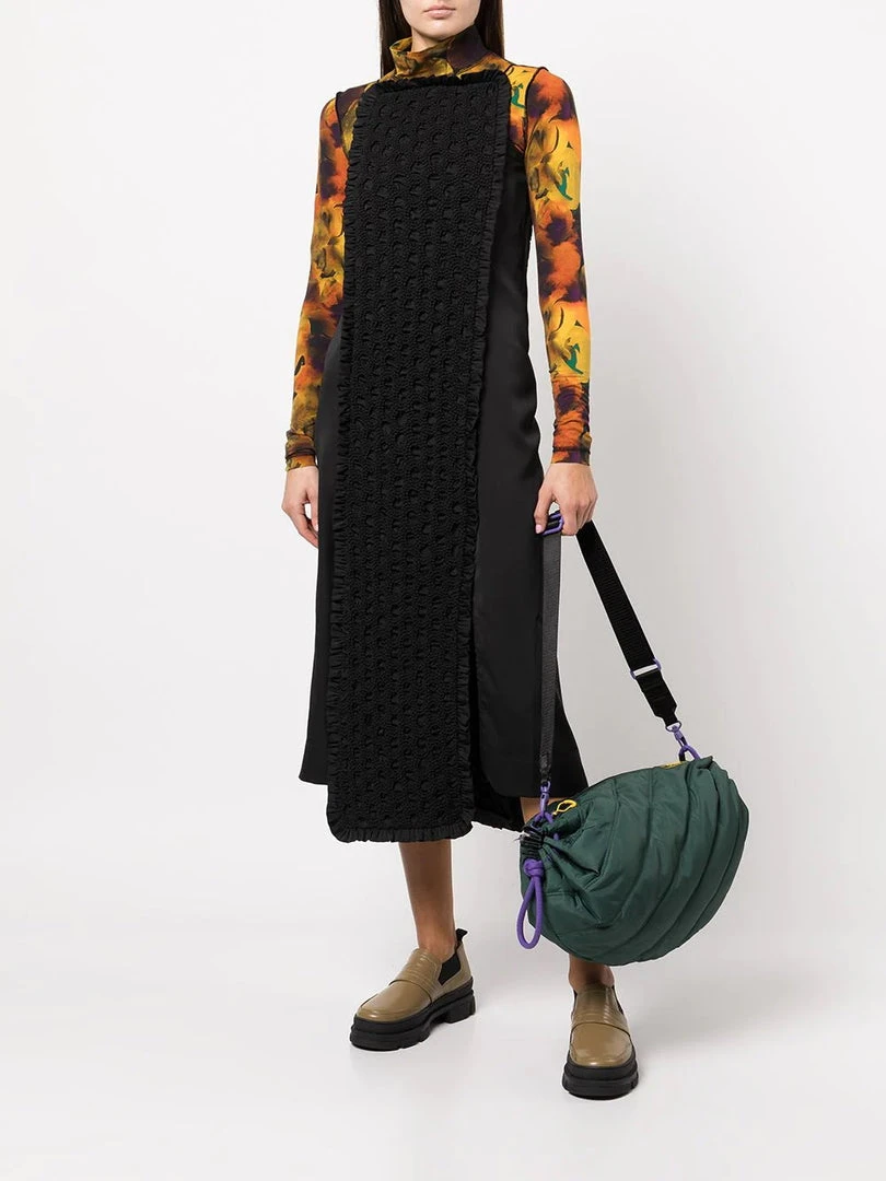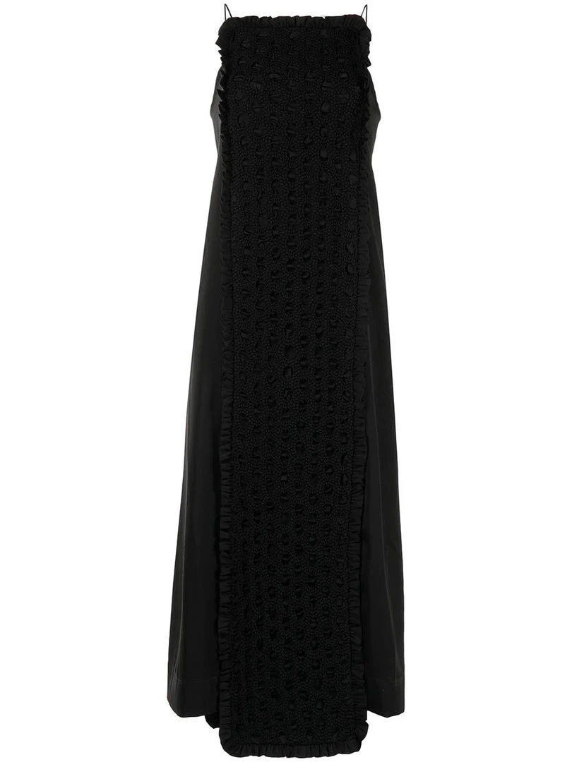 Ganni black ‘Smock Panelled Midi Slip Dress’ featuring adjustable spaghetti straps, a square neckline, elasticated circle smocked front and back panels, side slits, plain satin side panels, ruffled trimming, a midi length and pulls on. Item fits true to size. Model is wearing a size 36 FR.Â