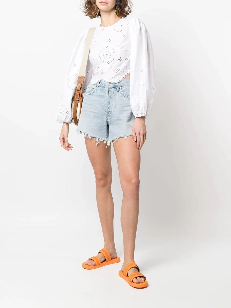 Ganni white ‘Broderie Anglaise Blouse’ featuring a round neck, a back zip fastening, pleated shoulders, long puffed sleeves with elasticated cuffs, a scalloped hem and a slightly cropped fit. Item fits true to size. Model is wearing a size 36 FR.