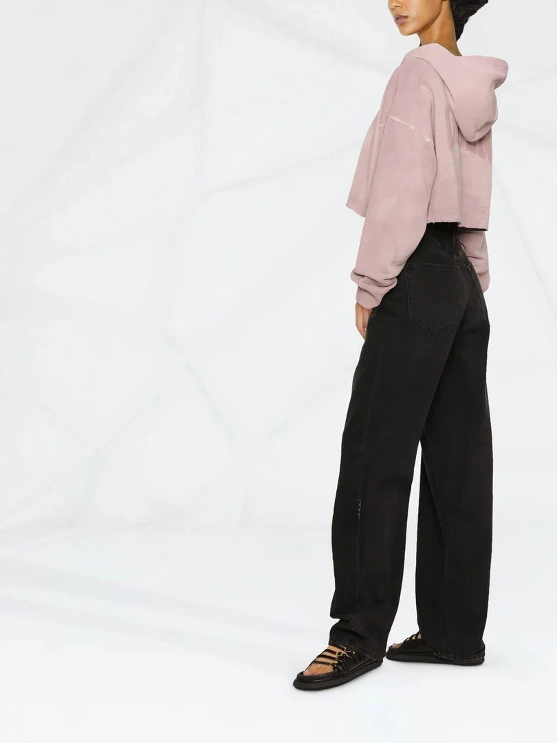 Golden Goose dusty pink ‘Distressed Cropped Hoodie’ featuring a drawstring hood, a front zip fastening, long sleeves, ribbed cuffs, a raw hem finish, a distressed design, a faint logo graphic on the back and a cropped fit. Item fits true to size. Model is wearing a size S.