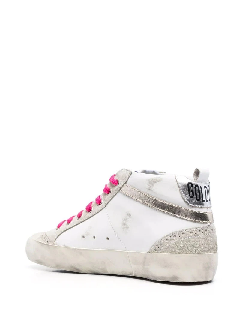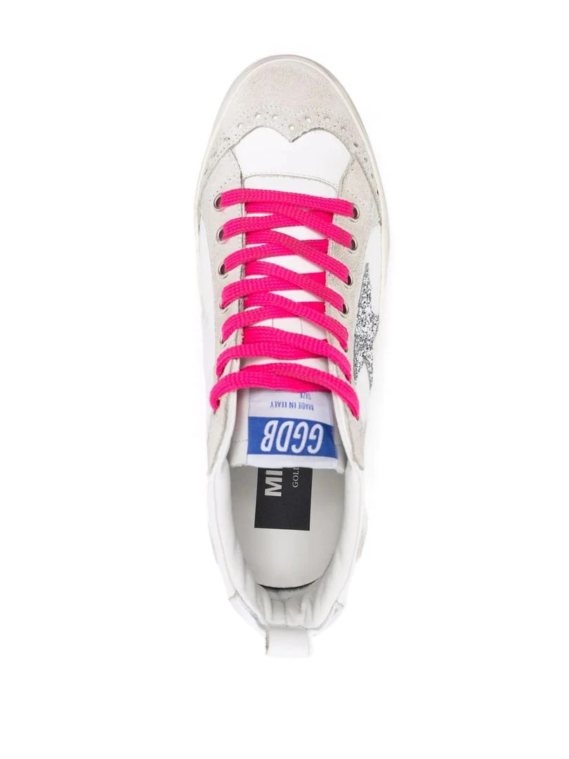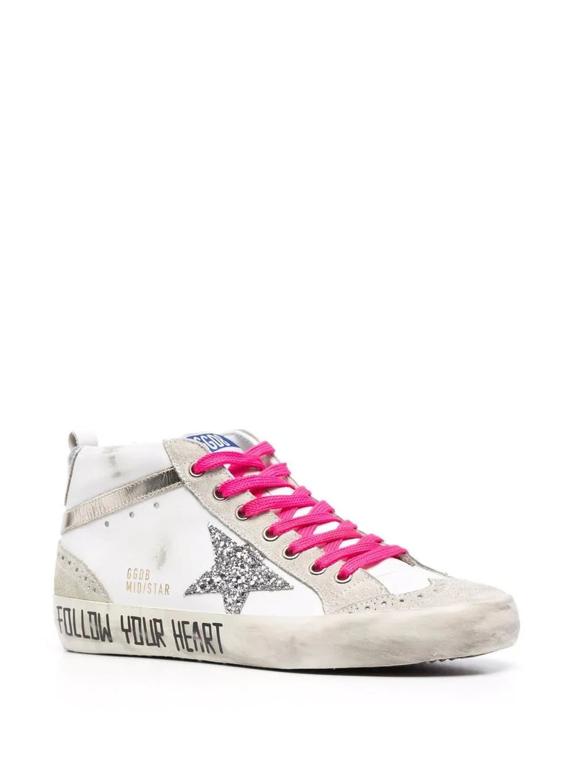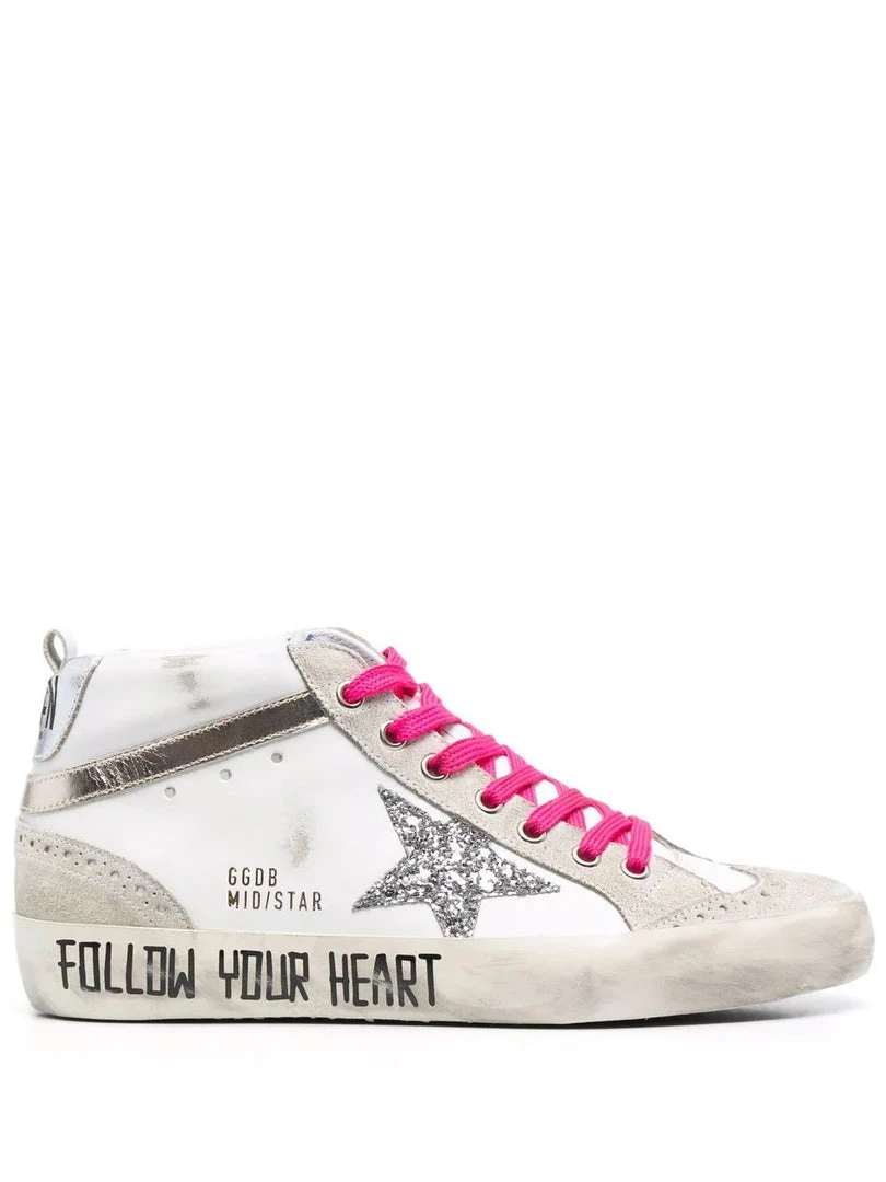 Golden Goose white and silver ‘Follow Your Heart’ trainers featuring a round toe, a contrasting hot pink lace up fastening, a signature silver glitter star to the side, a branded tongue and insole, a ‘Follow Your Heart’ slogan on the sole, a gold embossed logo detail to the side, a silver metallic branded heel counter and a distressed finish. Made in Italy. Italian Sizing. Item fits true to size.Â