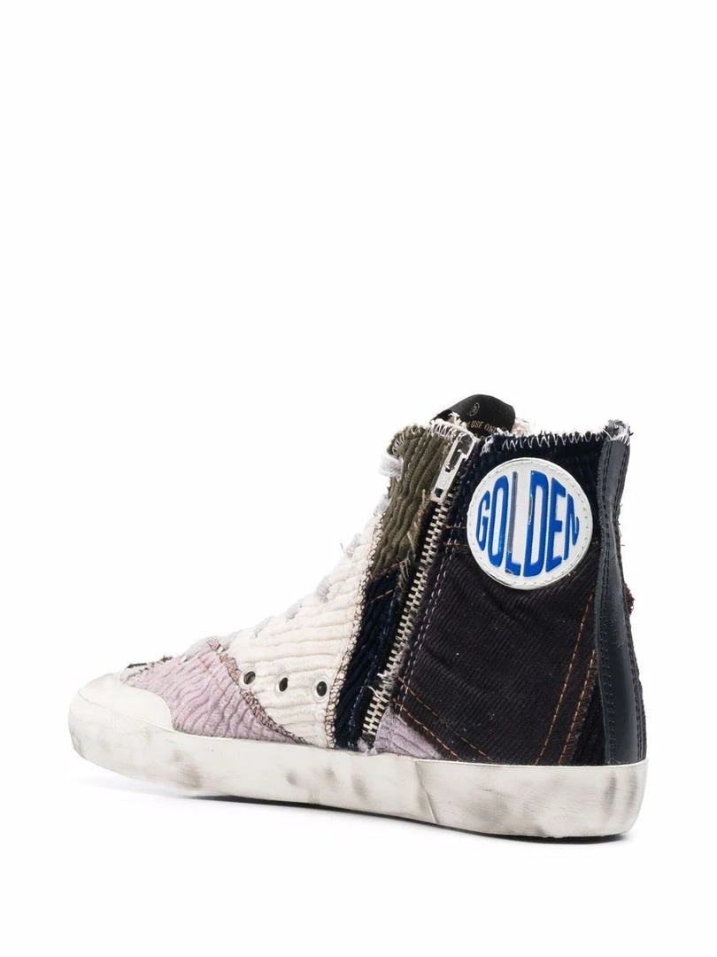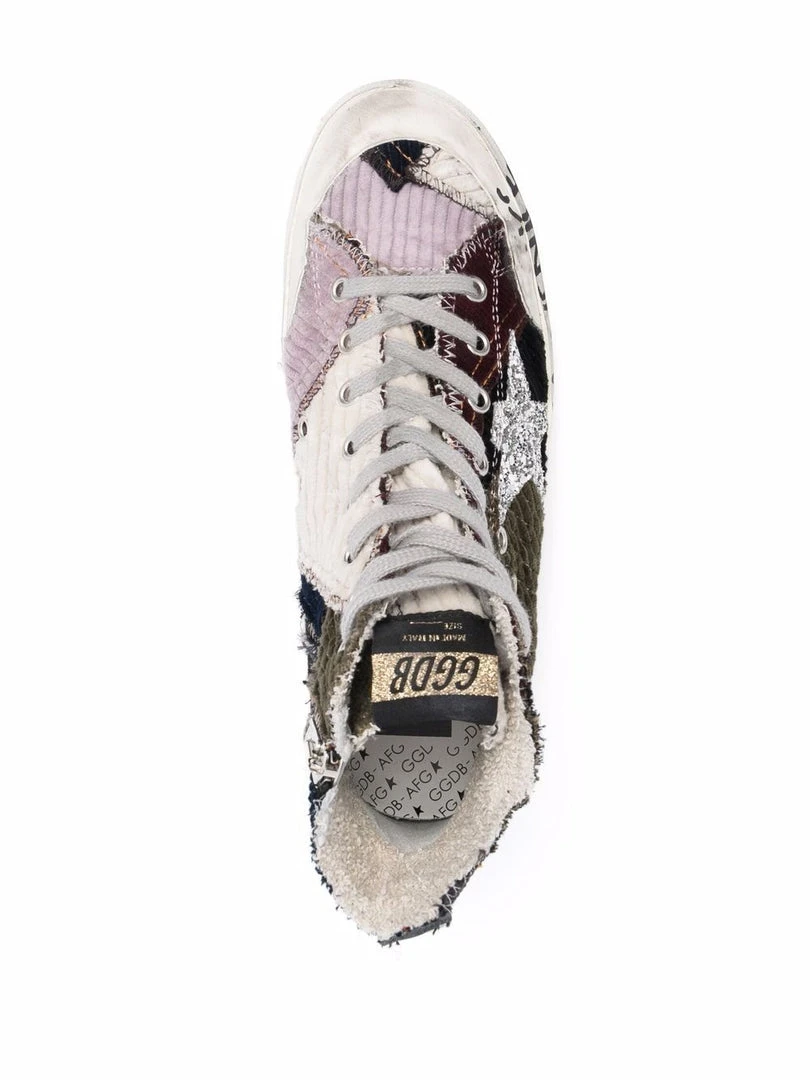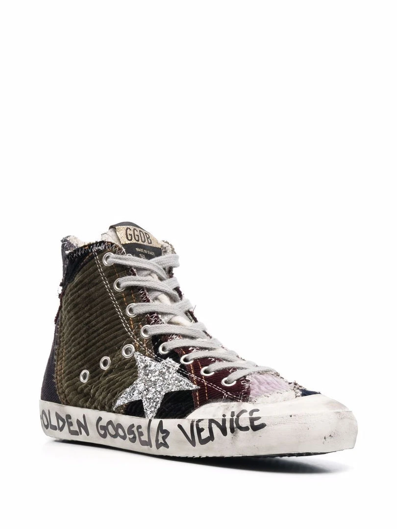 Golden Goose ‘Francy Penstar’ patchwork high top sneakers featuring a round toe, a front lace-up fastening, an inner side zip closure, a silver glitter signature star detail on the outer side, a brand logo rubber patch on the inner heel, a multicoloured velvet corduroy patchwork design, a ‘Golden Goose Venice’ graphic on distressed soles and a high top style. Item fits true to size. Italian Sizing. Made in Italy.