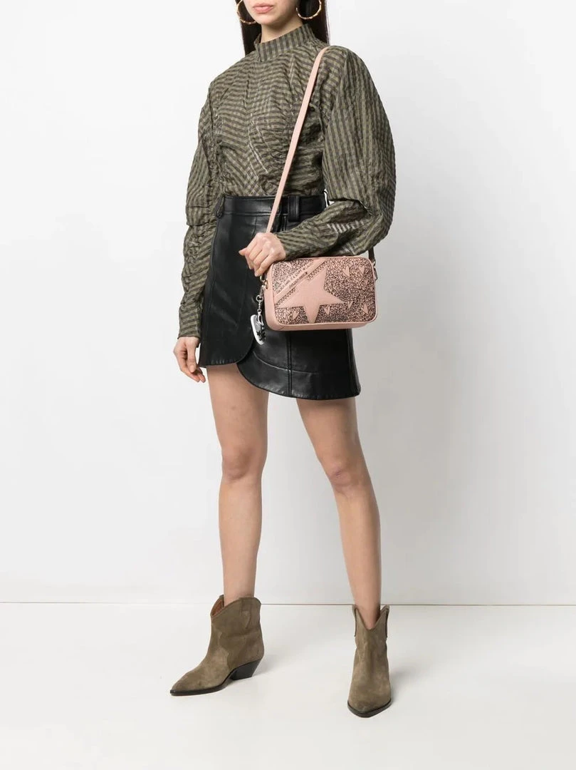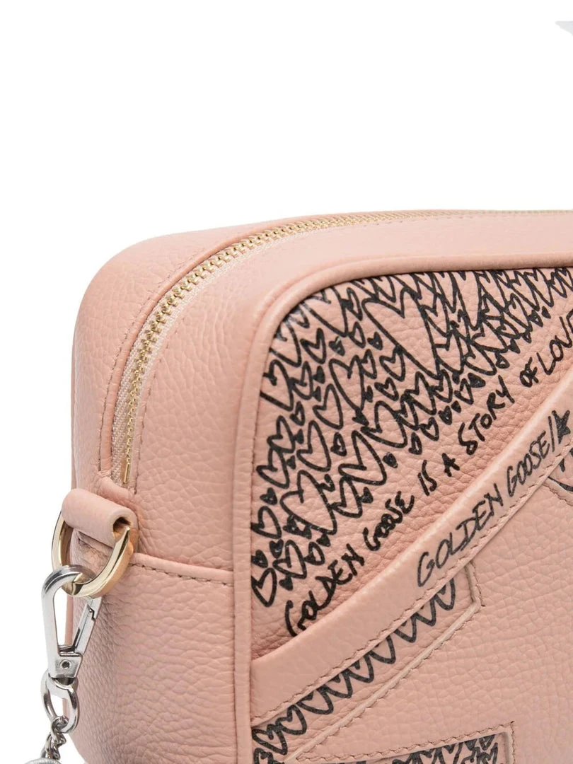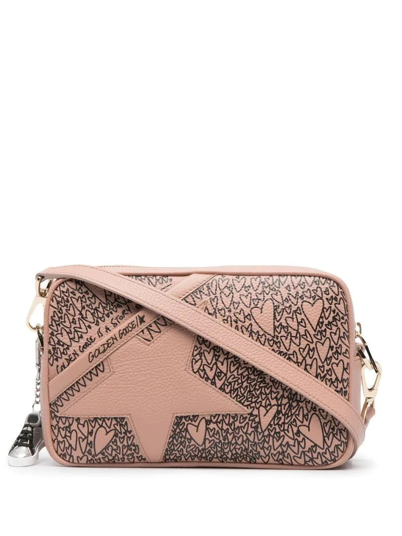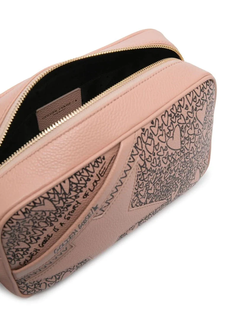 Golden Goose nude ‘Heart Detailed Bag’ featuring a front slip logo detailed pocket, a repeated drawn heart design, a signature star patch on the front, a top zip fastening and a detachable shoulder strap. Made in Italy.