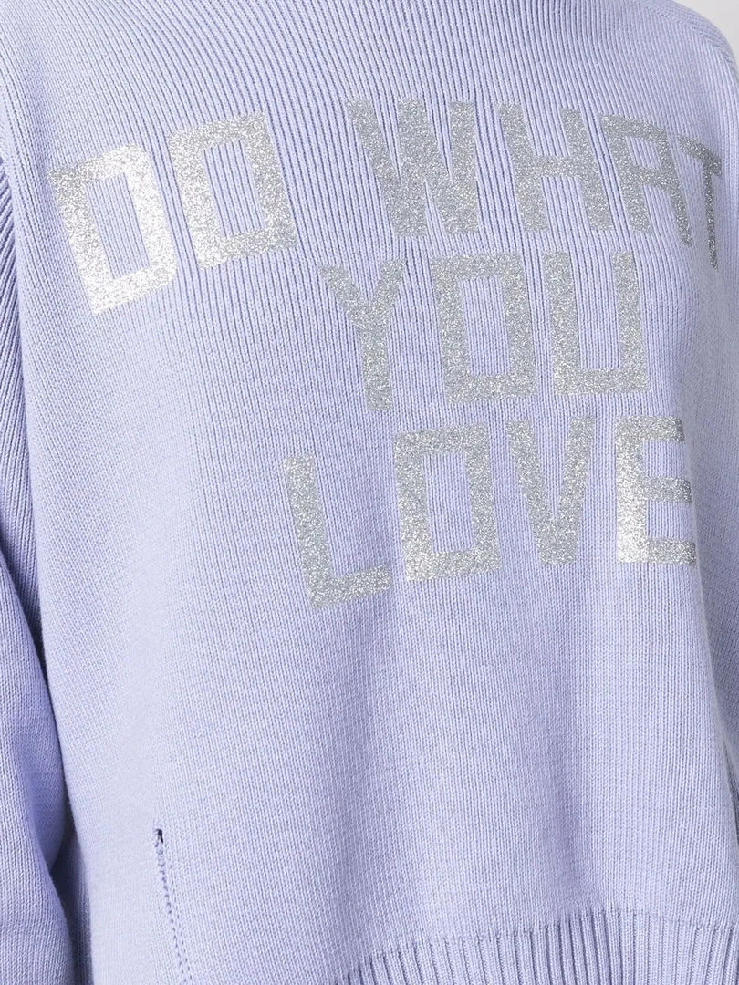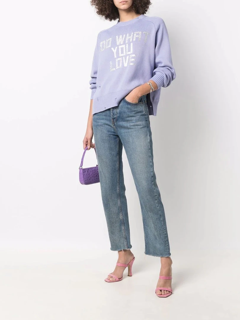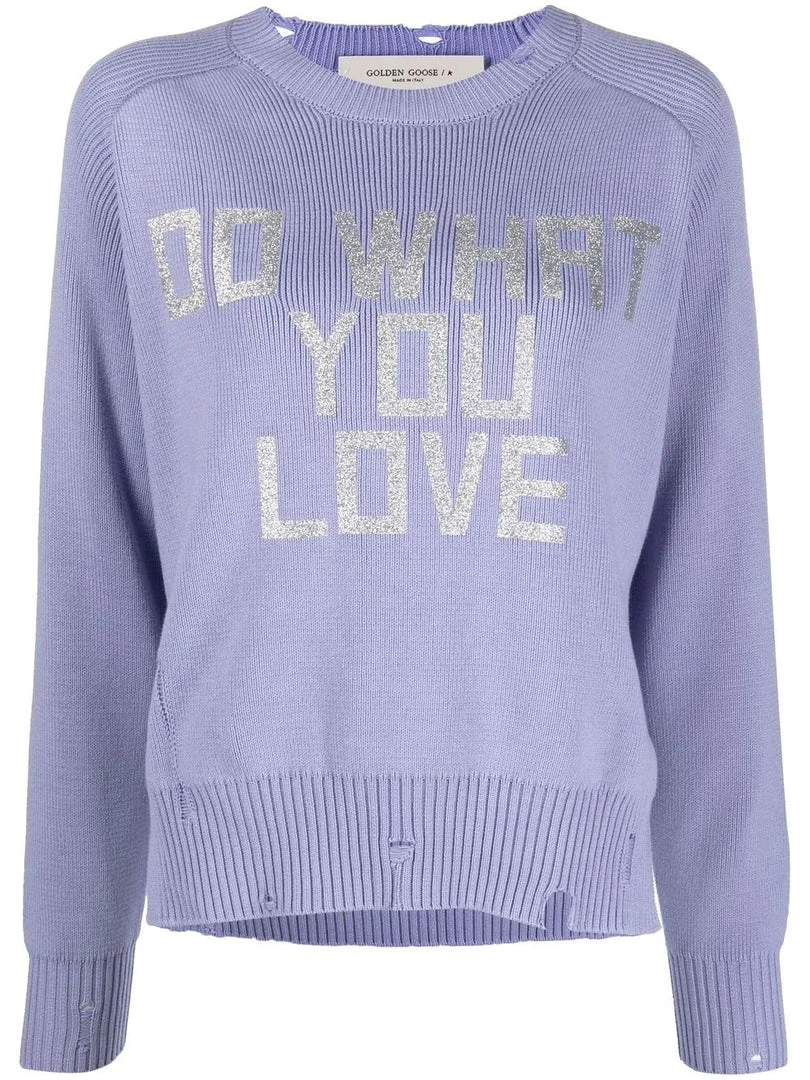Golden Goose lilac ‘Delilah’ ribbed knit slogan sweater featuring a crew neckline, long sleeves, a ‘Do What You Love’ silver glitter slogan on the front, side slits, distressed details, a ribbed knit and pulls on. Item fits true to size. Model is wearing a size S.