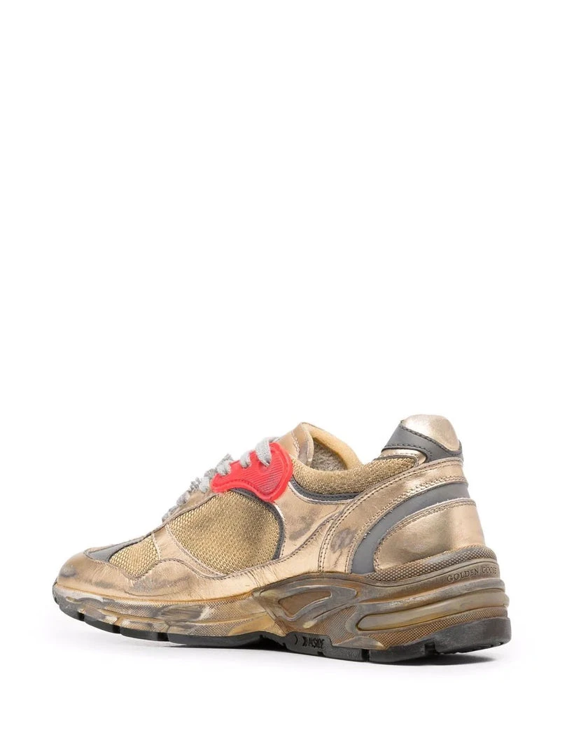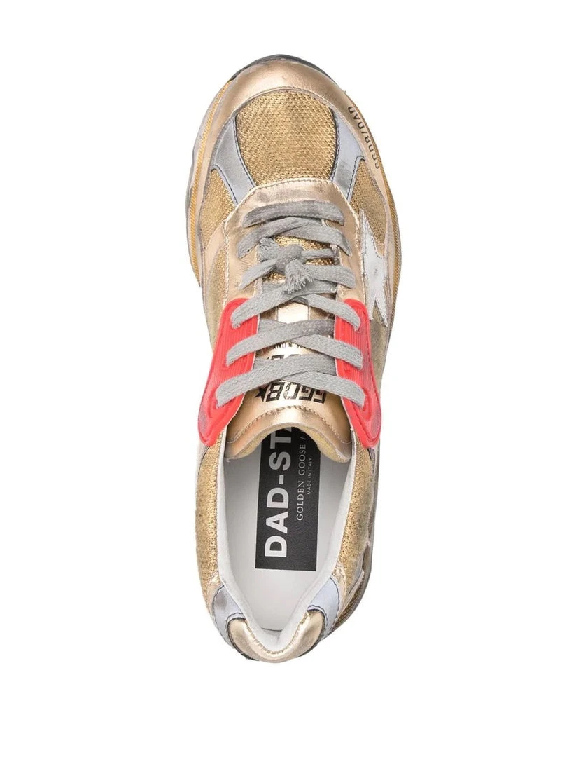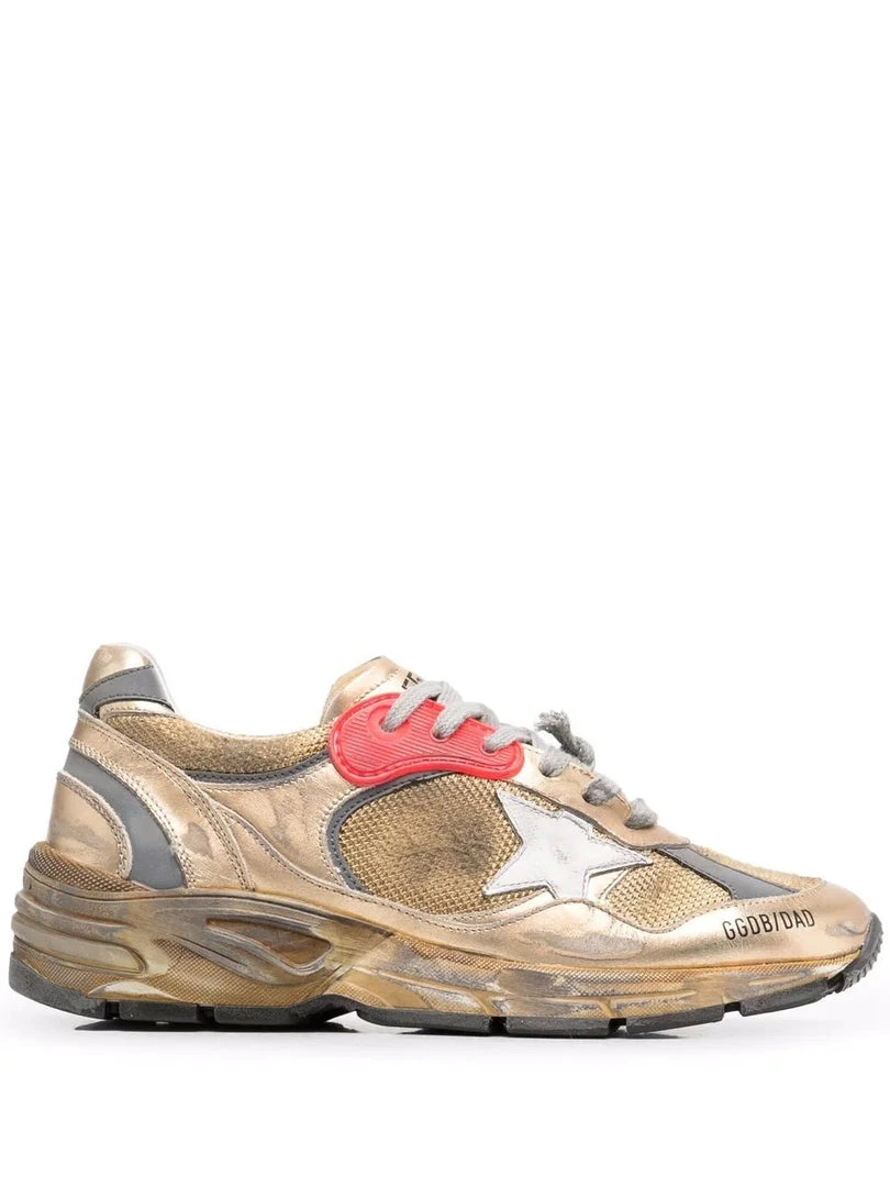 Golden Goose ‘Dad-Star’ distressed gold sneakers featuring a round toe, a front lace-up fastening, red rubber lace hole details, a white signature star detail on the side, a black embossed brand logo on the front side, very distressed signature detailing, a chunky sole and a low top style. Item fits true to size. Italian Sizing. Made in Italy.