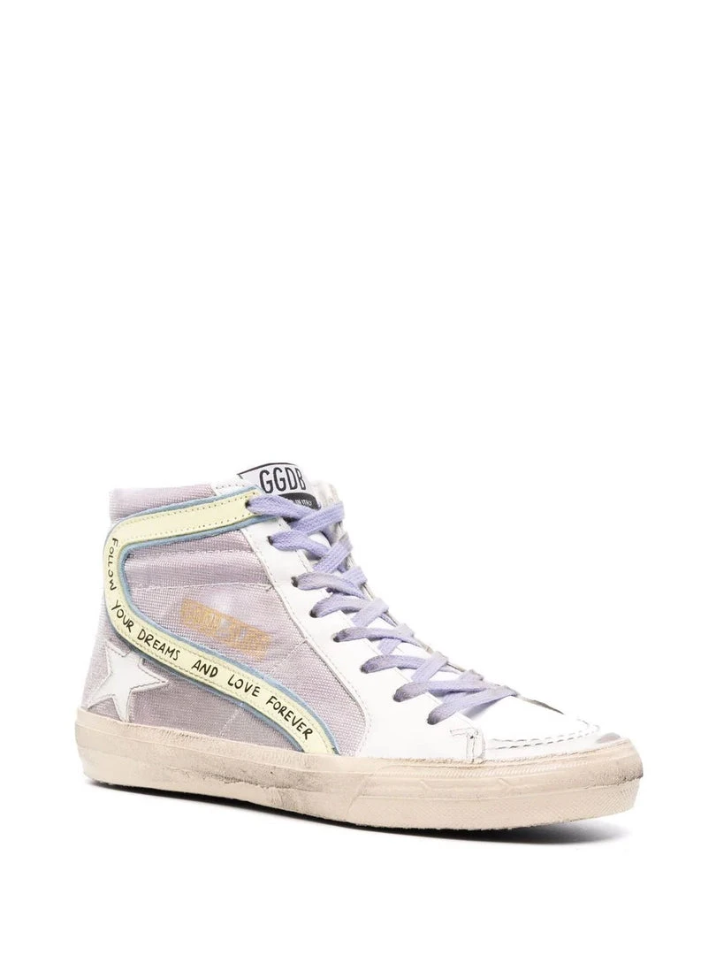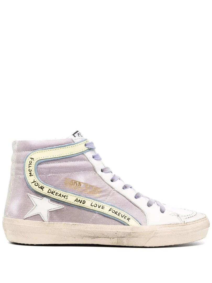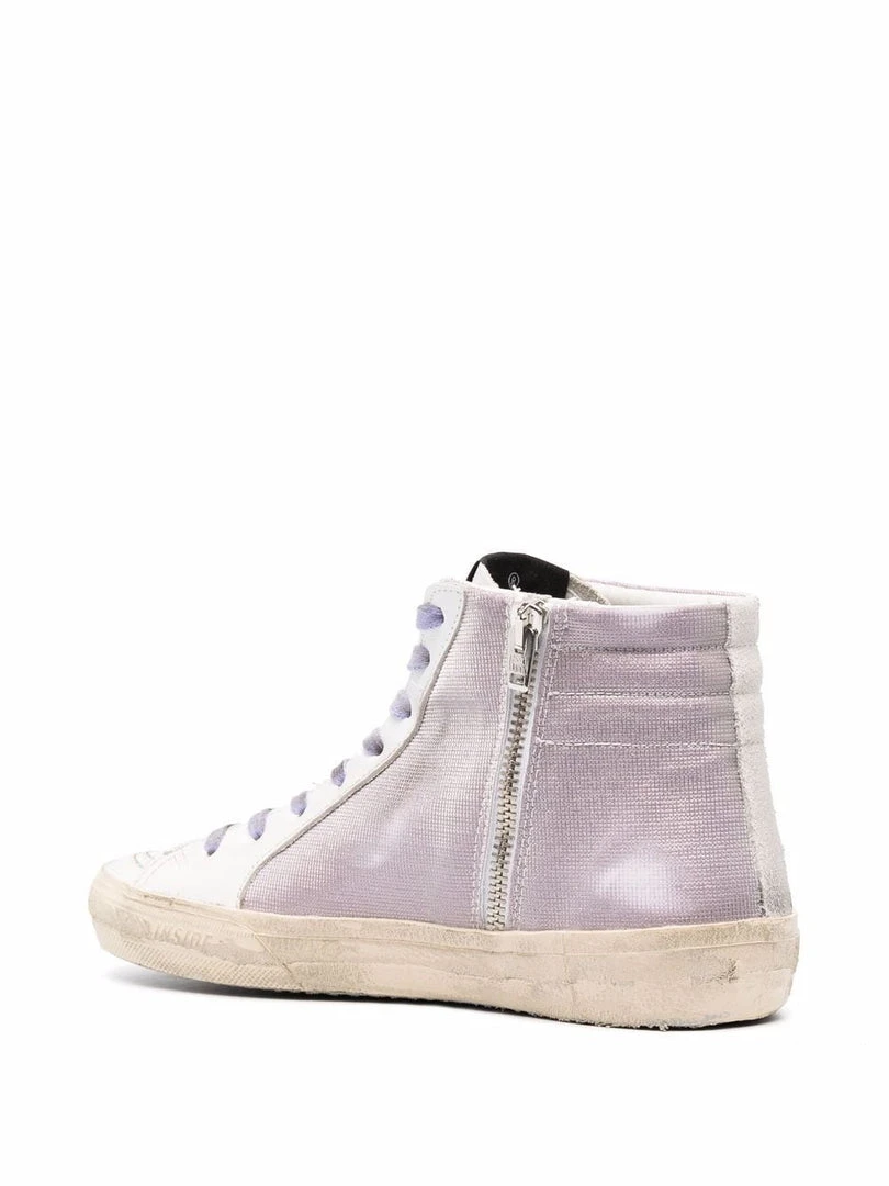 Golden Goose ‘Lilac Glitter Shearling Slide Sneakers’ featuring a round toe, a lace-up fastening, glitter mesh effect details, a gold branded ‘Slide’ embossed design on the side, a white signature star on the outer side, a hand written slogan detail, an inside zip fastening, a mid high-top style, a distressed look and a detachable shearling sole insert. Item fits true to size. Italian Sizing. Made in Italy.