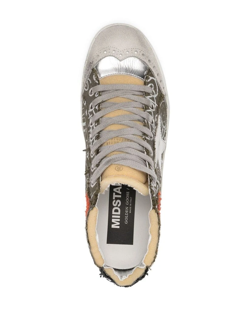 Golden Goose khaki ‘Mid Star’ doodle print sneakers featuring a round toe, a metallic front, a foam tongue, a lace up fastening, a doodle graffiti style print, a signature white star design on the side, a gold embossed logo on the side, a branded curved heel counter, a distressed look and a mid high-top style. Item fits true to size. Italian Sizing. Made in Italy.