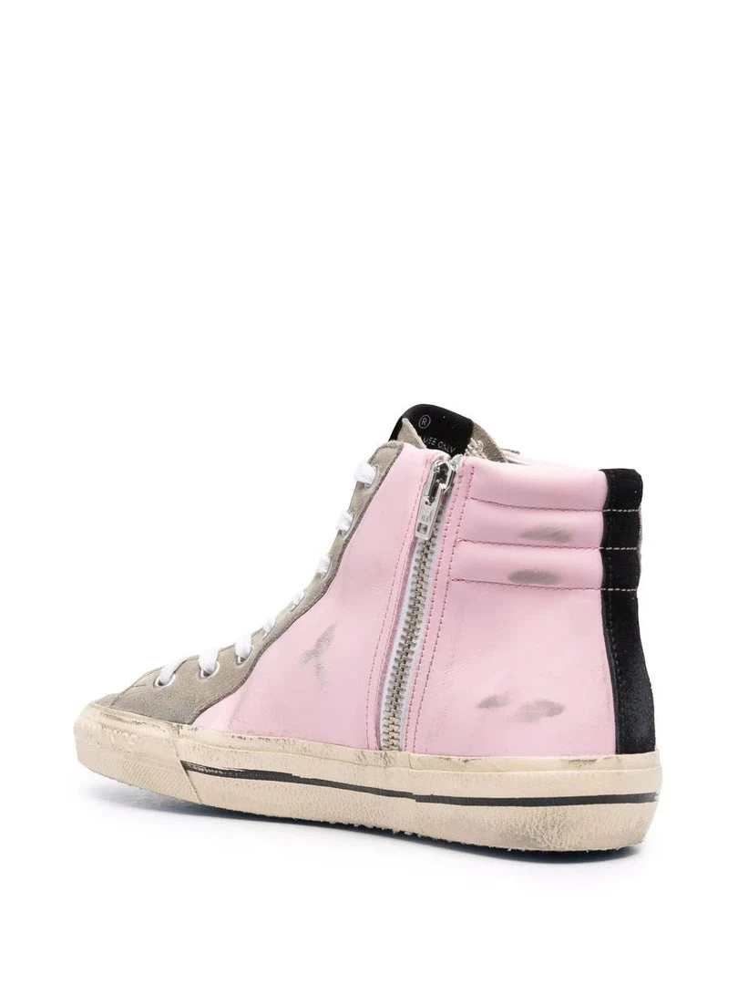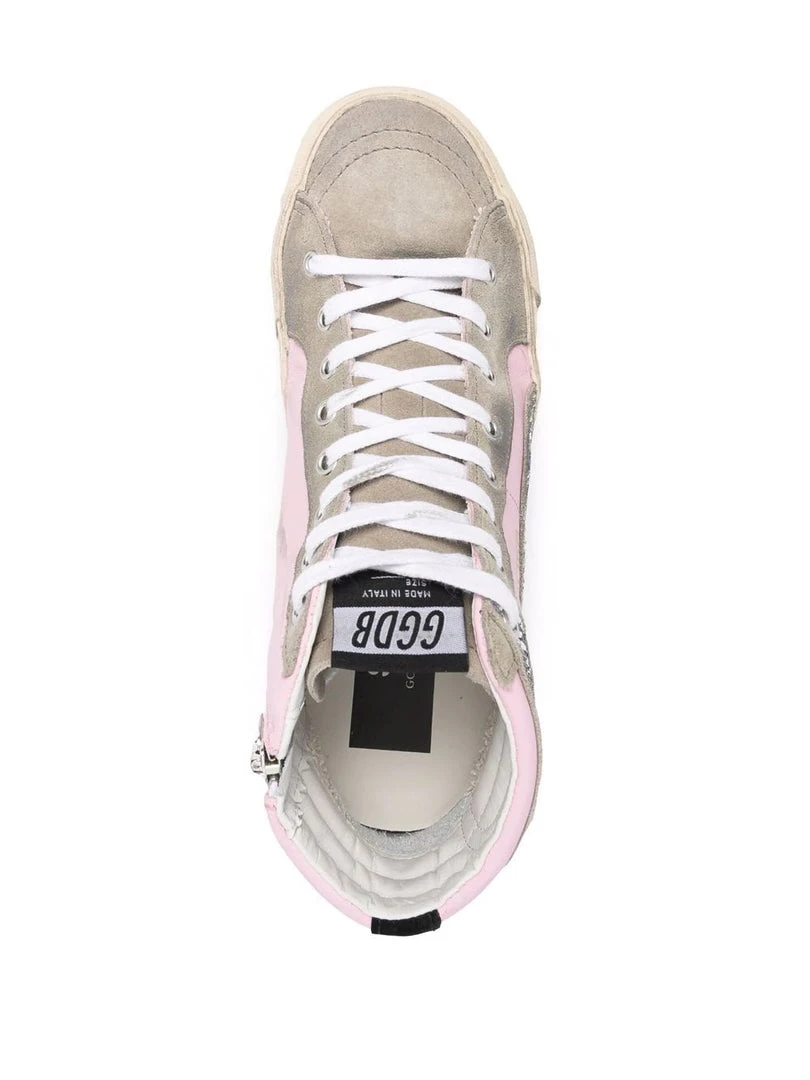 Golden Goose pink ‘Slide’ high top trainers featuring a round toe, a front lace up fastening, an inner side zip closure, a branded tongue and insole, a signature white star design to the side with a gold embossed logo detail, a silver glitter strip, a contrasting black panel at the heel, a black ‘dreamed in Venice’ written text on the sole and a distressed finish. Made in Italy. Item fits true to size. Italian Sizing.