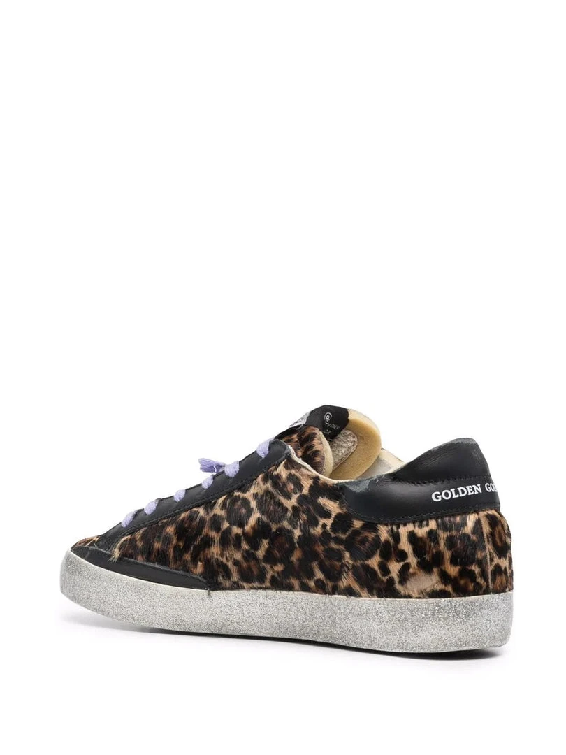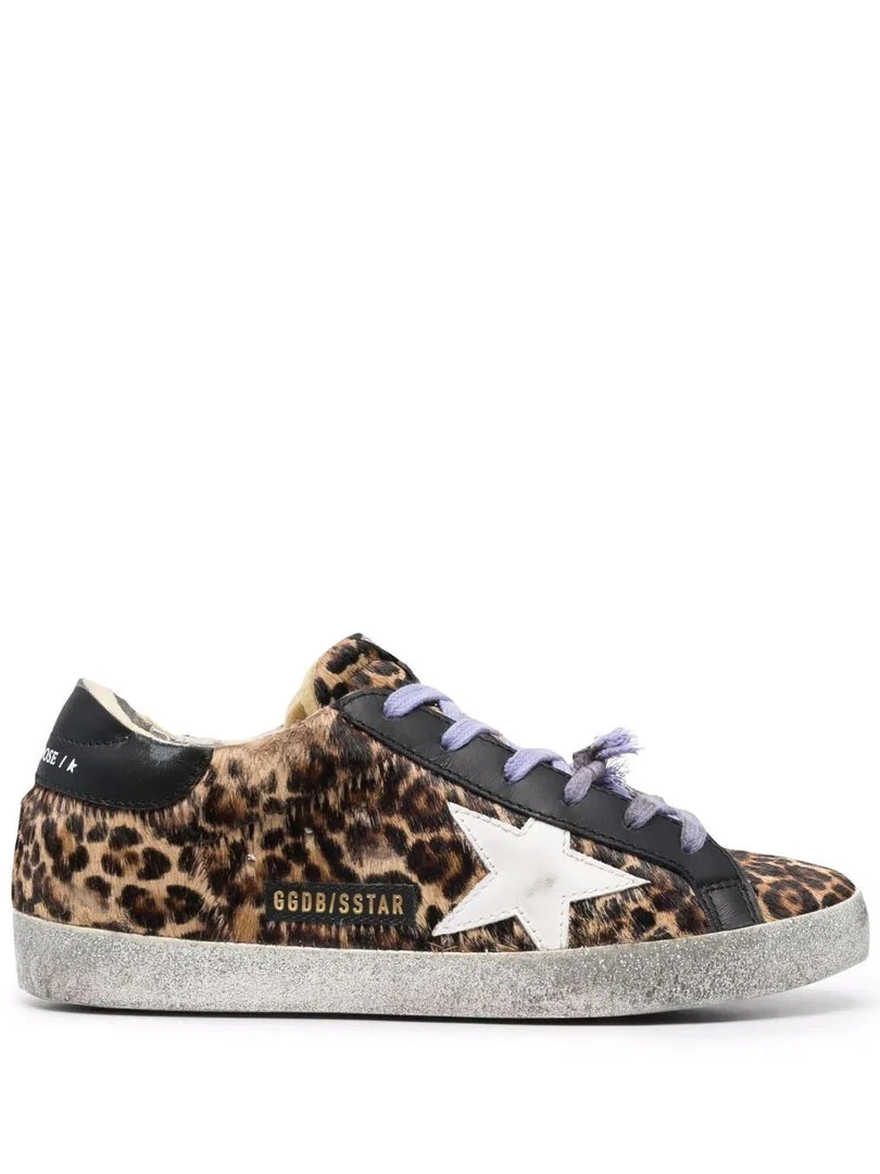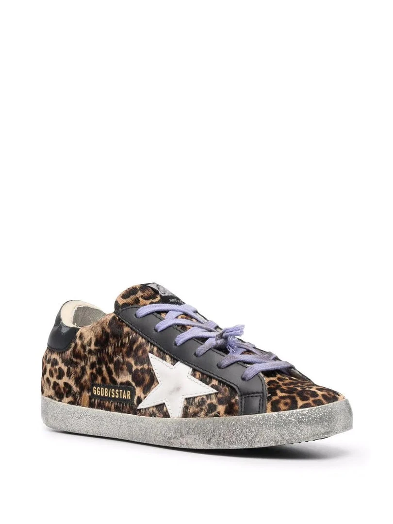 Golden Goose ‘Superstar’ leopard glitter sole sneakers featuring a round toe, a front lace-up fastening with distressed purple laces, a branded tongue, a white signature star detail on the side, a black heel counter with a white brand logo design, open padding detail at the heel, a leopard print design and silver glitter soles. Item fits true to size. Italian Sizing. Made in Italy.