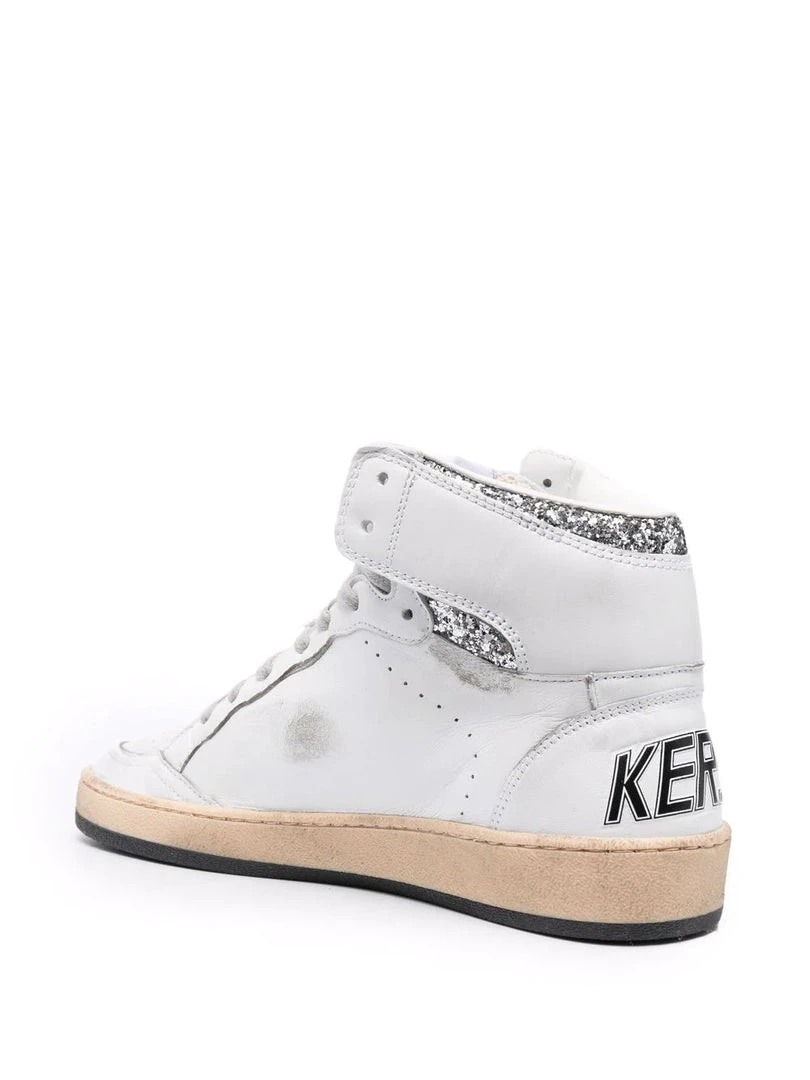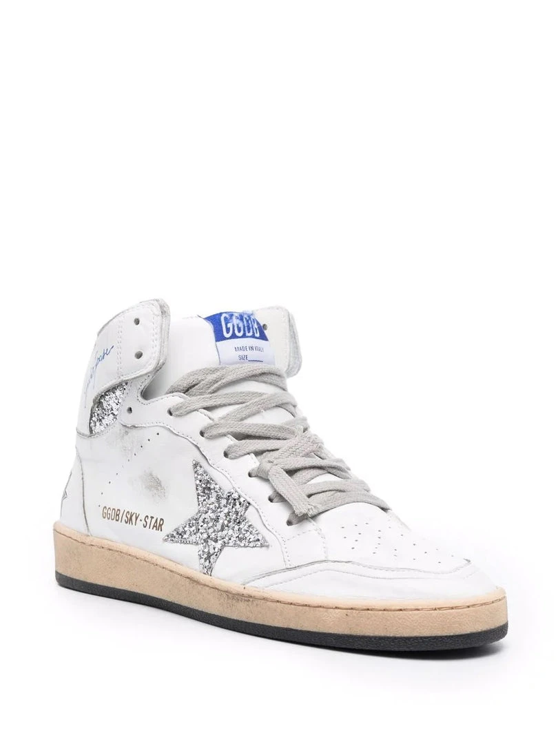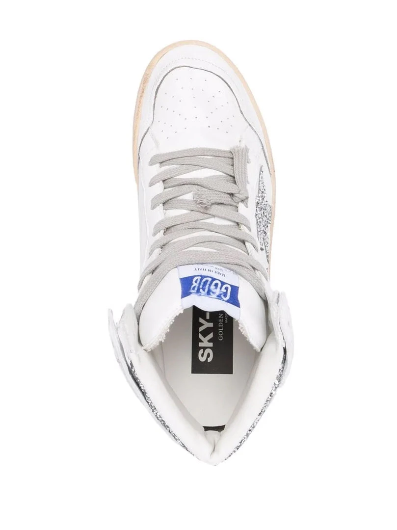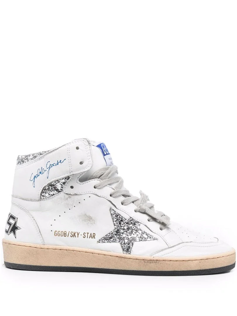 Golden Goose white and silver ‘Star-Patch Lace-up Sneakers’ featuring a round toe, a lace up fastening, a branded tongue and insole, a signature silver glitter star design to the side, a blue ‘Golden Goose’ text on the side, a distressed finish and a ‘sneakers’ slogan on the back. Made in Italy. Italian Sizing. Item fits true to size.Â