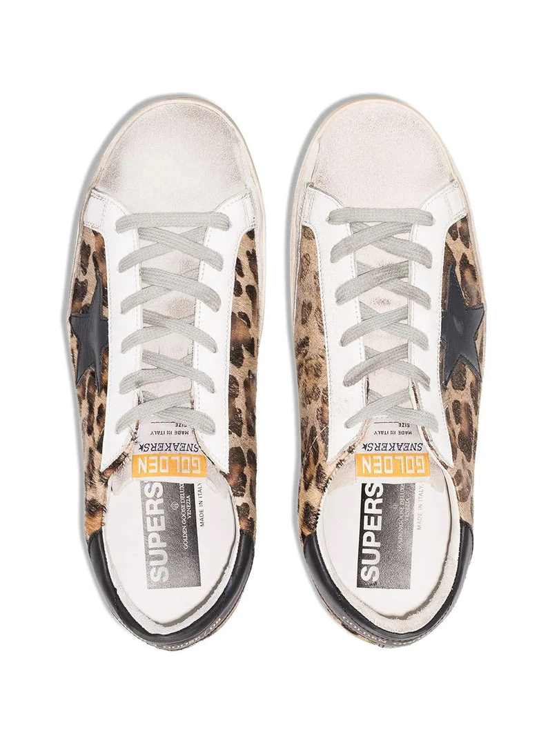 Golden Goose ‘Super-Star’ leopard low top sneakers featuring a round toe, a front lace-up fastening, a suede branded tongue, a signature black star design on the side, a gold embossed branded logo on the heel, a faux leopard print fur design and distressed signature detailing. Item fits true to size. Italian Sizing. Made in Italy.