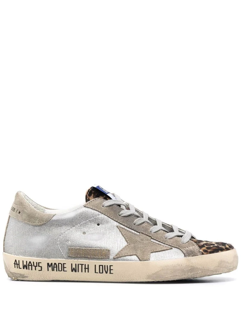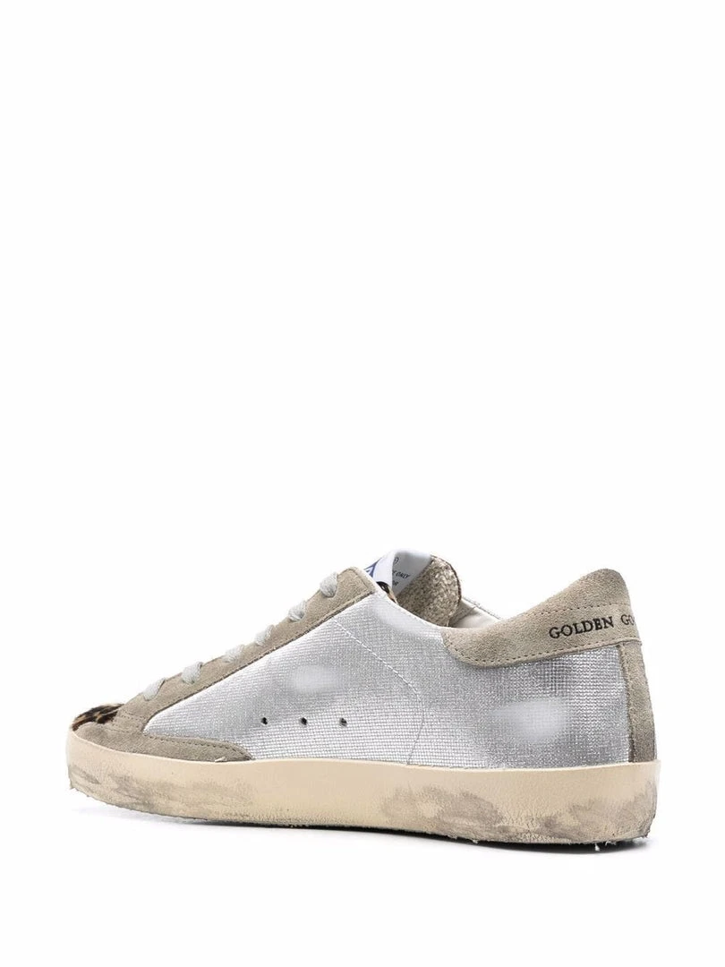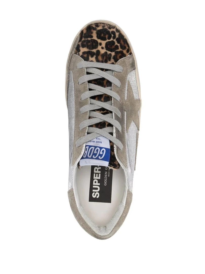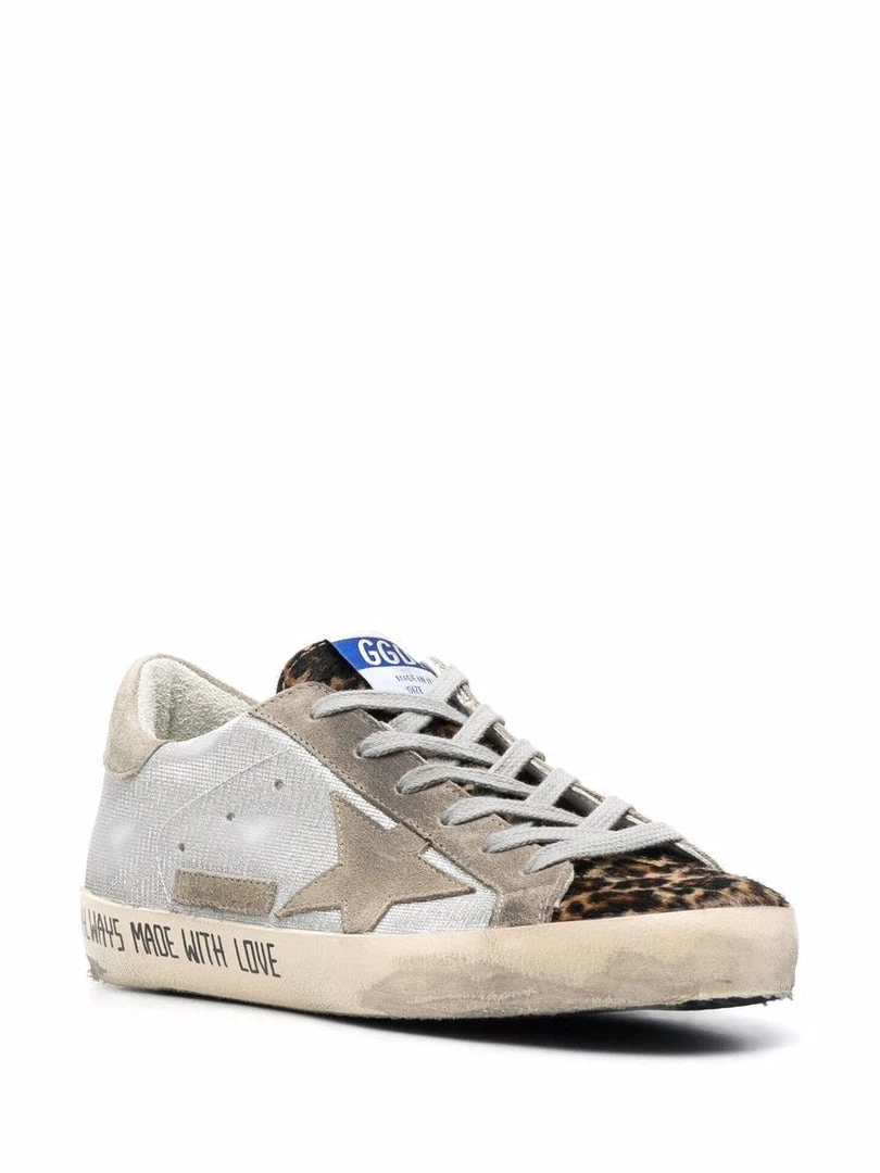 Golden Goose ‘Super-Star’ silver leopard tongue sneakers featuring a round toe, a grey front lace-up fastening, a leopard print fur tongue, a grey suede signature star patch on the side, a suede heel counter, a silver glitter square print, a distressed slogan sole and a low top style. Item fits true to size. Italian Sizing. Made in Italy.