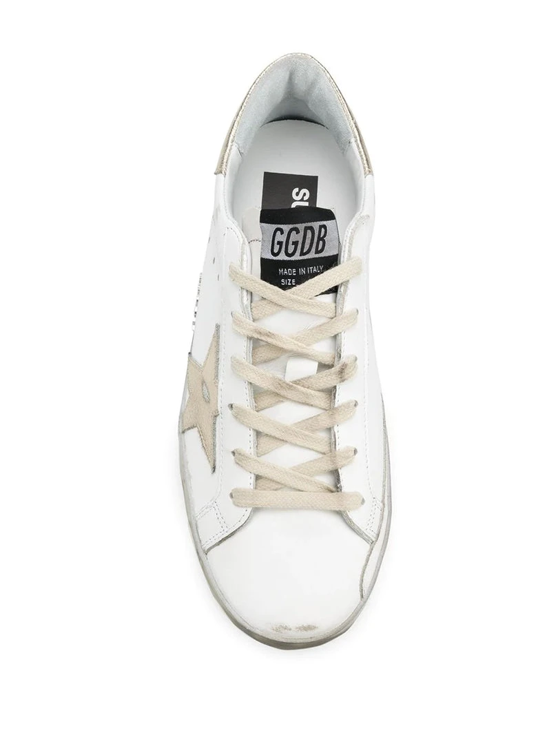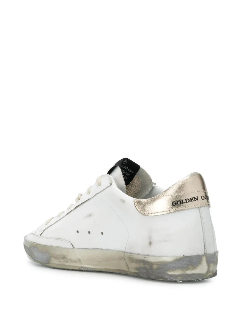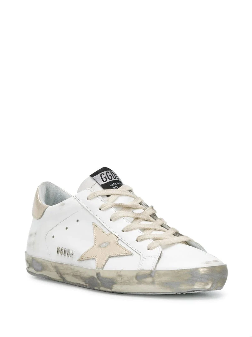 Golden Goose white leather ‘Superstar Low-Top Sneakers’ featuring a round toe, a lace up fastening, a branded tongue and insole, a logo detail to the side and a signature star design, a distressed finish and a contrasting metallic star, heel counter at rear and sole. Item fits true to size. Italian sizing. Made in Italy.
