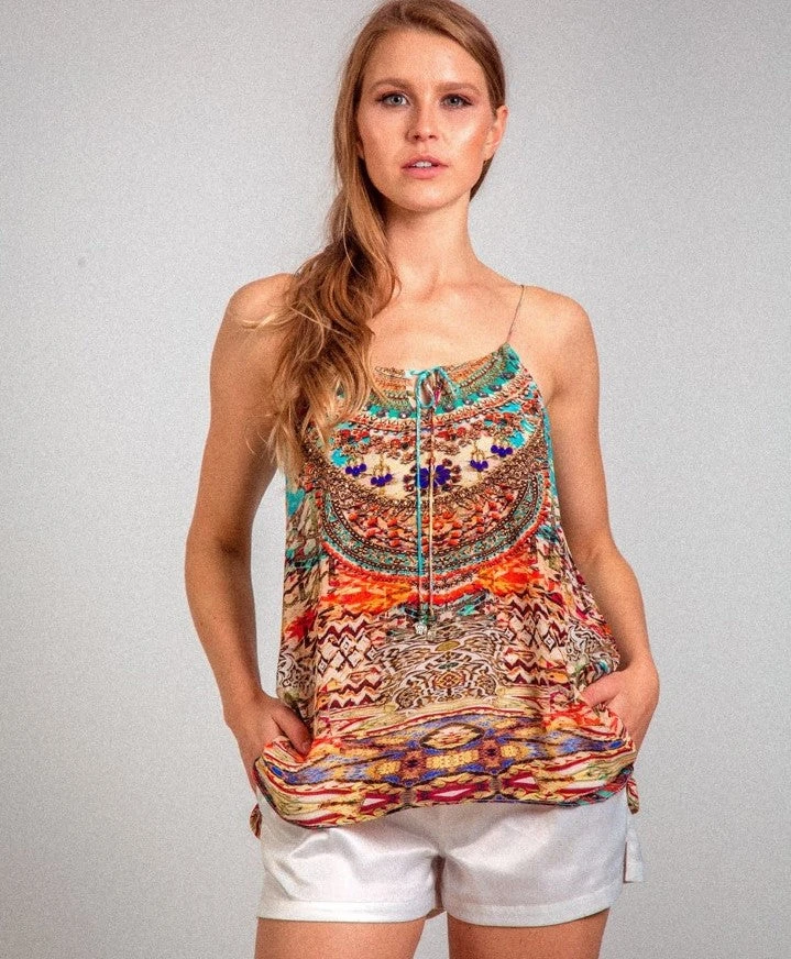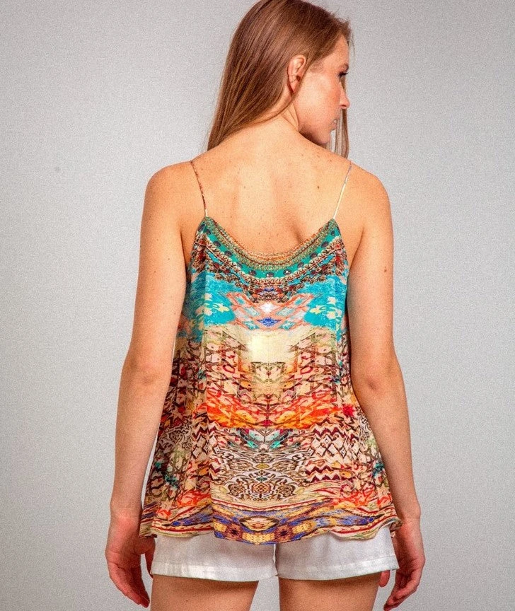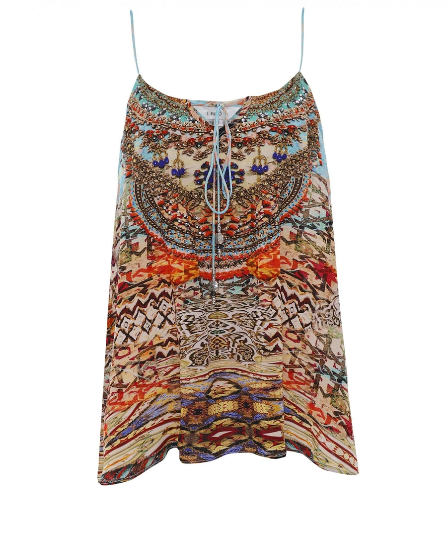 INOA Arizona ‘Shoe String Cami’ featuring thin straps, a tie front fastening, a multicoloured print with gem detailing, a pull on style and a relaxed fit. Item fits true to size.