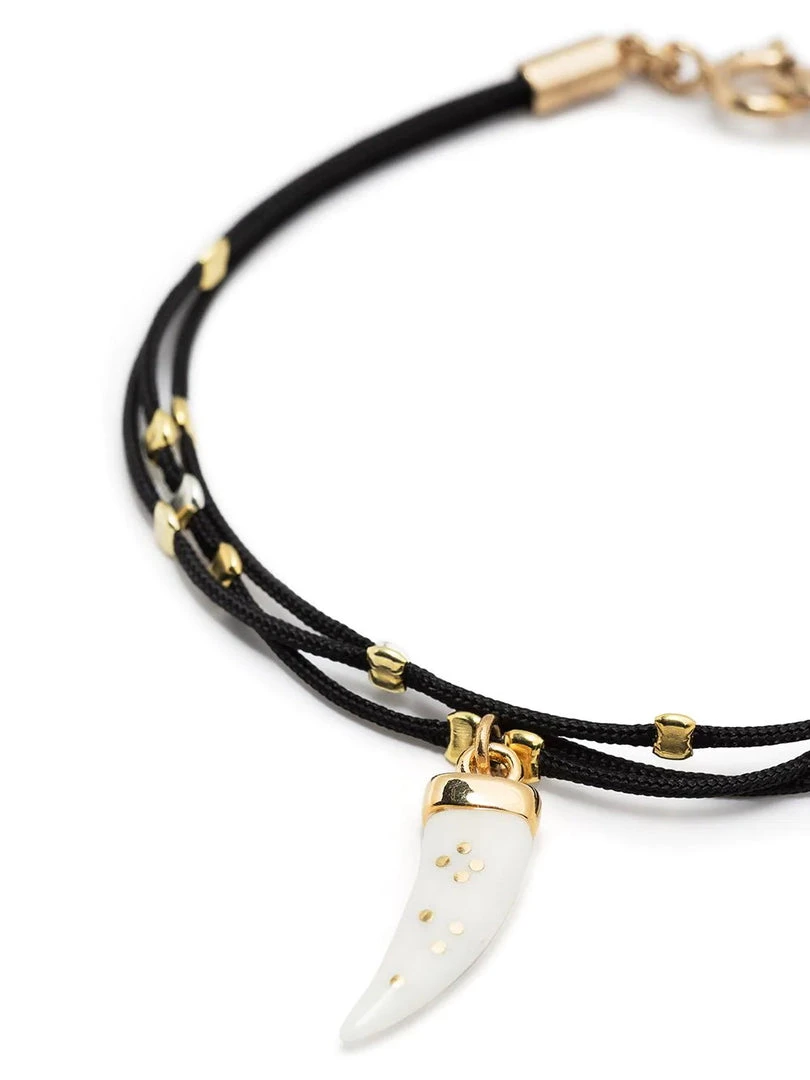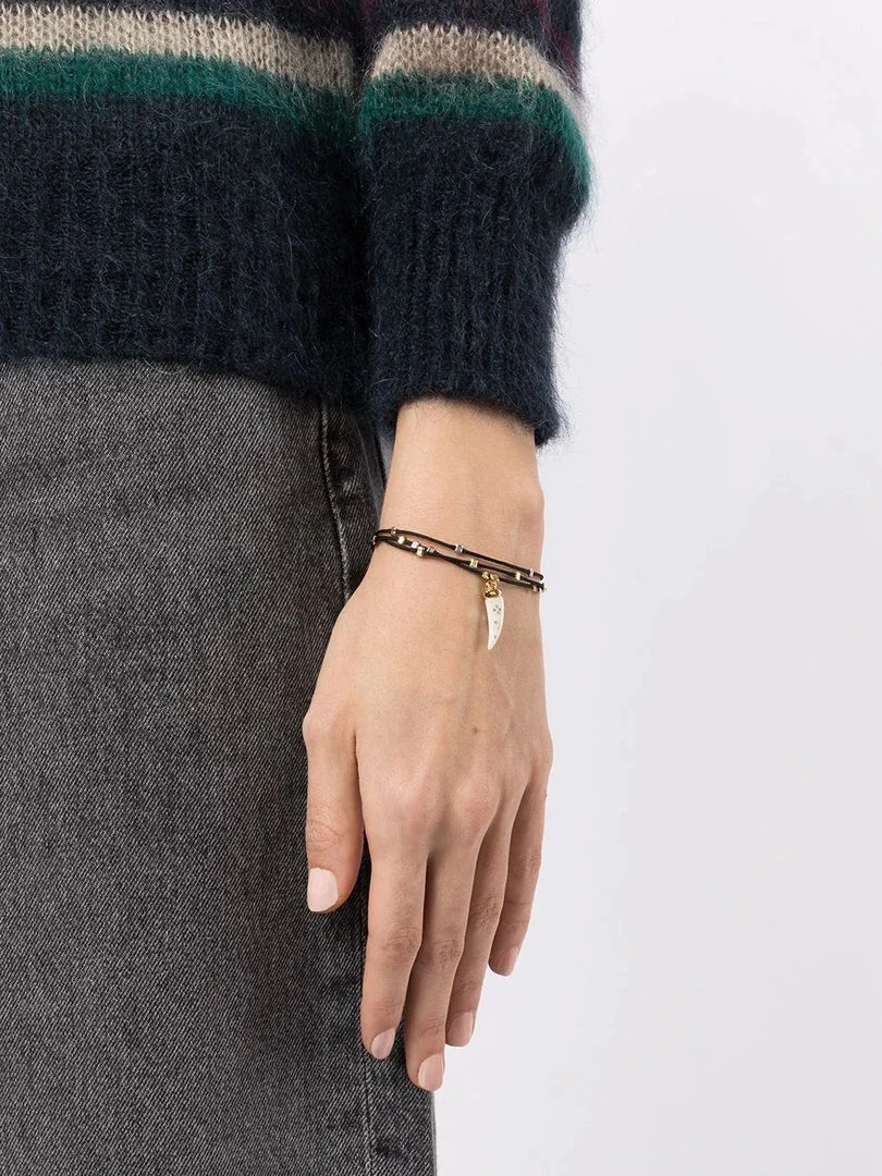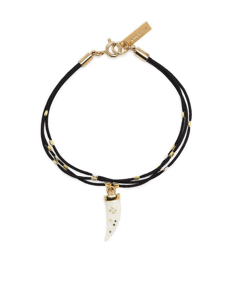 Isabel Marant ‘Shiny Aimable Bracelet’ featuring a spring ring fastening, a multi string chain, silver and gold tone stud details, a buffalo bone horn pendant and gold tone hardware. Item is One Size. Made in Poland.Â